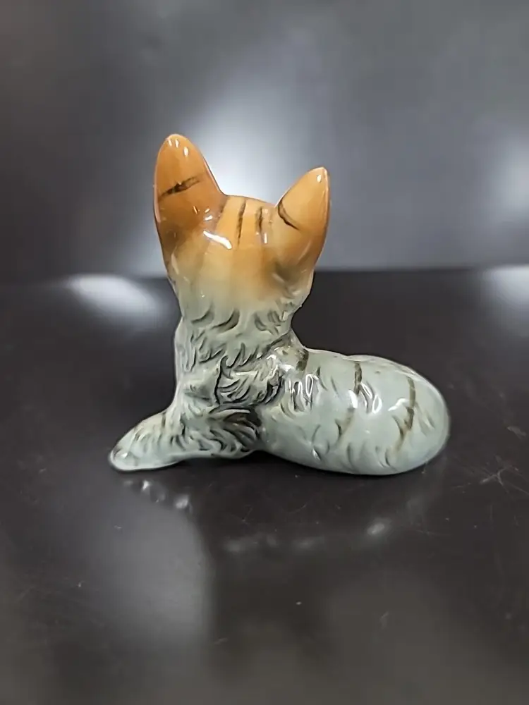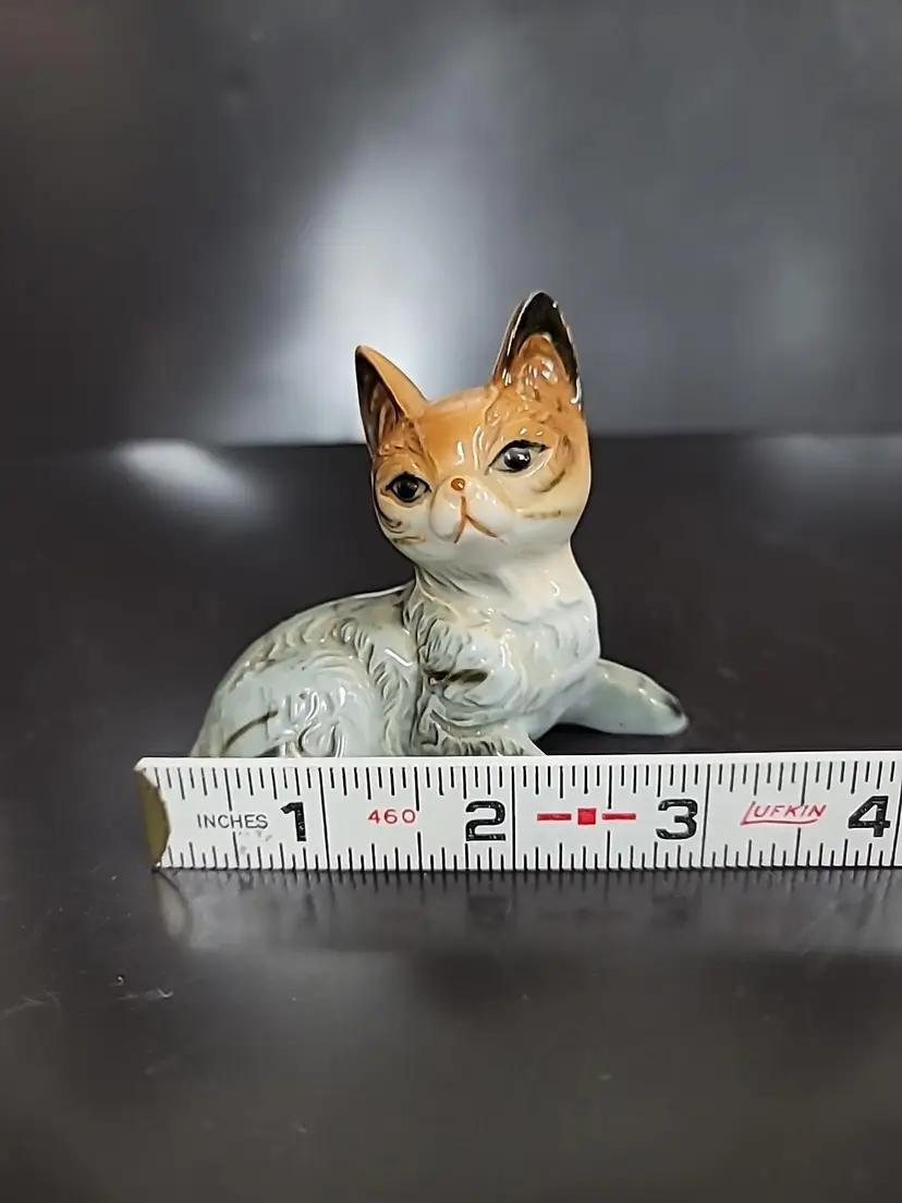 Vintage brown and gray striped tabby cat figurine. Made of porcelain, laying down. Very good condition, no chips or cracks. It measures approximately 3" x 3" x 2"