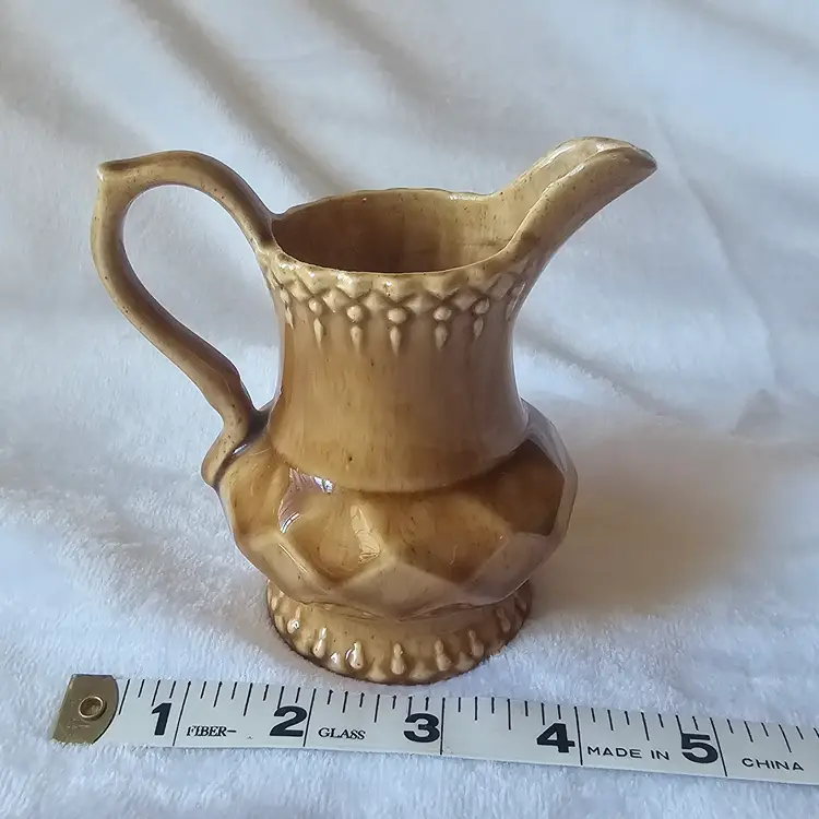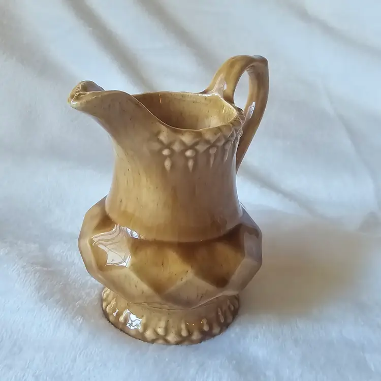 Charming vintage ceramic pitcher/creamer featuring a warm golden & brown speckled glaze with a glossy finish. The body has a faceted, almost geometric midsection with a scalloped foot and raised bead-like details around the rim. A classic mid-century style piece that works as a creamer, syrup server, or simply as a decorative accent.
