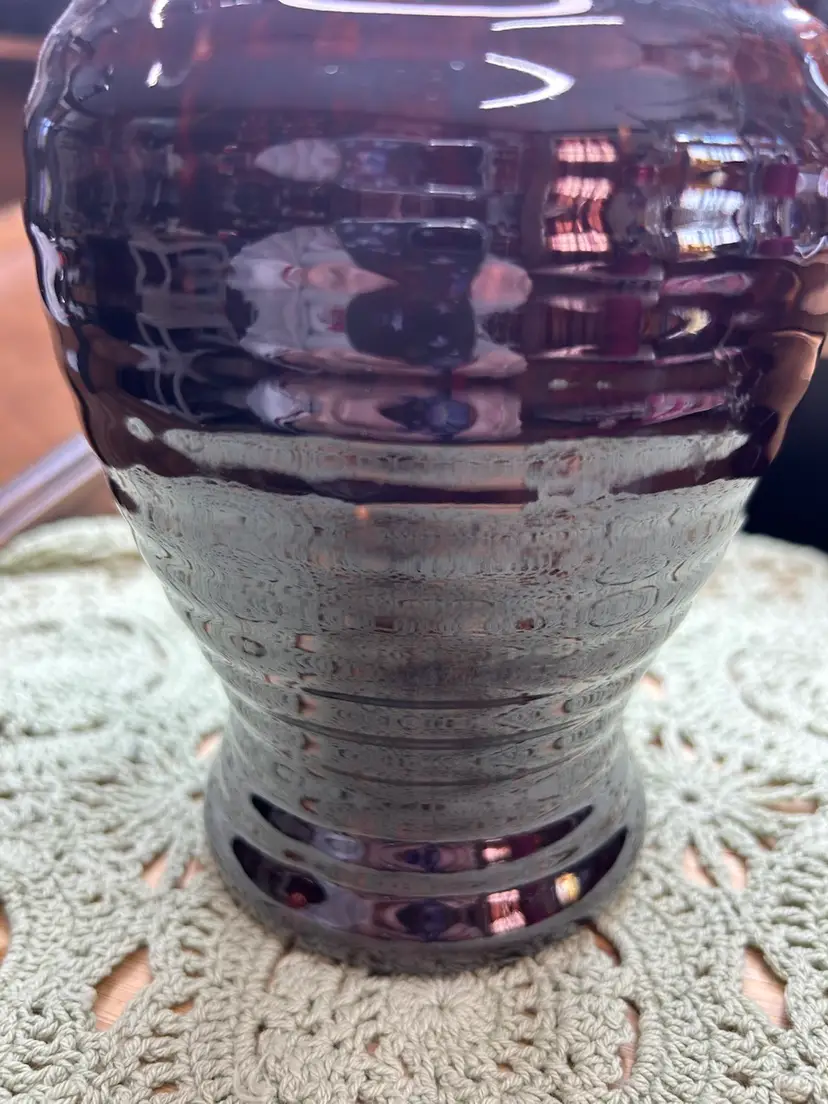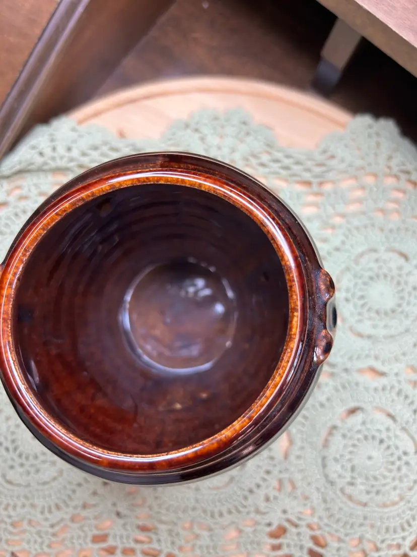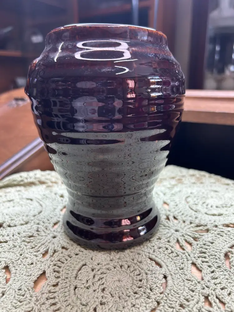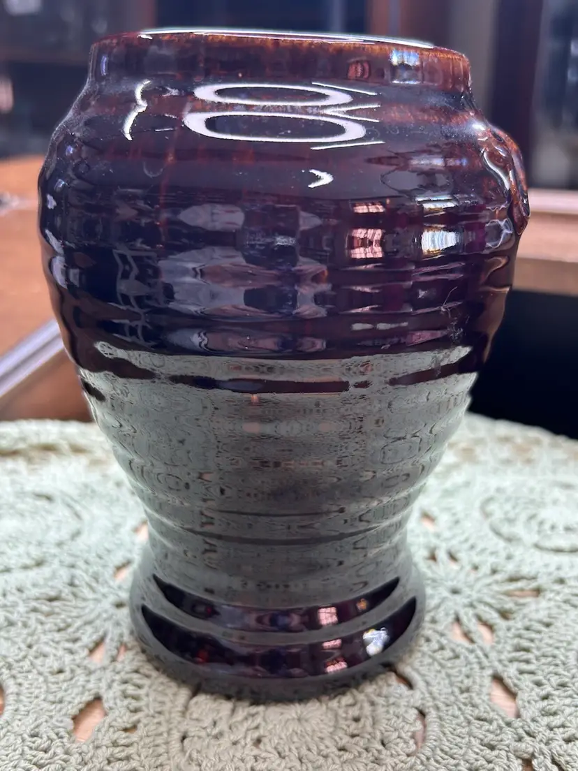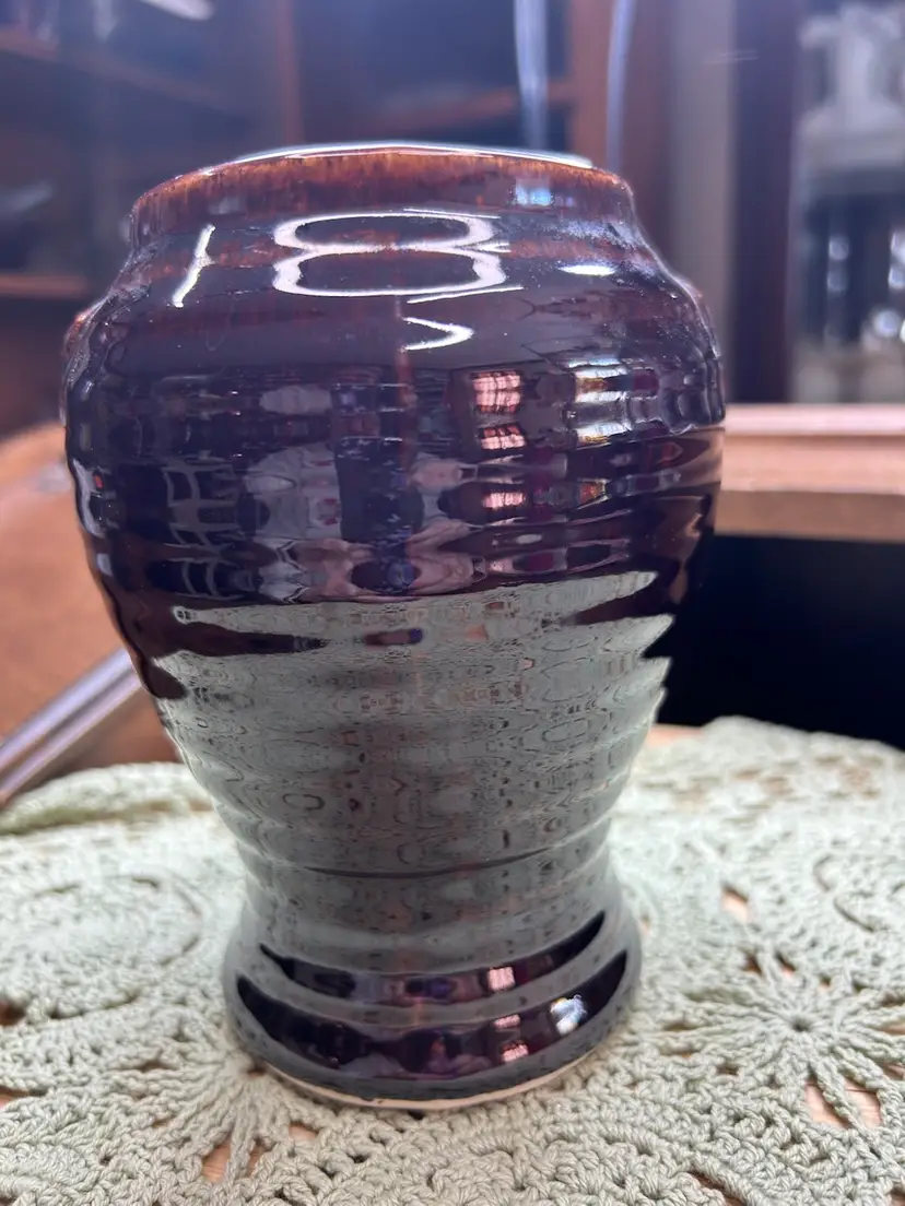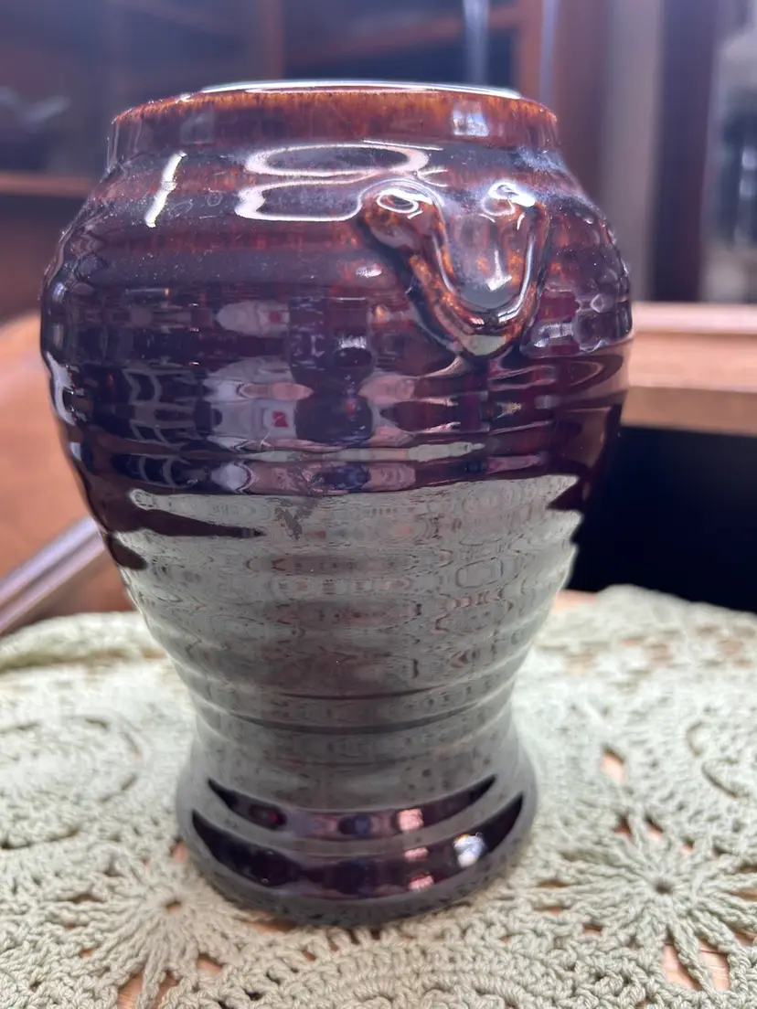 Excellent condition with no chips or cracks. The vase is 6 1/4" tall x 5" at it's widest area and 3 1/4" in diameter at the base. The vase has two horseshoe like molded handles on each side of the top. Minor glaze imperfections inherent in glaze and process.