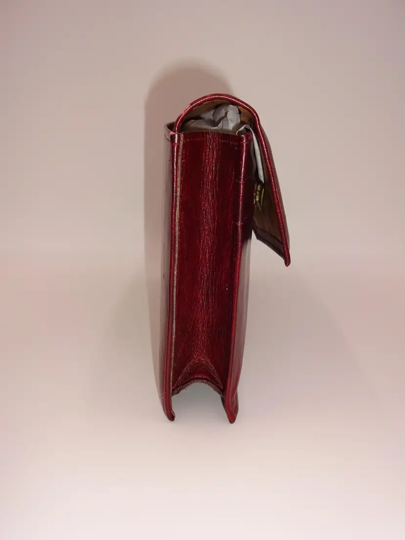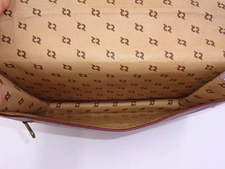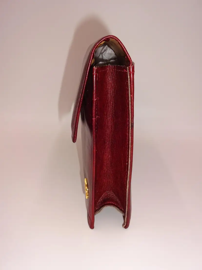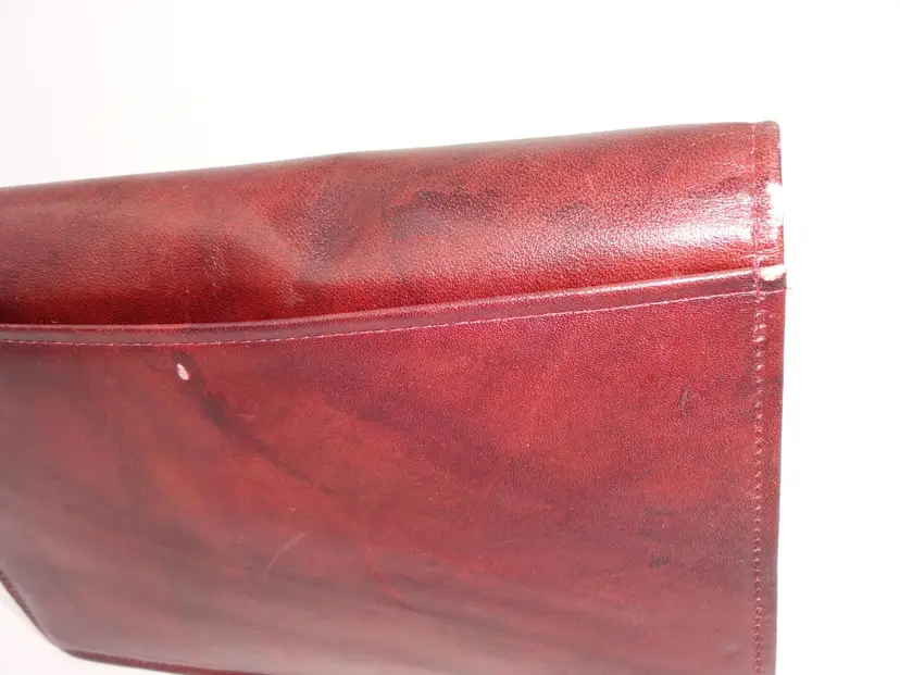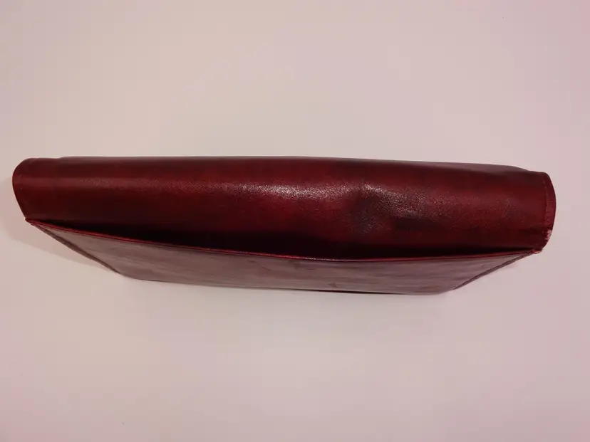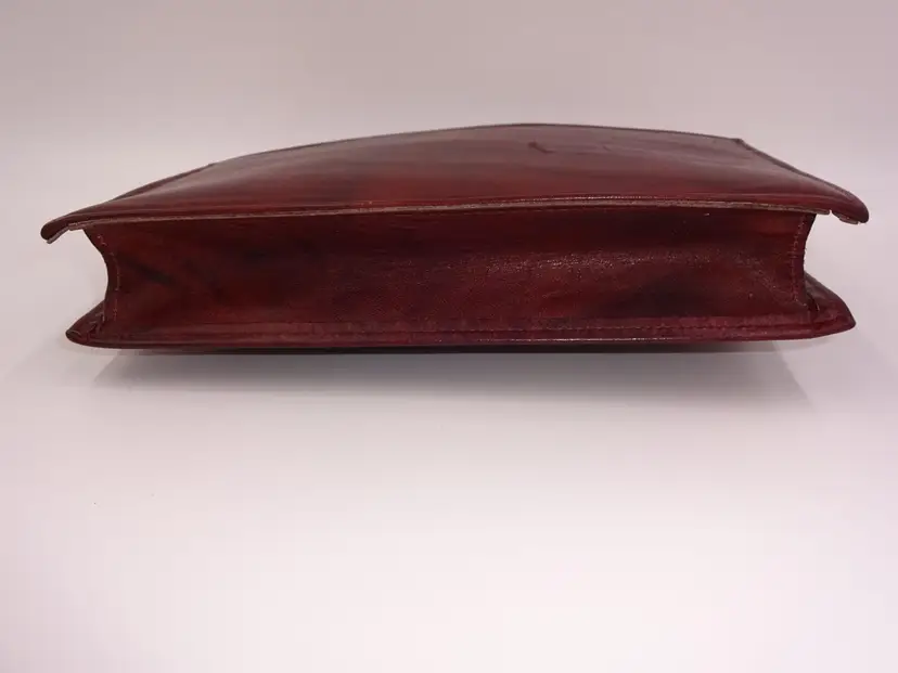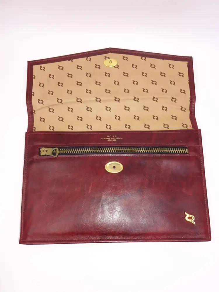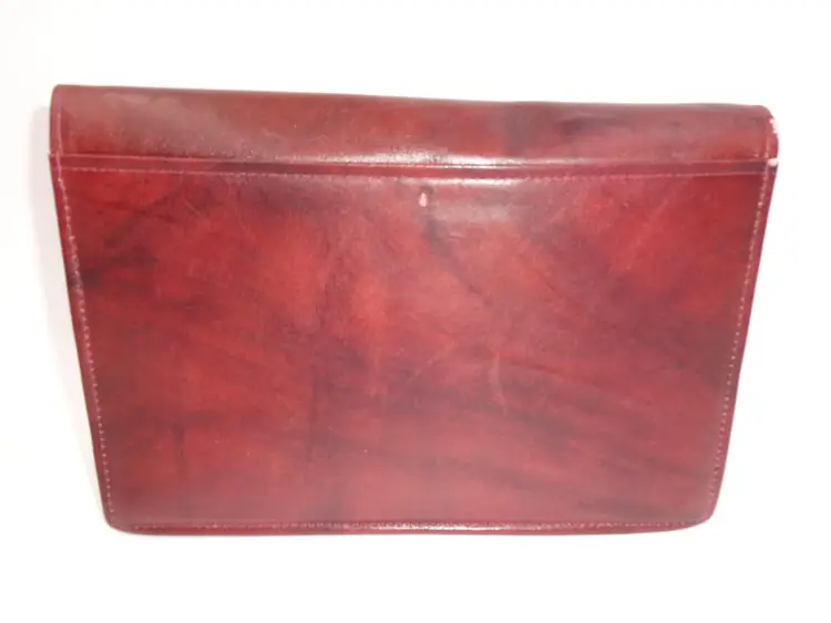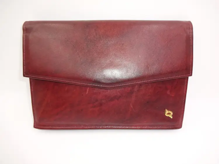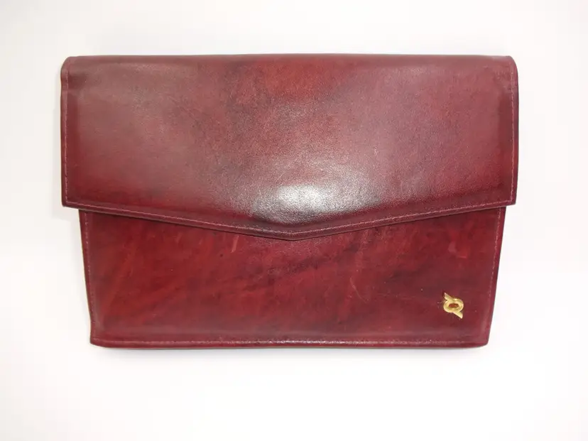 Good pre-owned condition. A reddish-brown leather, single compartment, clutch purse that closes with a snap and has gold tone hardware. There are two compartments/pockets, one on the outside and one on the inside that zips. Purse is lined. It measures approximately 9" x 6-1/4 to 3/4 to 1-1/2". Scuffs/marks consistent with age/use.
