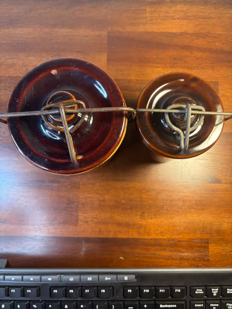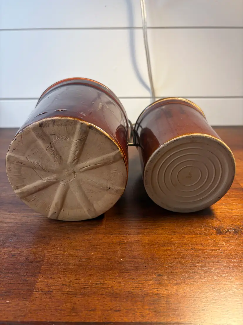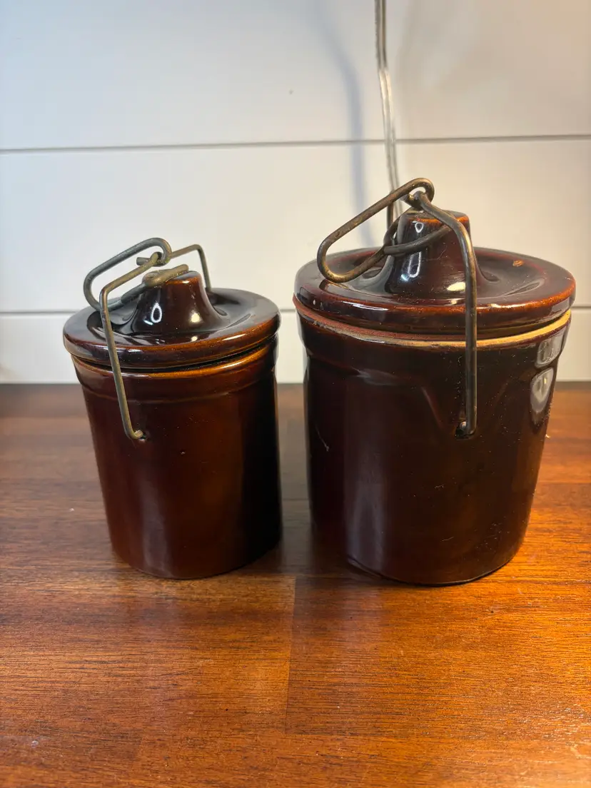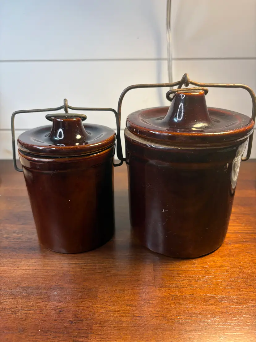 Set of two charming brown stoneware crocks with metal lid handles. Perfect for adding a rustic touch to your kitchen decor. The crocks are 6- and 5-inches tall and 4 and 3 inches in diameter. Although there are some rough places in the glaze, there are no chips or cracks.