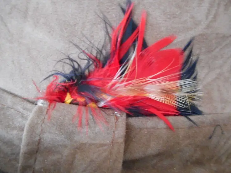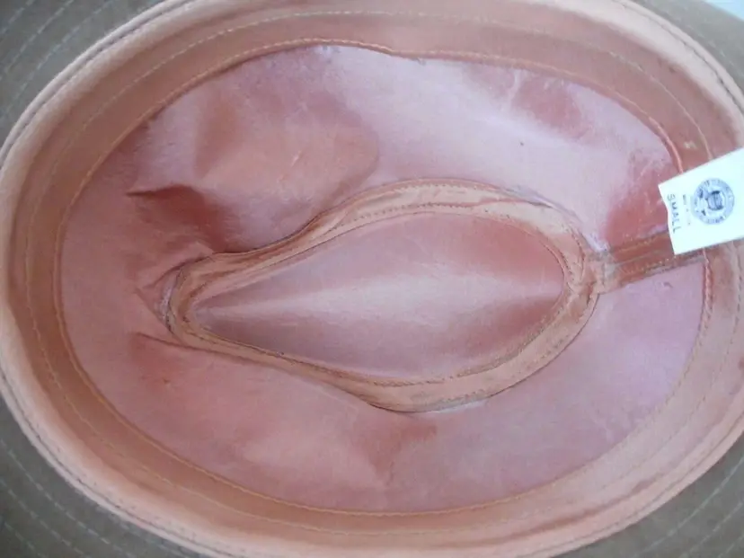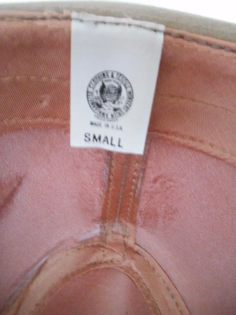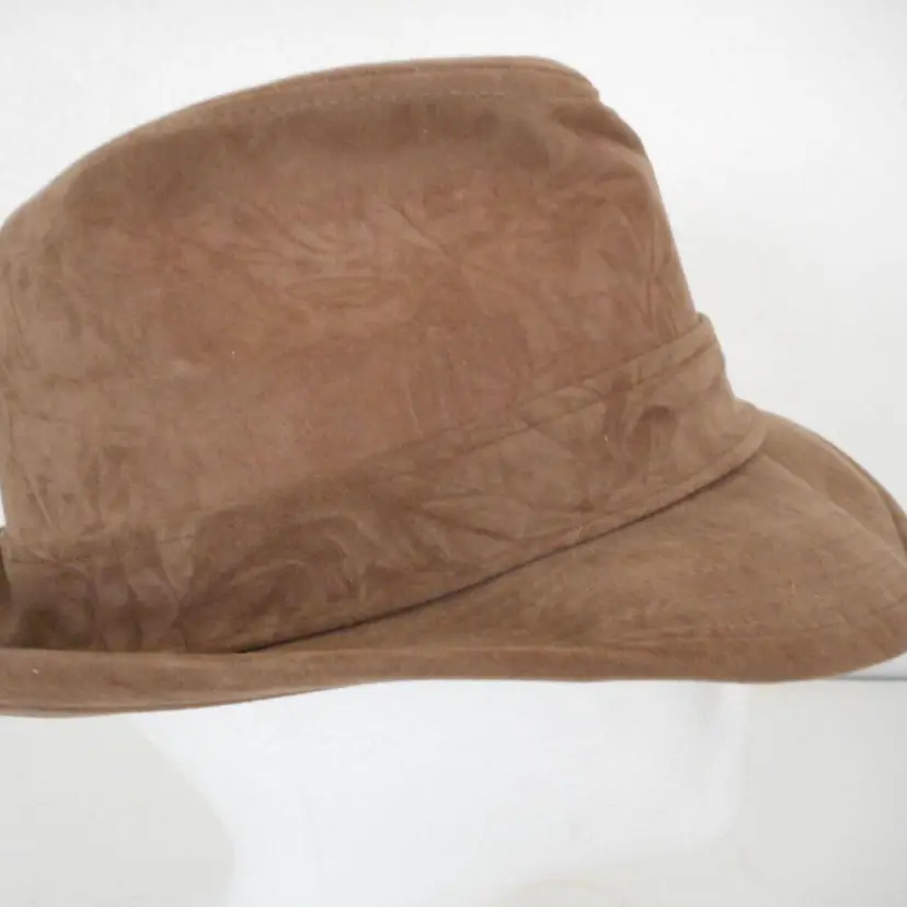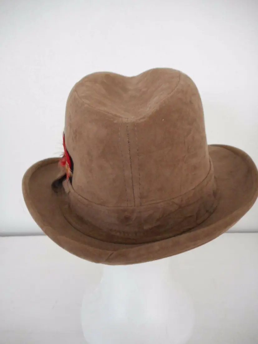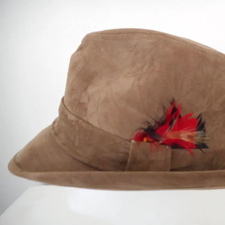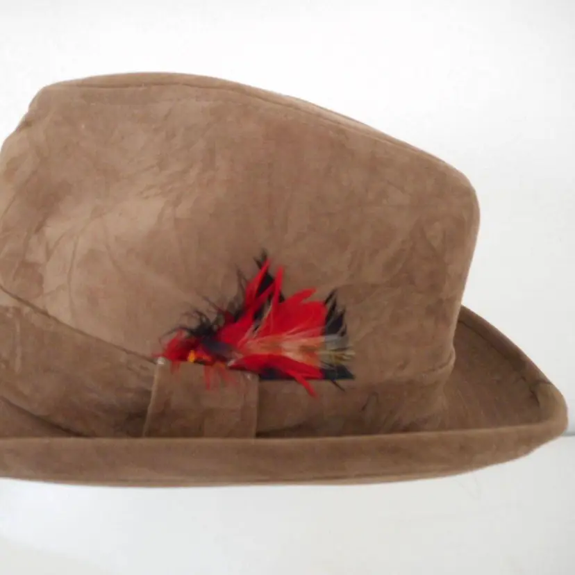 This is a really nice faux suede hat. I think its a fedora style. Light brown with red feather accent