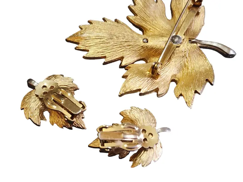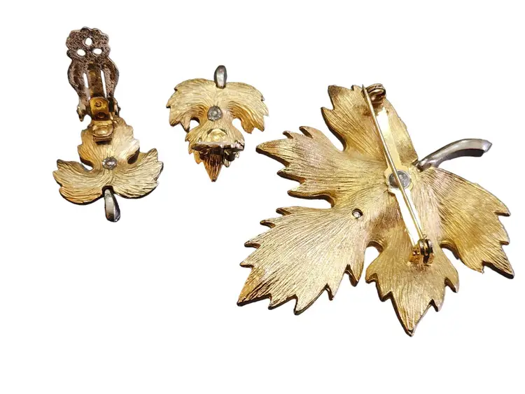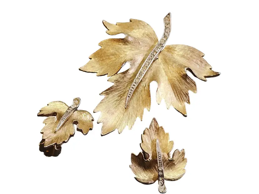 Vintage Brushed Matte Gold And Rhinestone Leaf Brooch And Earrings Set (A6191)