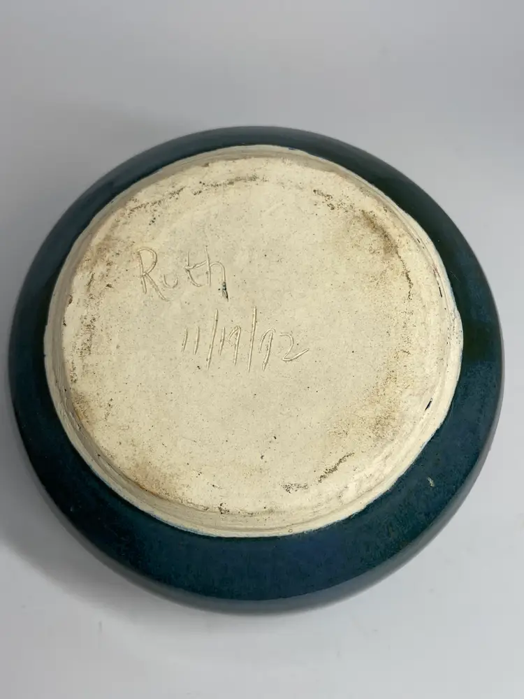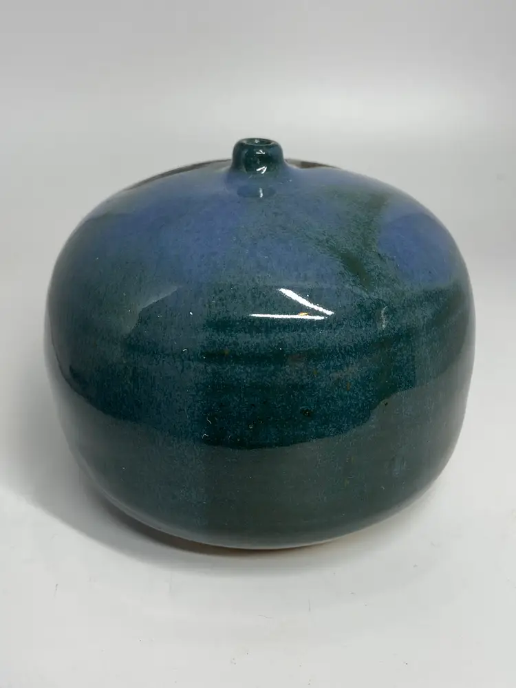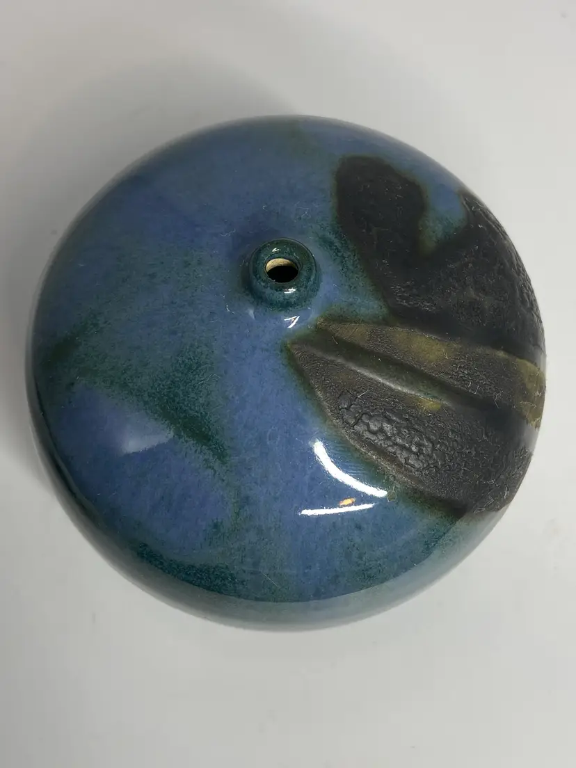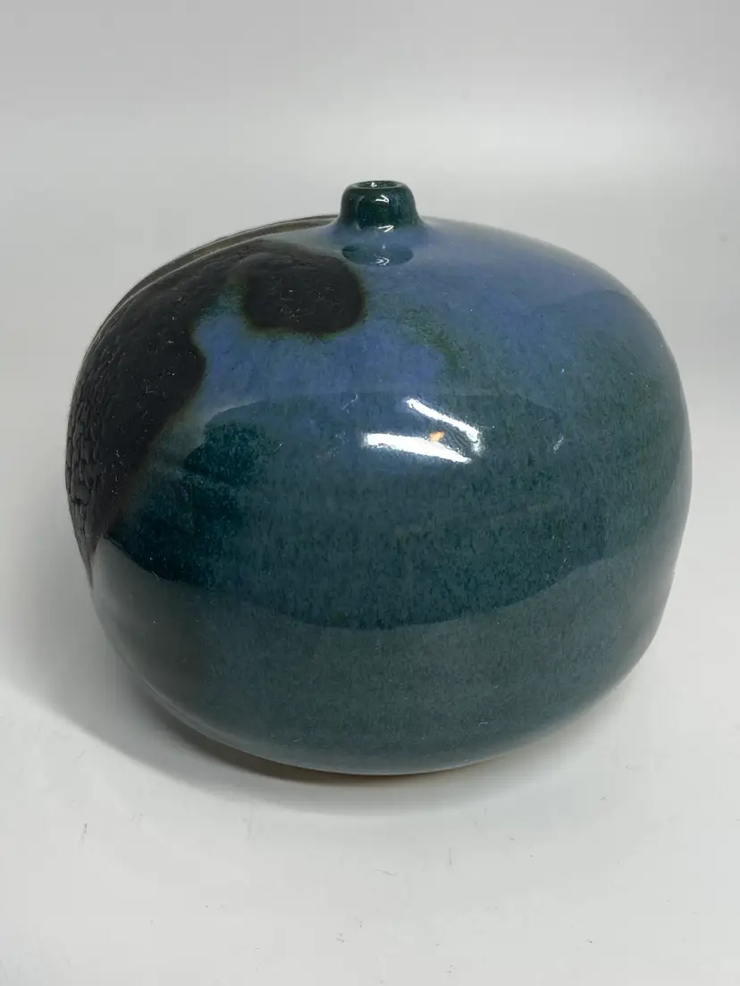 This item is a collectible vintage studio pottery vase featuring a squat, orb-like form and a dark drip glaze over a blue base, resembling brutalist or midcentury design. Material: Stoneware ceramic. Style: Studio pottery, likely sculptural or brutalist. Color Palette: Deep blues with black or dark brown abstract accents. Distinctive Feature: A small, narrow mouth on a rounded, low-profile body.