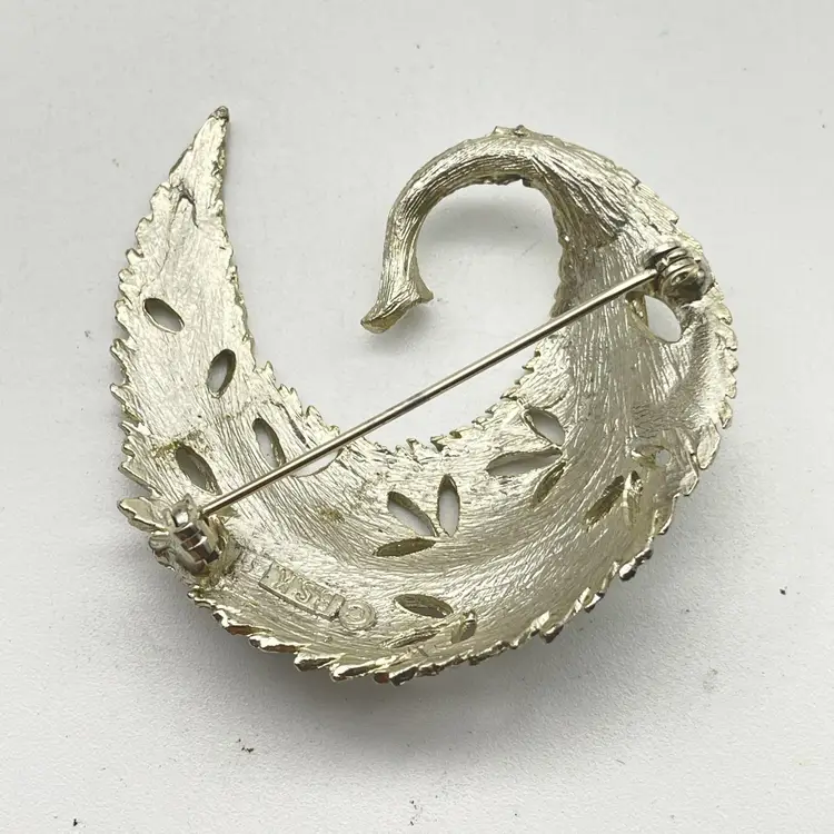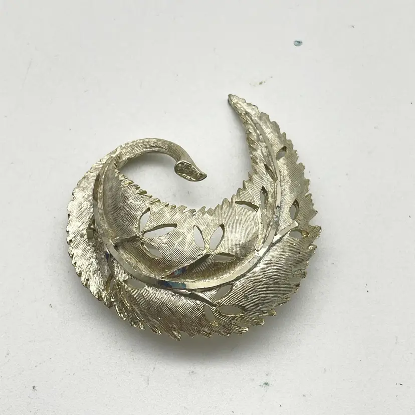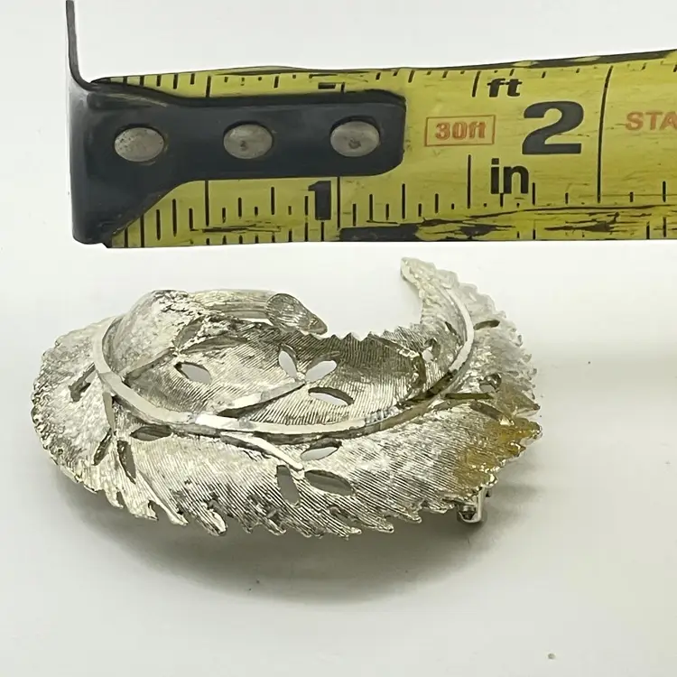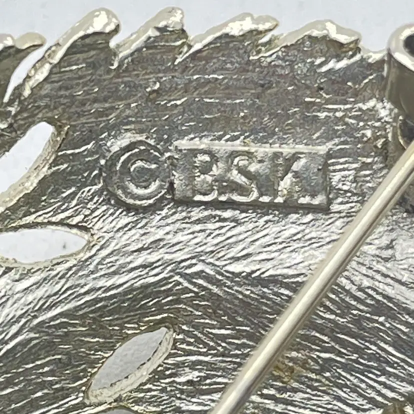 Features a silver tone finish with a detailed textured leaf and openwork design Back is stamped with the BSK copyright logo Secures with a working rollover clasp Measures approximately 2 inches across at the widest point (see photo for reference) Era: Likely 1950s-1960s costume jewelry No missing or damaged areas, ready to wear or gift