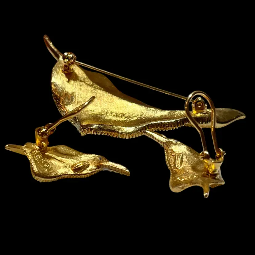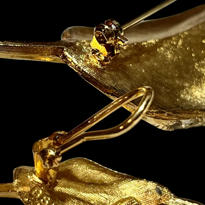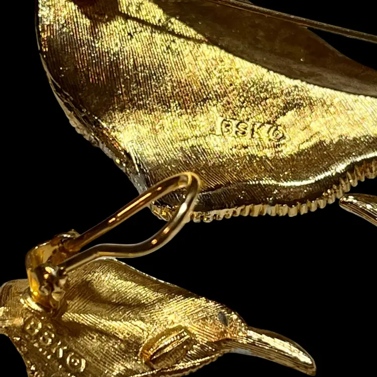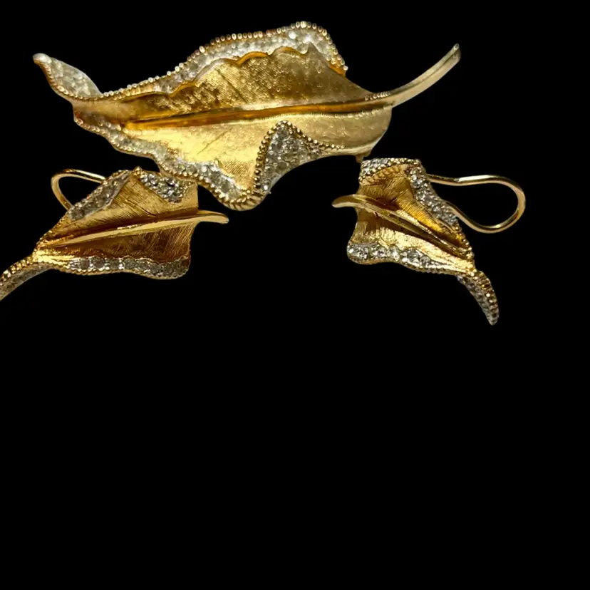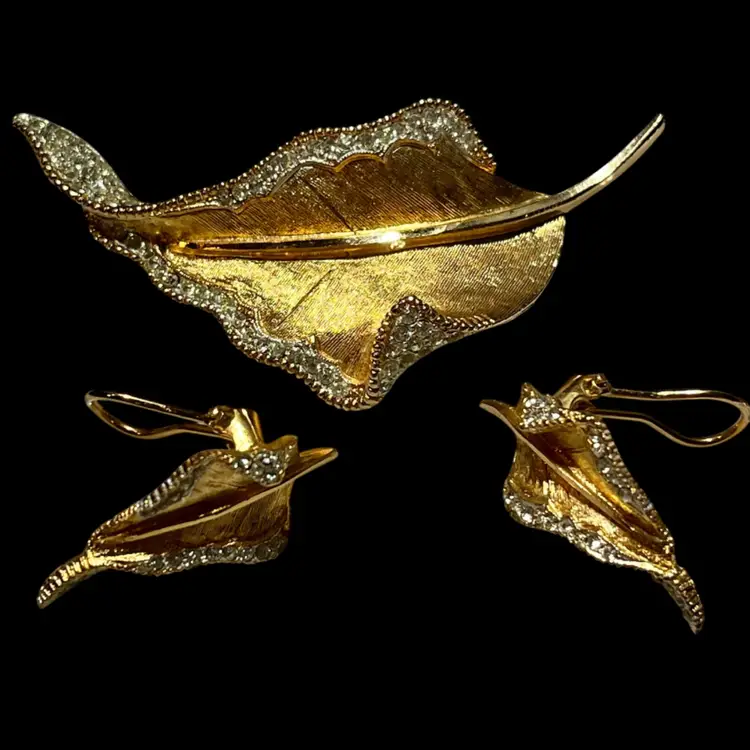 This matching set features a gracefully curved leaf design, meticulously crafted with a textured, brushed gold-tone finish that perfectly mimics the organic veins of a natural leaf. • Design Details: The brooch and matching earrings are bordered by a shimmering row of clear, pavé-set rhinestones, adding just the right amount of sparkle to the warm gold tones. • The Maker: BSK (founded by Benny, Maurice, and Klein) was a notable New York City jewelry house active from the late 1940s through the 1980s. They were highly regarded for their high-quality "department store" collections, including the famous licensed line for the movie My Fair Lady. • Condition: Excellent vintage condition. The gold plating is vibrant and intact, all rhinestones are bright and original, and the hardware is in perfect working order. • Markings: Every piece in this set is clearly signed with the BSK© stamp on the back. • Measurements: * Brooch: Approx. 3" long • Earrings: Approx. 1.25" long Whether you're a seasoned collector of signed costume jewelry or looking for a sophisticated gift, this set is a classic example of quality 1950s/60s American design.