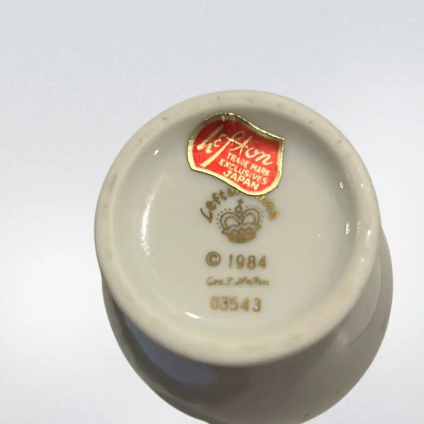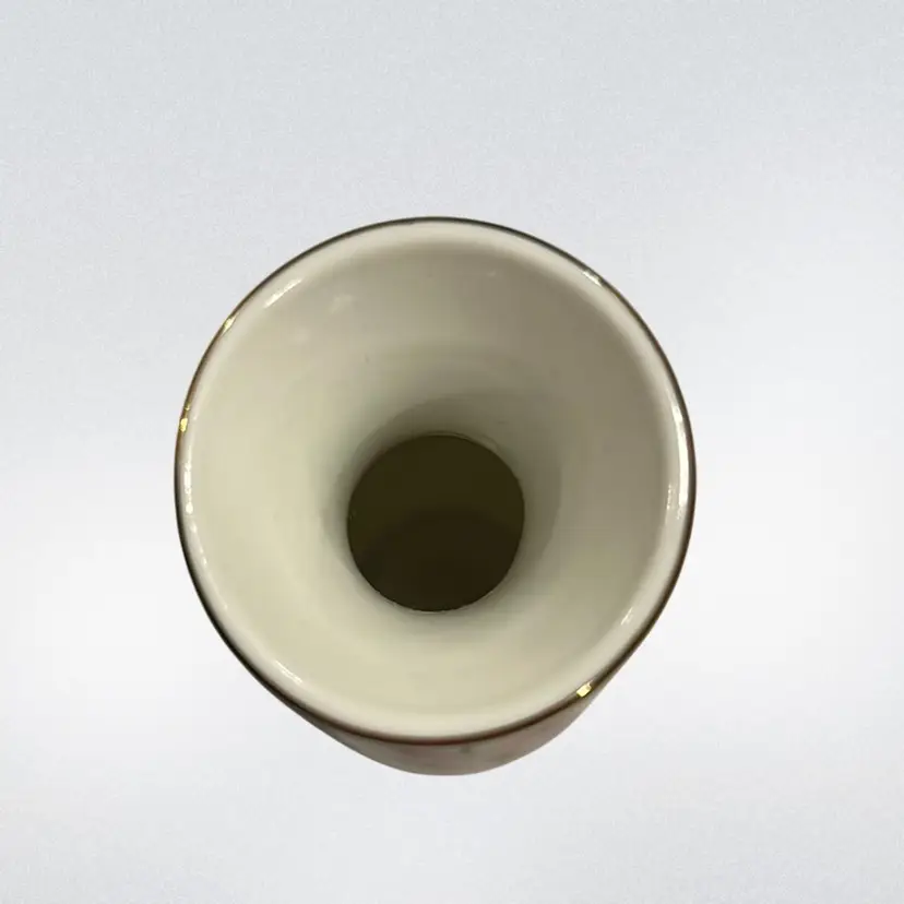 This vintage vase is a left in China peas featuring a delicate floral design. It is a small bed vase idea for single stems with soft pastel collars and intricate detailing. The piece is 7 1/2 inches tall and one and three-quarter inches at the opening there are no chips or cracks