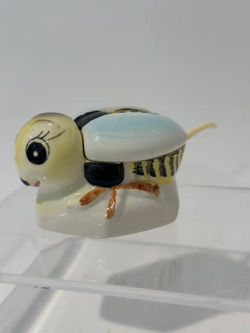 This set of two vintage ceramic honey pots with lids and spoons is a must-have for any bee enthusiast. The hand-painted design features a charming bumble bee design, making it a great addition to any collection. Made in Japan, these pots are of high quality and are perfect for storing your favorite honey. Whether you're a collector or just looking for a unique kitchen accessory, this set is sure to impress.