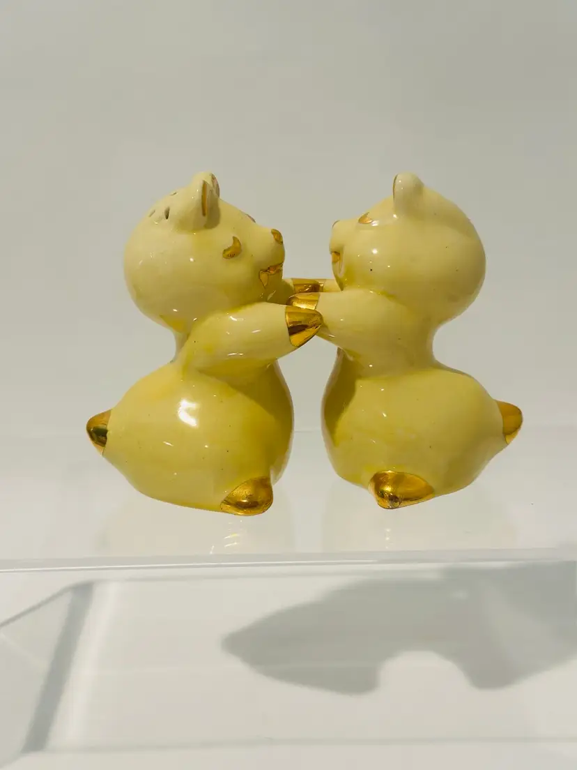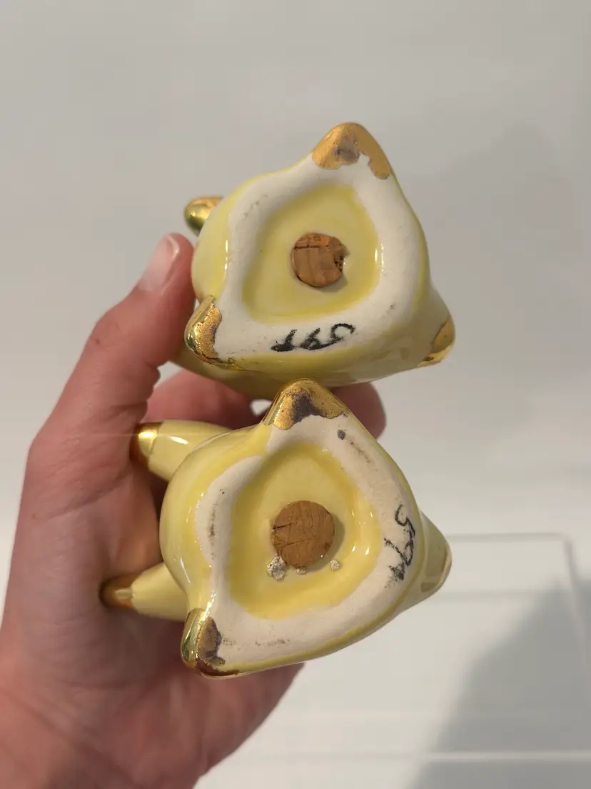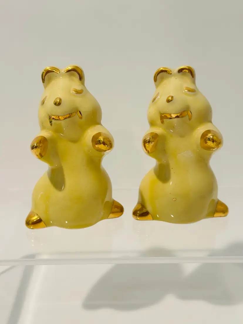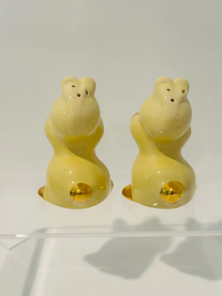 Spice up your collection with these vintage ceramic bunny HUGGER salt and pepper shakers. The yellow and gold shakers are perfect for all occasions and add a touch of whimsy to your kitchen decor.