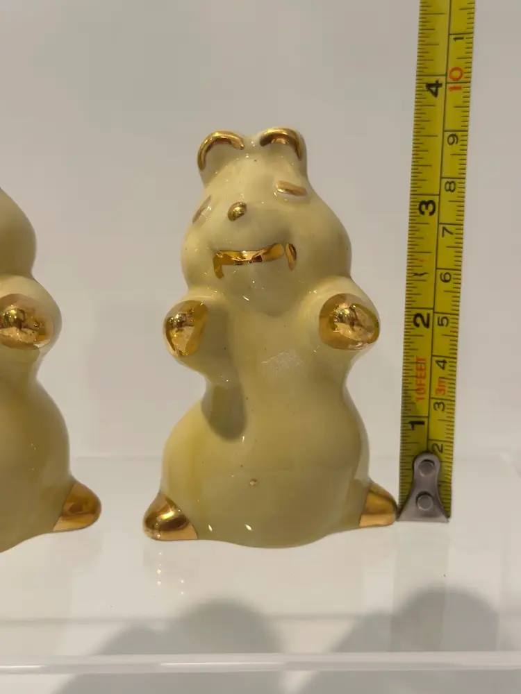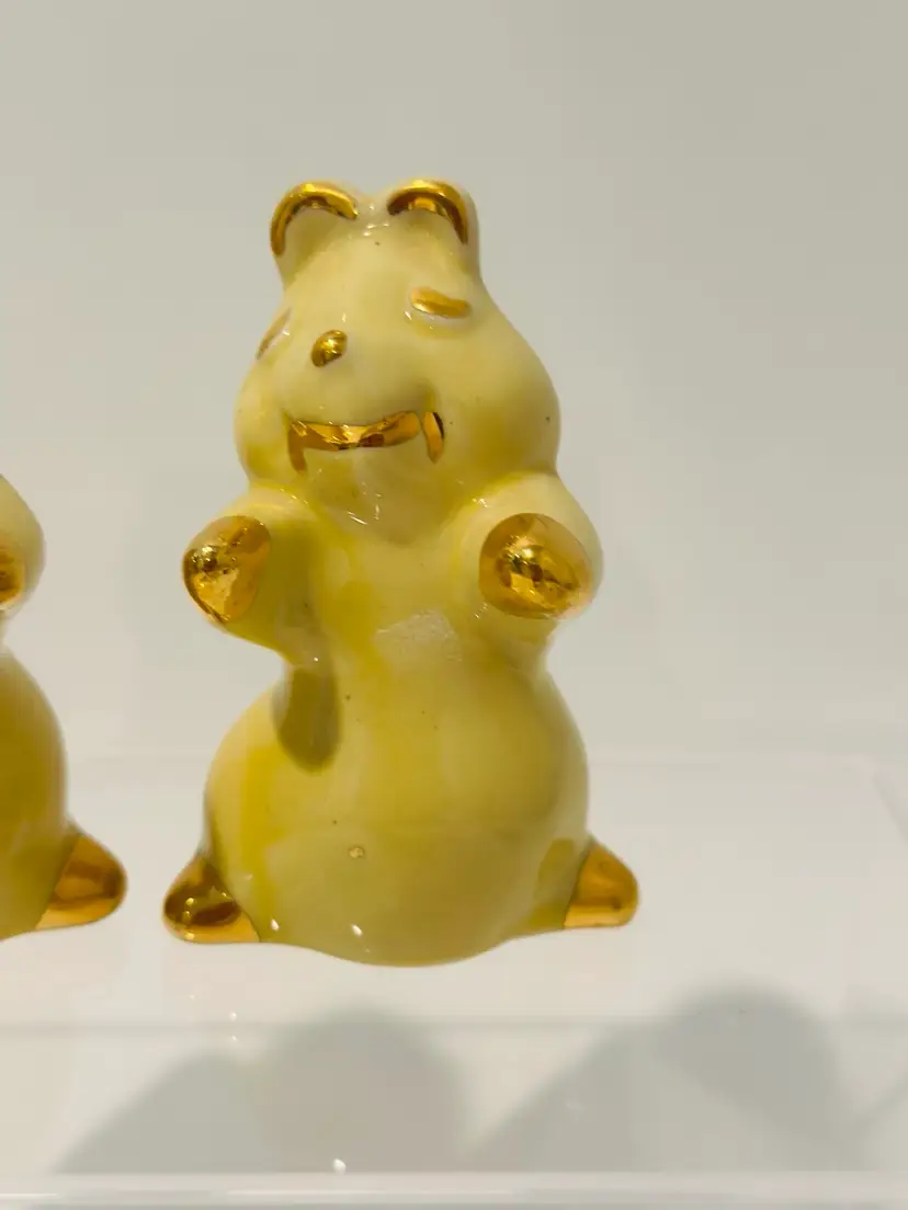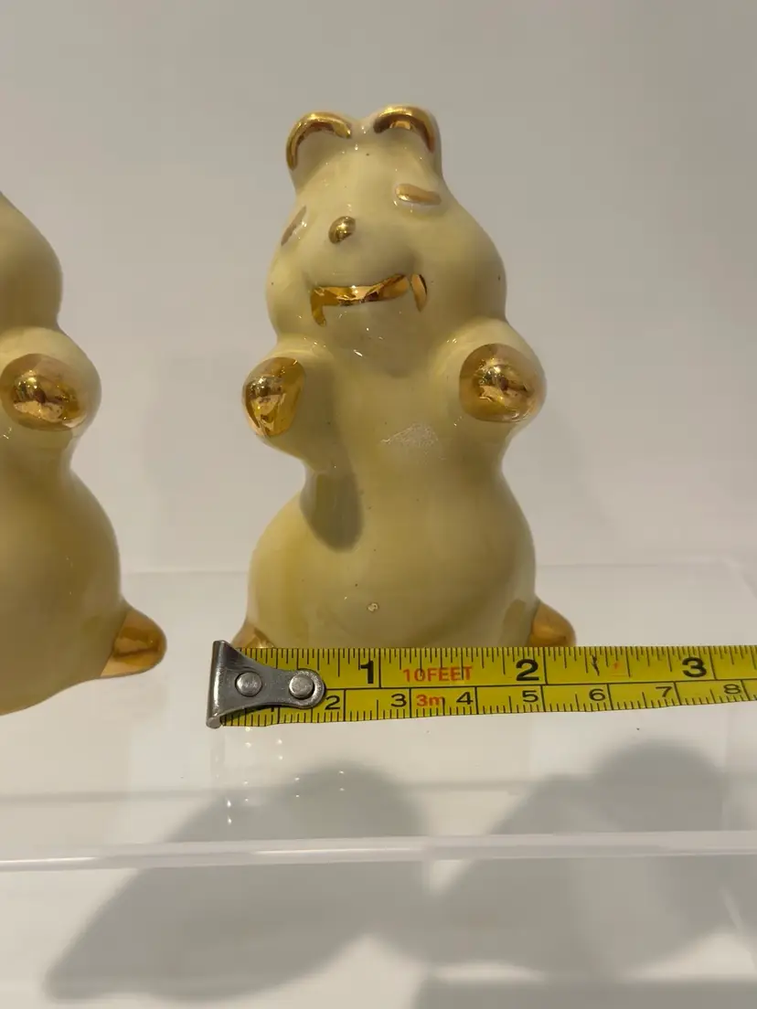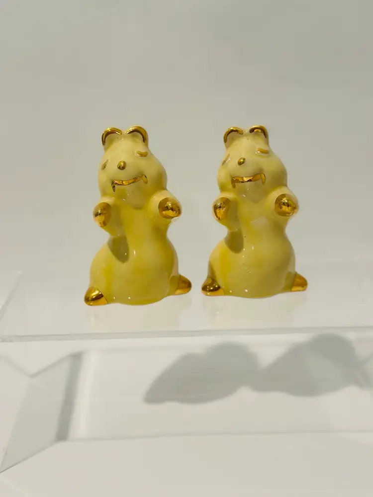 Spice up your collection with these vintage ceramic bunny HUGGER salt and pepper shakers. The yellow and gold shakers are perfect for all occasions and add a touch of whimsy to your kitchen decor.
