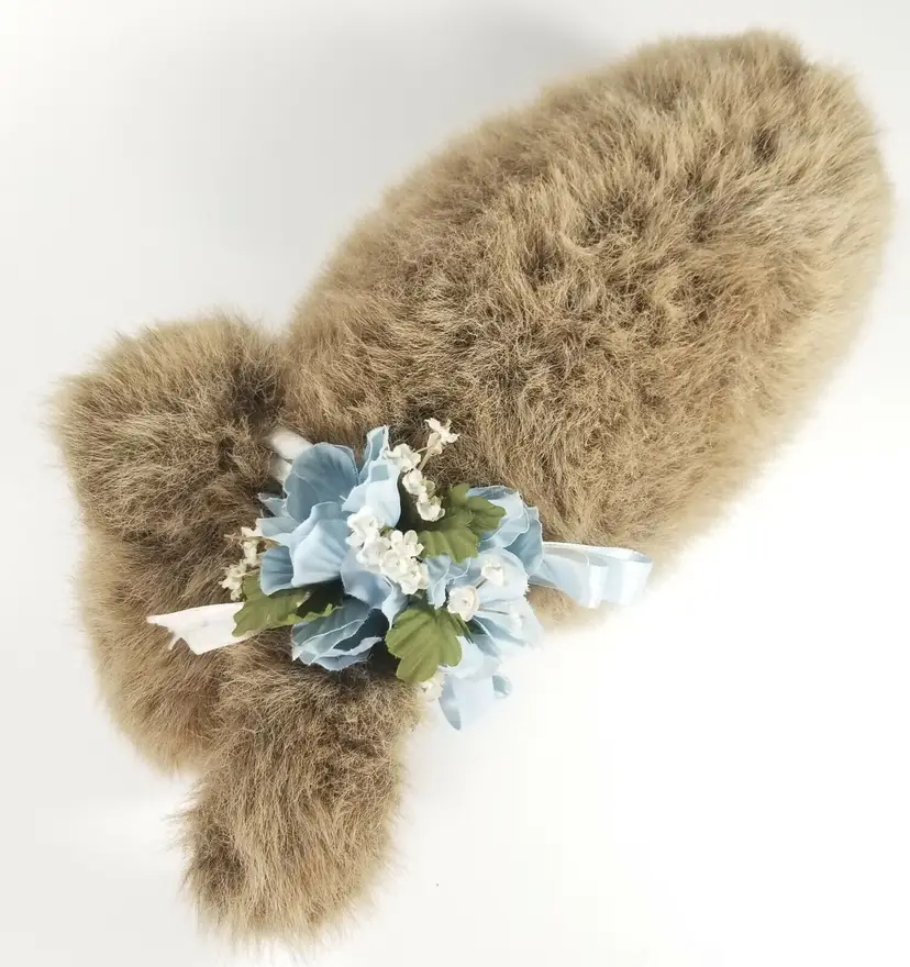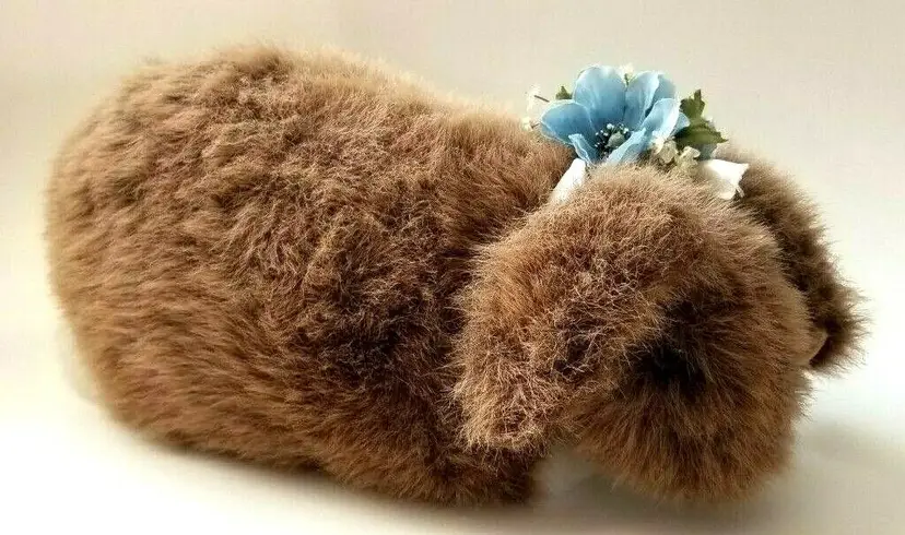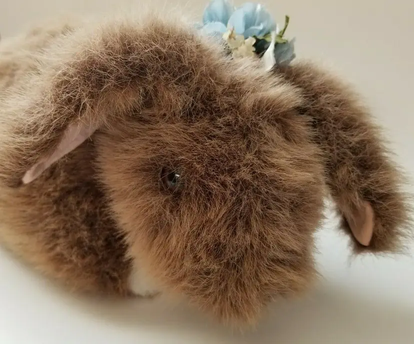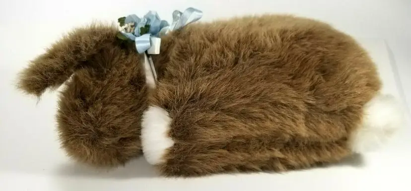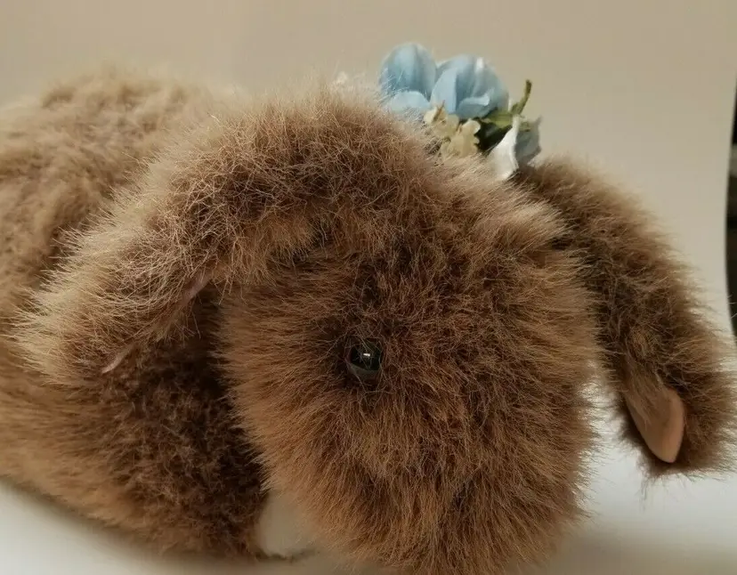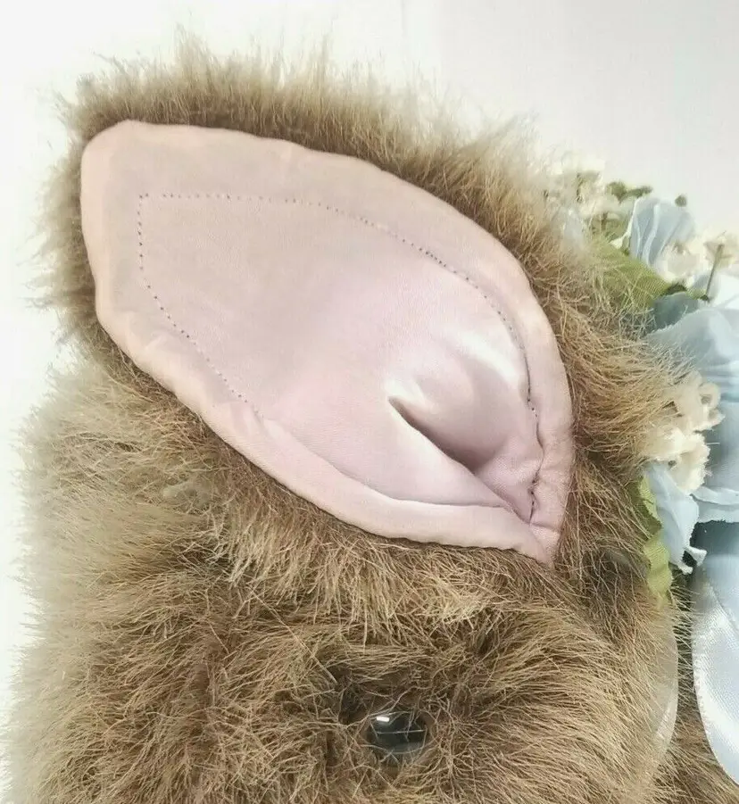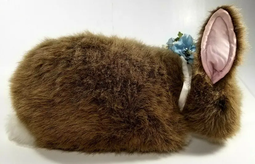 This vintage hand made stuffed bunny with a very endearing face is in nice vintage condition. She was made for a charity cause and the evidence of it being hand made shows in the pink inside ear piece being hand top stitched, please see photo. Bunny is 16 inches long and 7 inches high and 7 inches wide. She is of a more softly stiff fur and sits flat on the surface. She is quite firmly stuffed, meant more of an ornamental rather than a soft "squishy" piece. The bunny is laying flat with no actual legs. There is a white patch on her chest and a white bunny tail. Please see last photo showing the bottom view. This is a very special bunny made at the time with love for a special cause! Love her very vintage florals! – Returns Accepted: Returns Accepted – Size: Medium (14-24 in) – Modified Item: No – Year: unknown – Character Family: n/a – Age Level: 17 Years & Up – Brand: Handmade