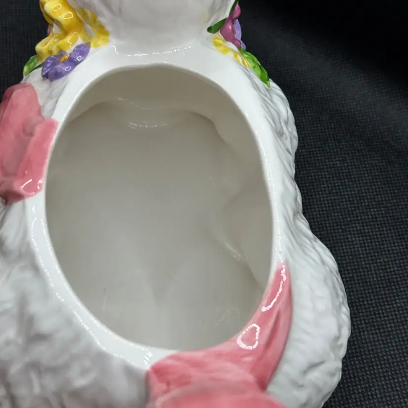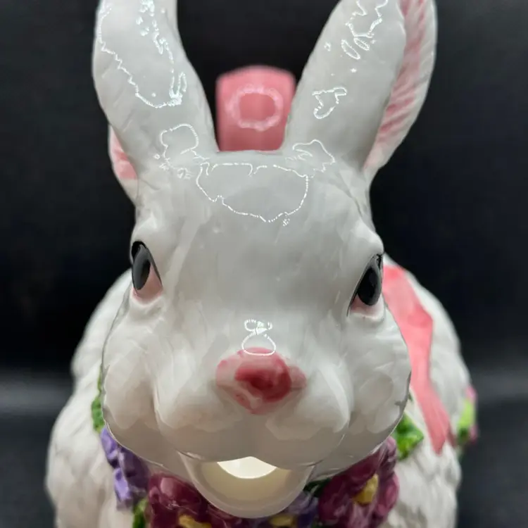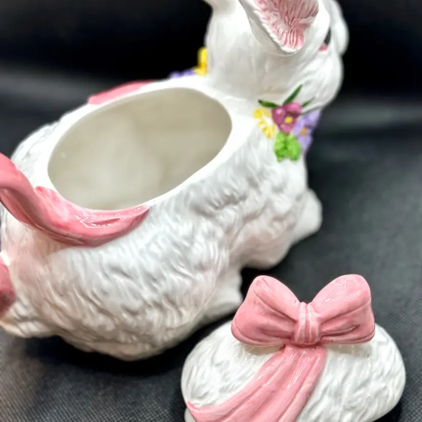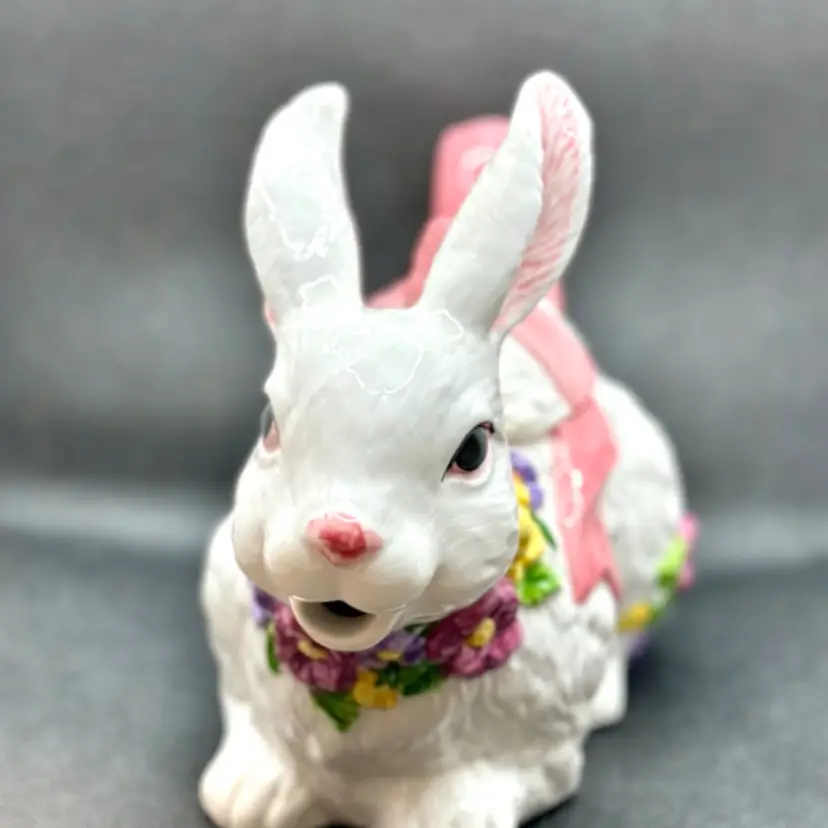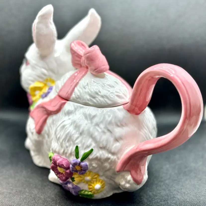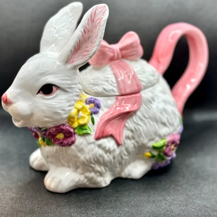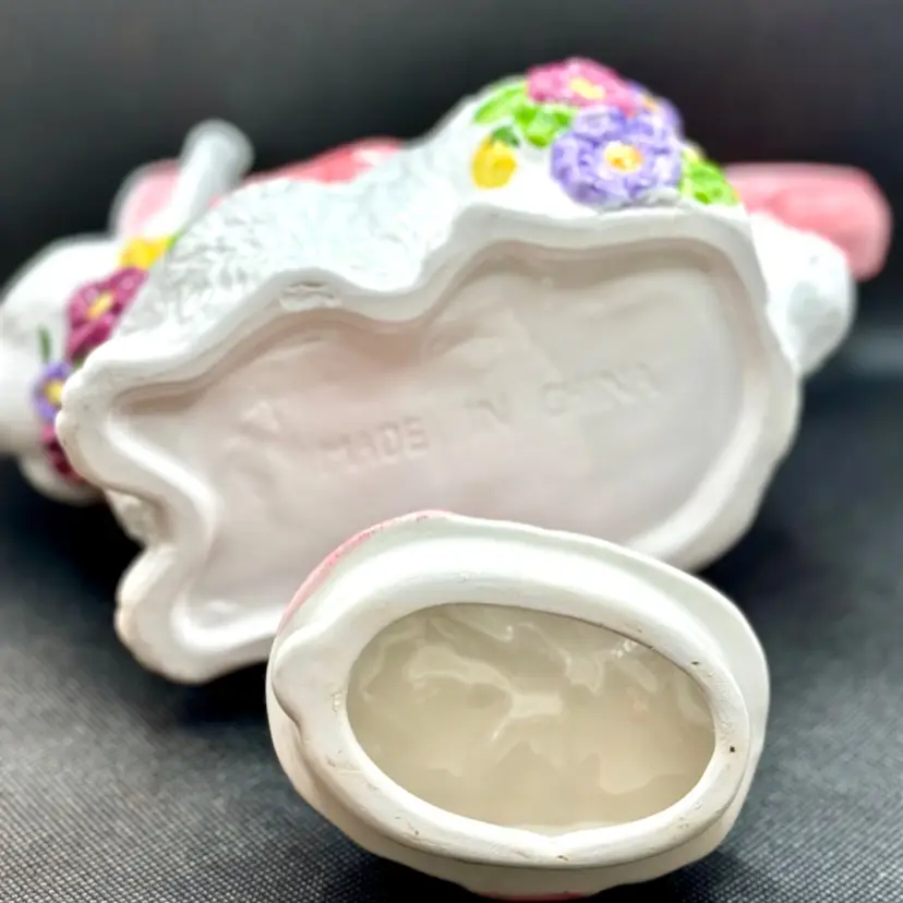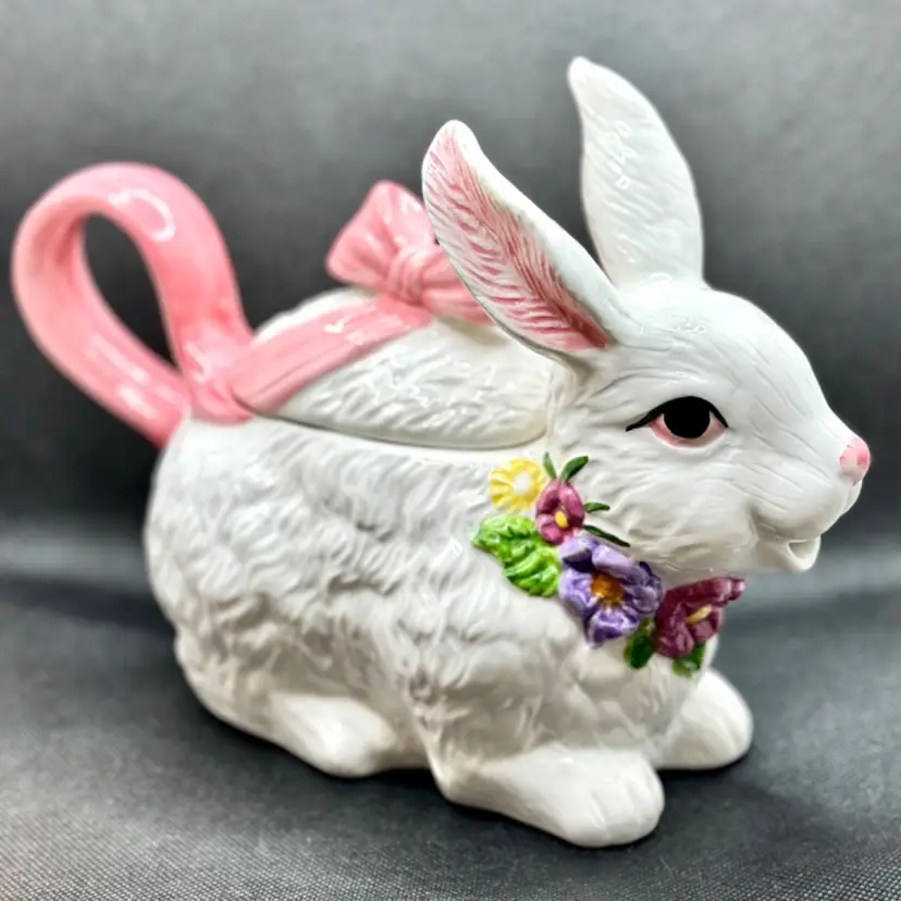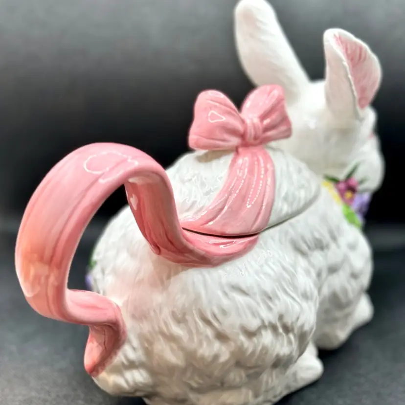 Vintage bunny rabbit teapot white with floral flowers pink ribbon ceramic, by Trompe L’Oeil, made in China. Very cute and perfect for any occasion or rooms. No chips or cracks. Measures 10x7.5x4, opening 3.5x2.5. Weighs 2lb.