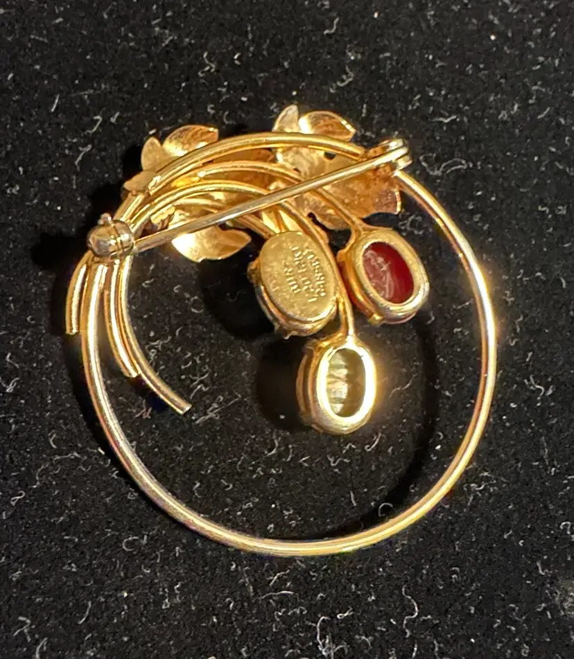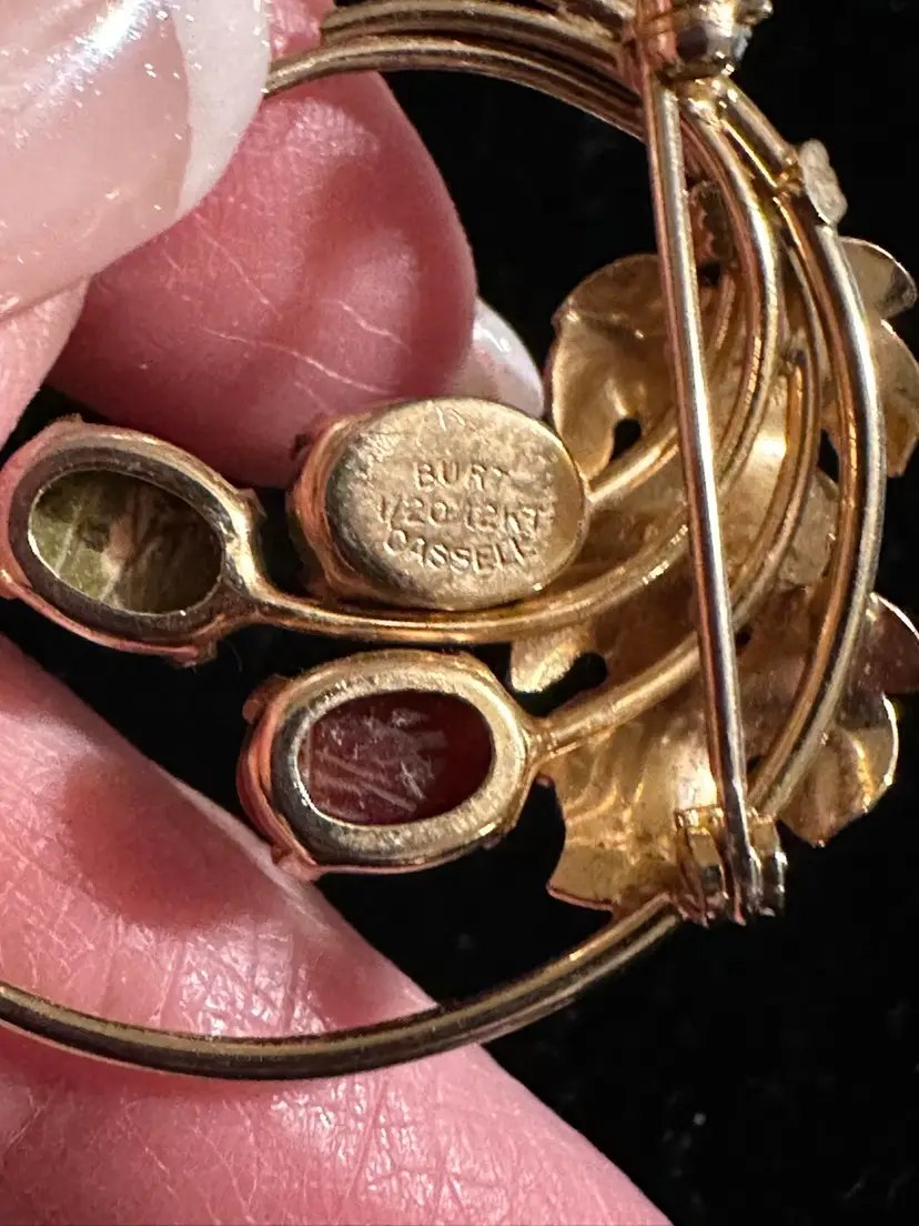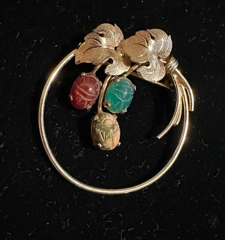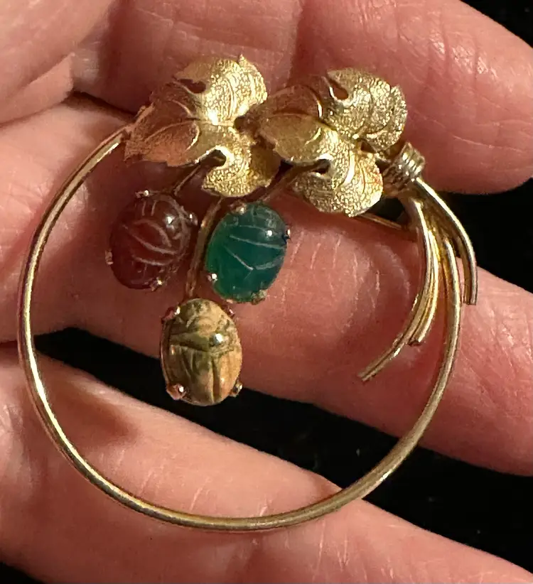 Lovely vintage Burt Cassell circle pin. It is 12k gold filled set with genuine carved scarab stones. It measures 1.5”. Excellent condition.