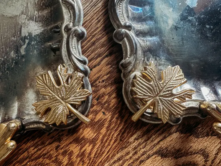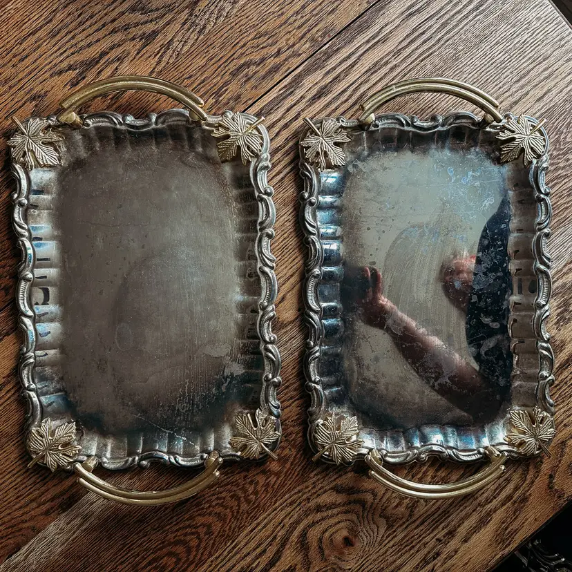 Please review pictures for detail. The large tray is missing one leaf which is why I'm selling them as a lot of 3 for the price of 2. These trays are beautiful and perfect for Fall decorating! The brass accents really pop.