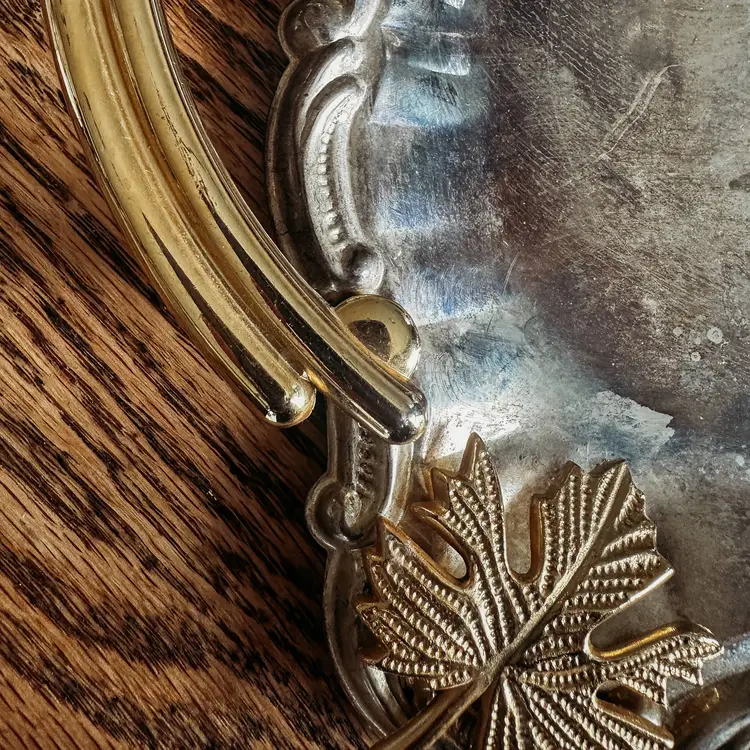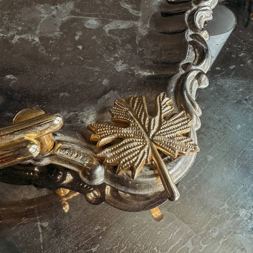 A vintage set of three butler serving trays made of silver plate metal with brass accents. These trays feature a decorative maple leaf design, perfect for adding a touch of elegance to your serving collection. Dating back to the 1970s, they are a stylish and practical addition to any home.