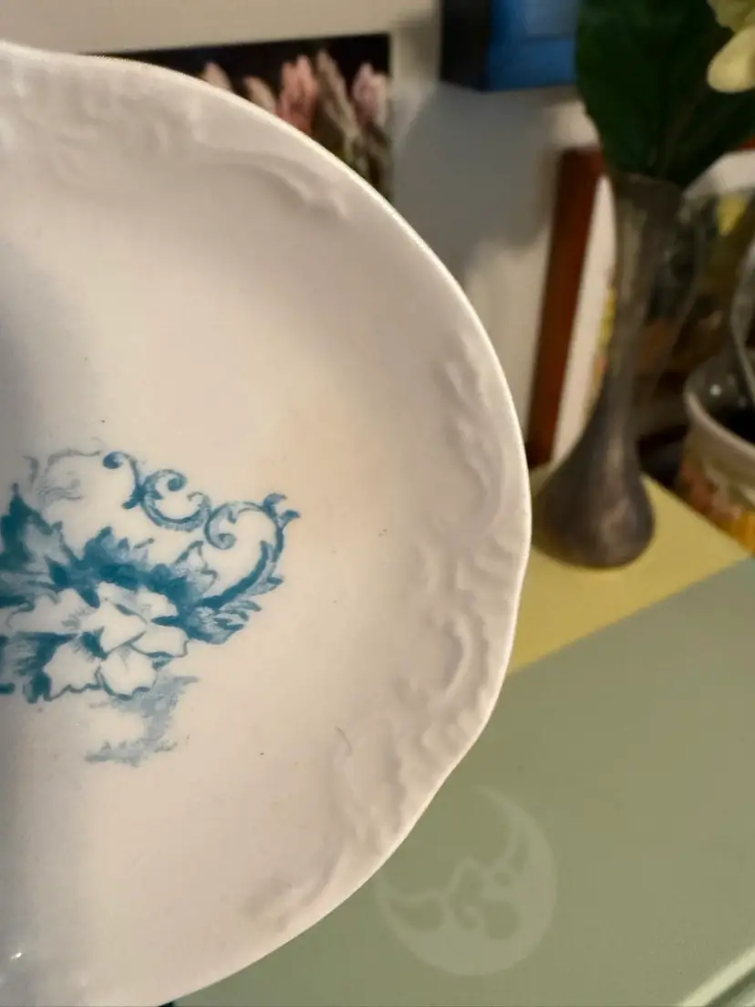 These vintage white porcelain butter pats feature a decorative scalloped edge and a blue floral transferware pattern.