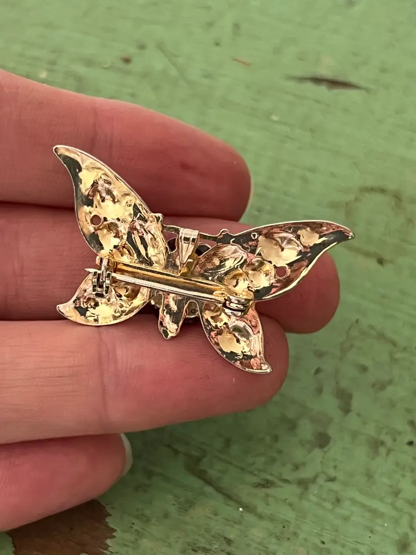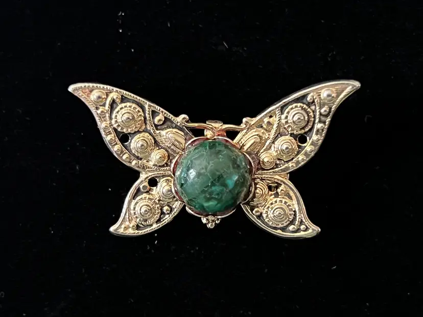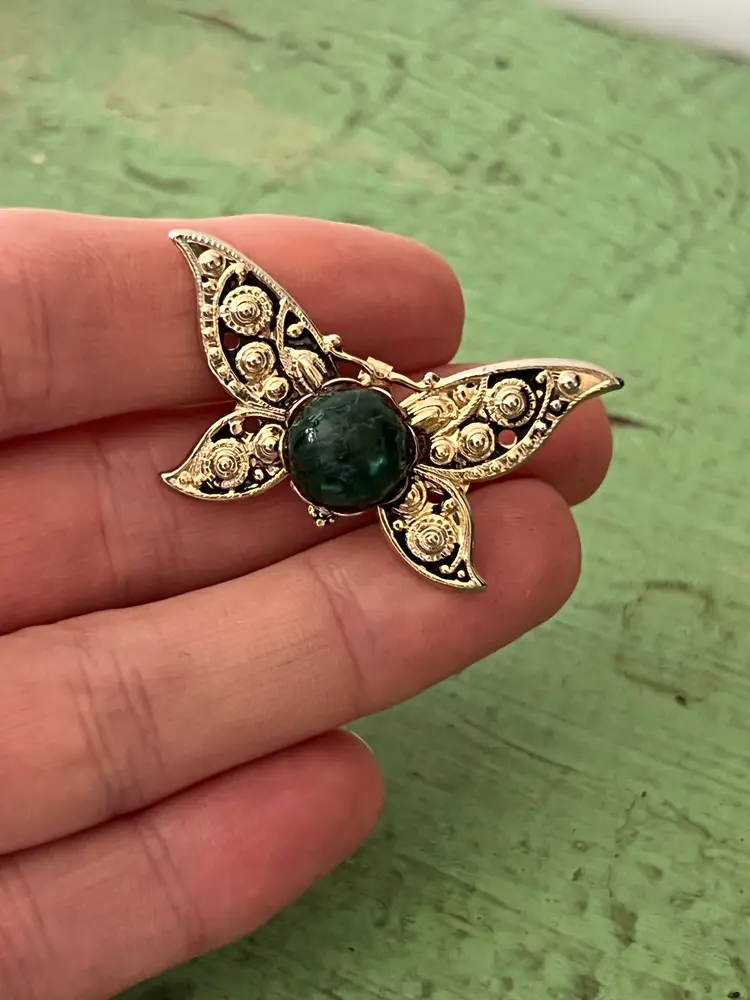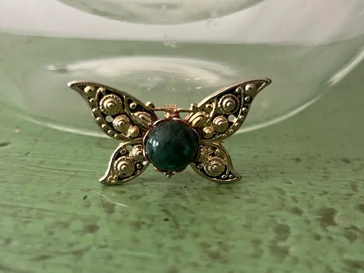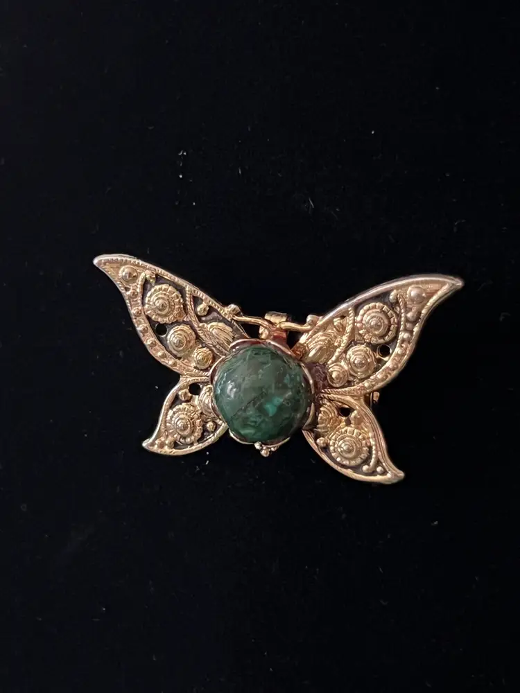 Vintage gold tone butterfly brooch with a green variegated stone. No noted flaws. 1.5" x 1"