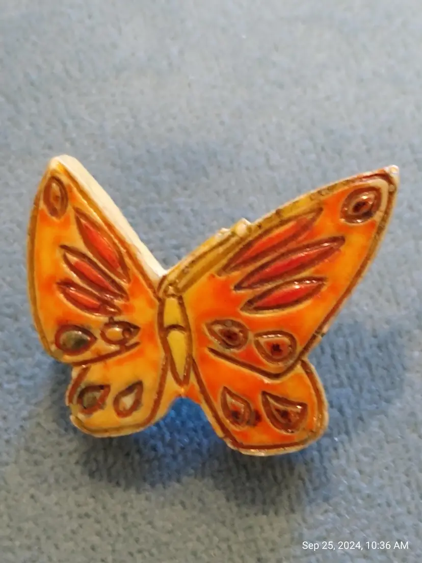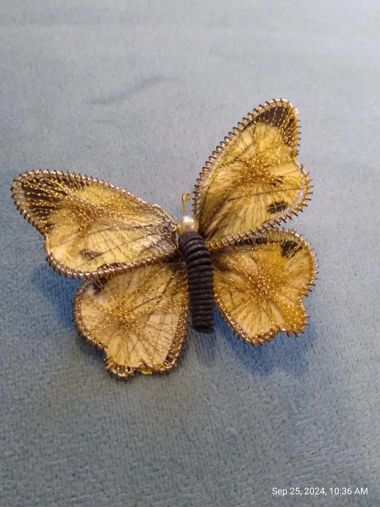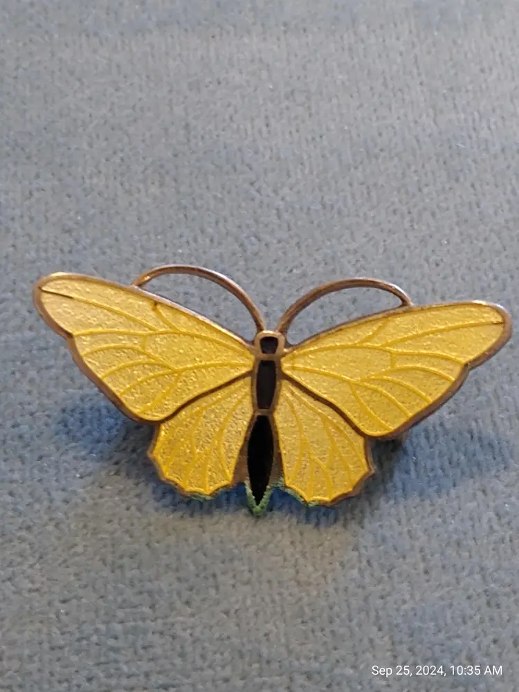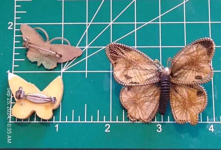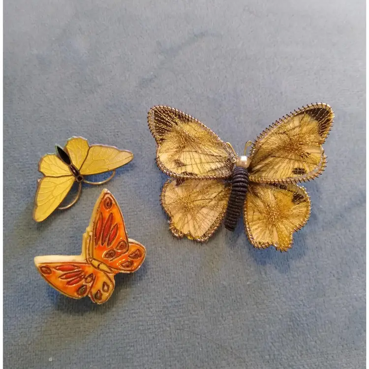 Charming set of three vintage butterfly brooches. Each brooch features unique designs and colors, perfect for adding a whimsical touch to any outfit. In lovely, pre-owned condition; there is a little bit of verdigris on the underside of the small enamel butterfly. It does not detract from the appearance of the brooch.