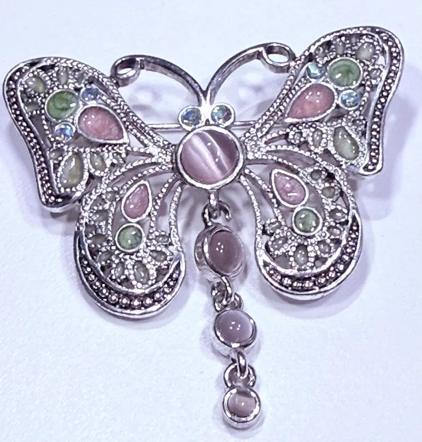 Add elegance and whimsy to your jewelry collection with this beautifully detailed vintage butterfly brooch. Crafted in silver-tone metal, the wings are accented with pink, green, and pastel cabochon stones, with sparkling crystal rhinestones for added brilliance. A dangling charm at the center adds graceful movement, making this piece truly eye-catching.