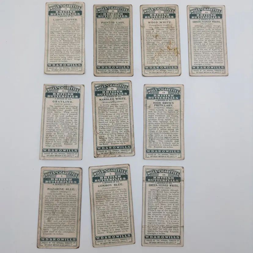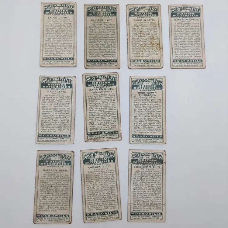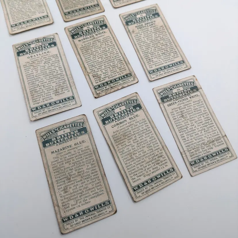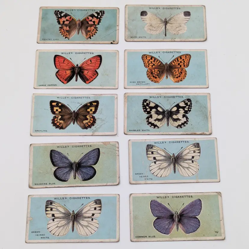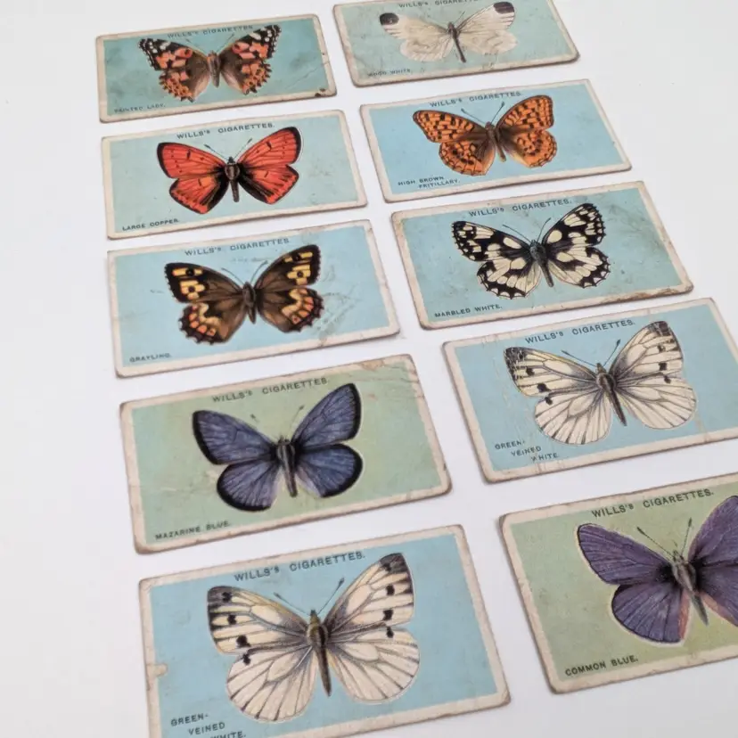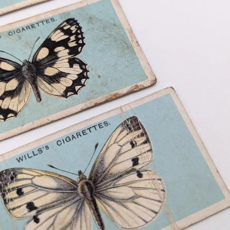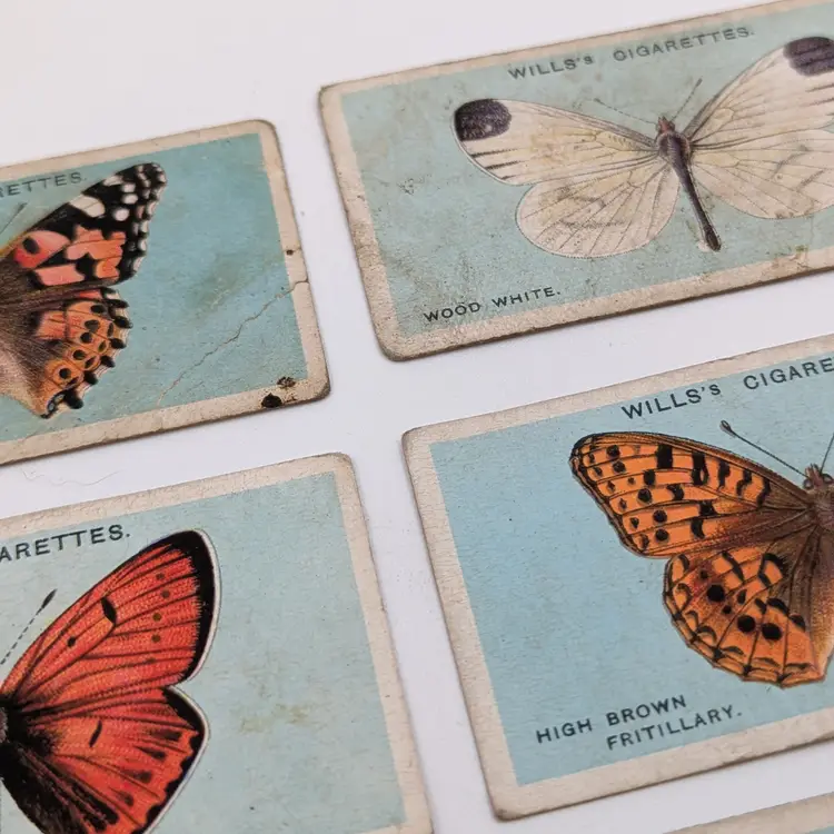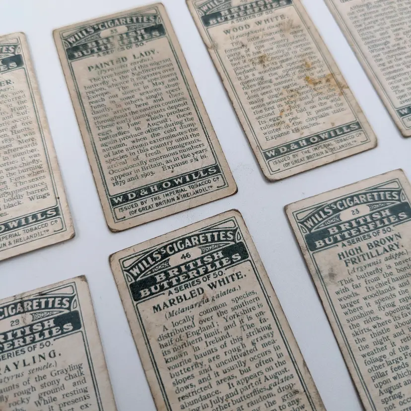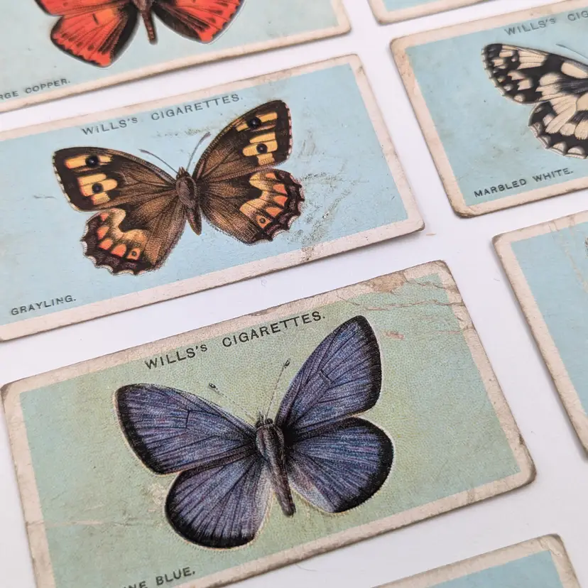 Antique (well almost!) British cigarette collector cards issued by W.D.& H.O.Wills Tobacco in 1927 on British Butterflies. There is a description of the type of butterfly on the back. These are printed with lithography.