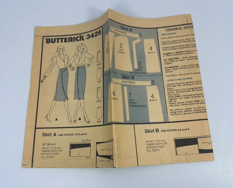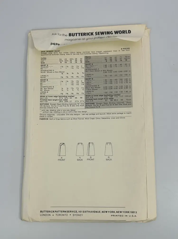 Items to be made with patterns: Straight wrap skirts four inches (10 cm) Below mid-knee have straight waistband. View A: has front asymmetrical buttoned closing. View B: has side front buttoned closing. Top stitching.