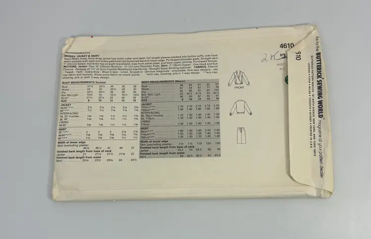 Items to be made with patterns: Semi-fitted, lined, front wrap jacket has notch collar and lapel, full length sleeves pleated into button cuffs, side front seam pockets with back and sides gathered into buttoned band at lower edge. Purchased shoulder pads, straight skirt 1" (25mm) below mid knee has straight waistband, bias front panel pleat, and back zipper closing. Purchased blouse.