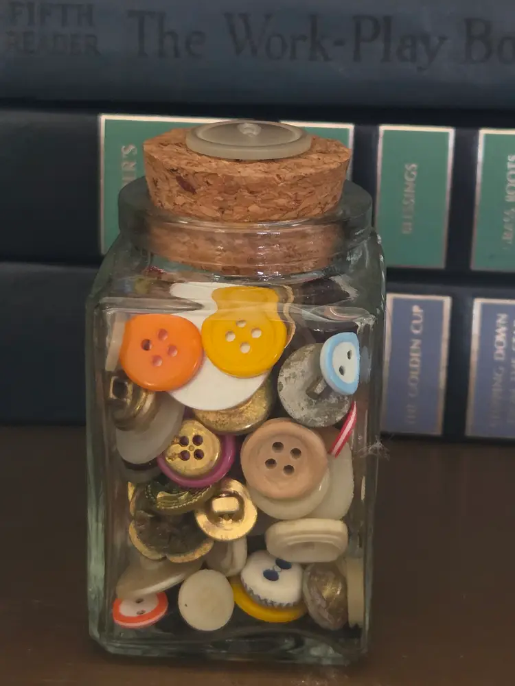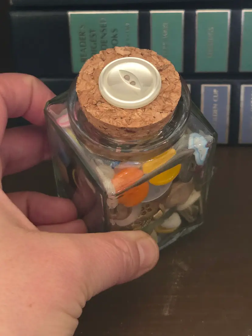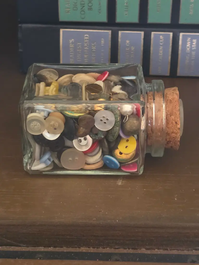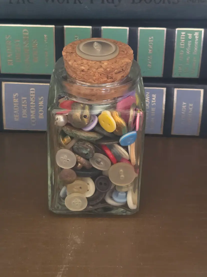 Discover a charming assortment of vintage buttons in this quaint glass jar with a cork lid. Perfect for crafters and collectors, each button tells its own story.