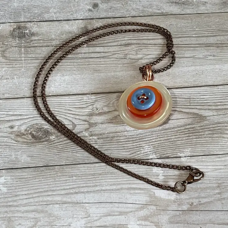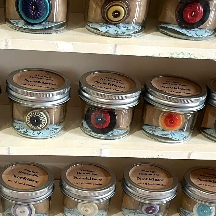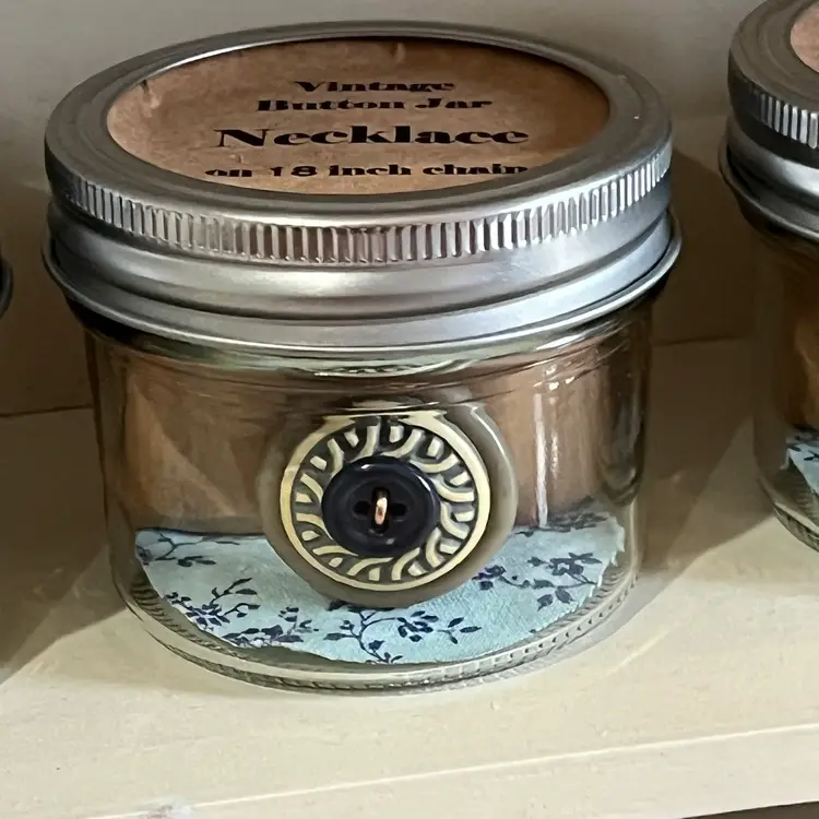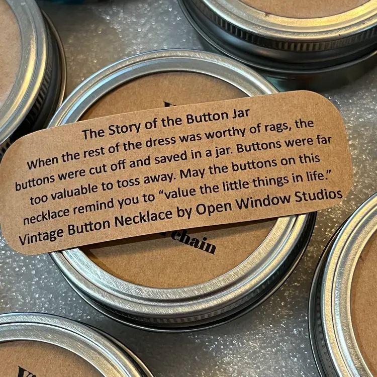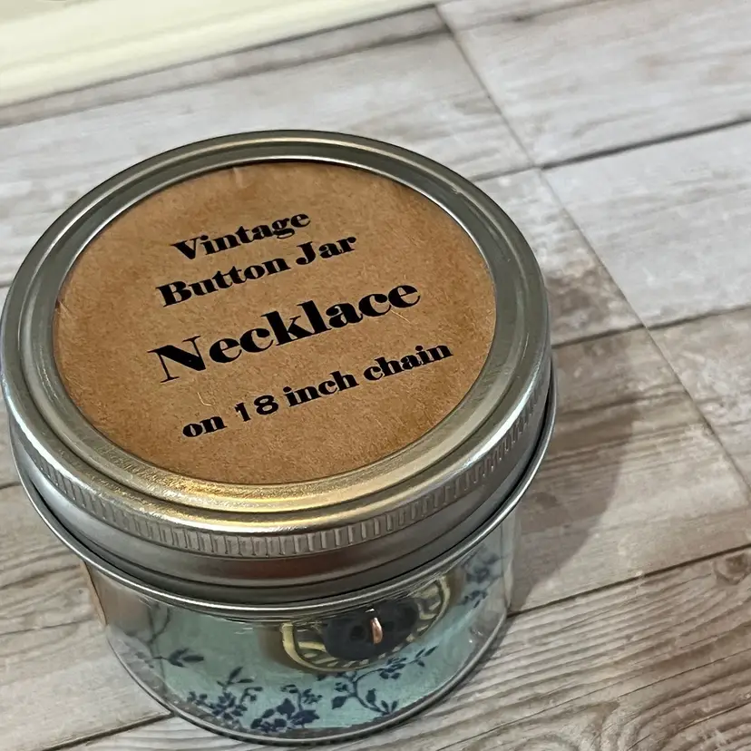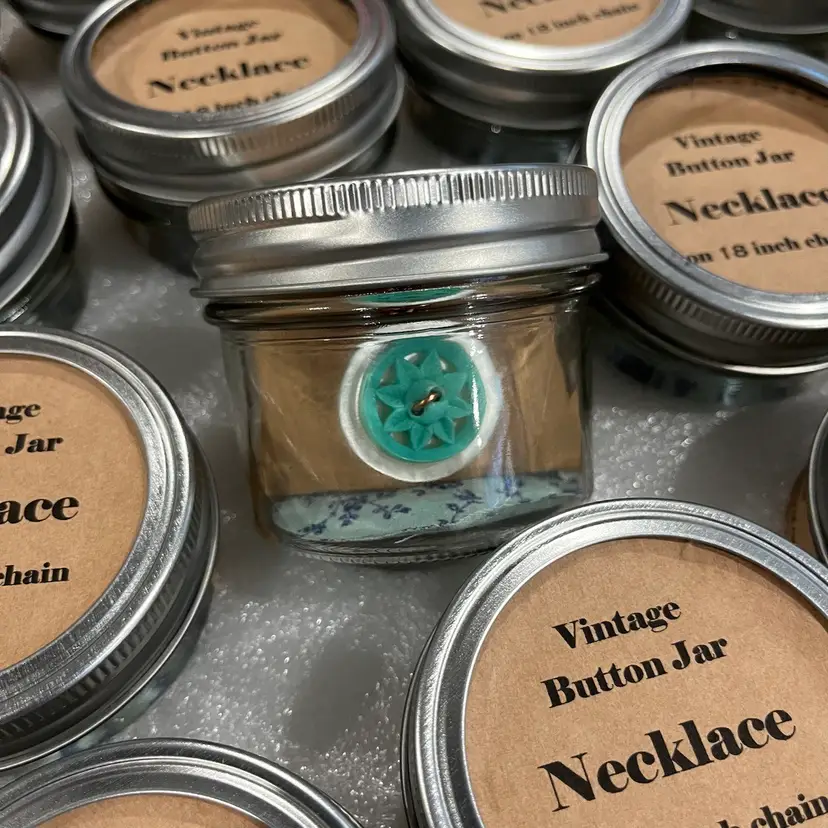 Wholesale price $6 per unit: Suggested Retail is $17 per unit. This listing is for 1 dozen assorted vintage button necklaces packaged in glass jars. Each one of a kind button pendant is made by hand wrapping vintage buttons on a non tarnished copper wire. Jars labels tell the story of the button jar and remind your customers to “value the little things in life.” Button pendants vary in size from ~ 3/4 to 1 1/2 inch wide. Copper tone chains are 18 inches in length and have a lobster claw closure. Each button necklace is one of a kind. Photos are representative of the product. Color and design of the individual necklaces you receive will vary. The buttons used in this product are up cycled vintage buttons. All other components made from new materials. Handmade in the USA