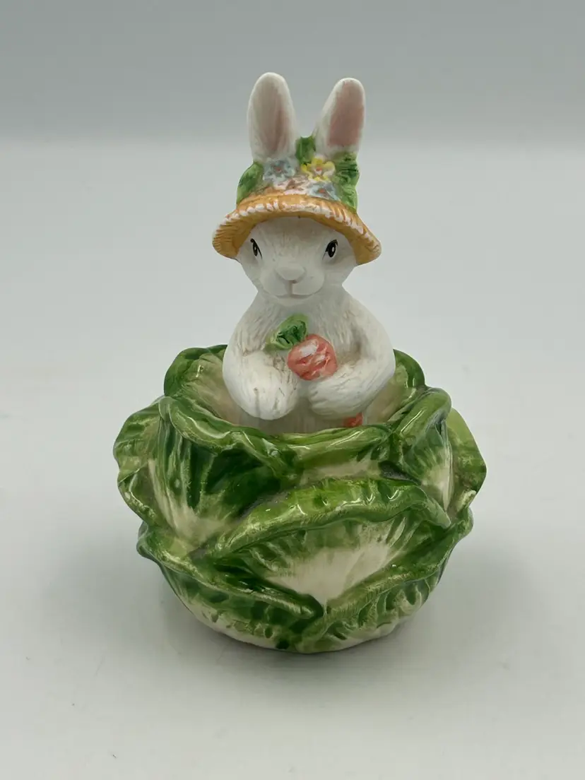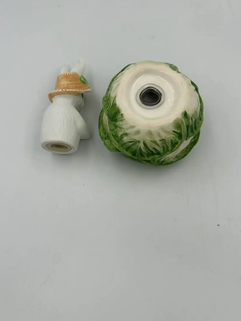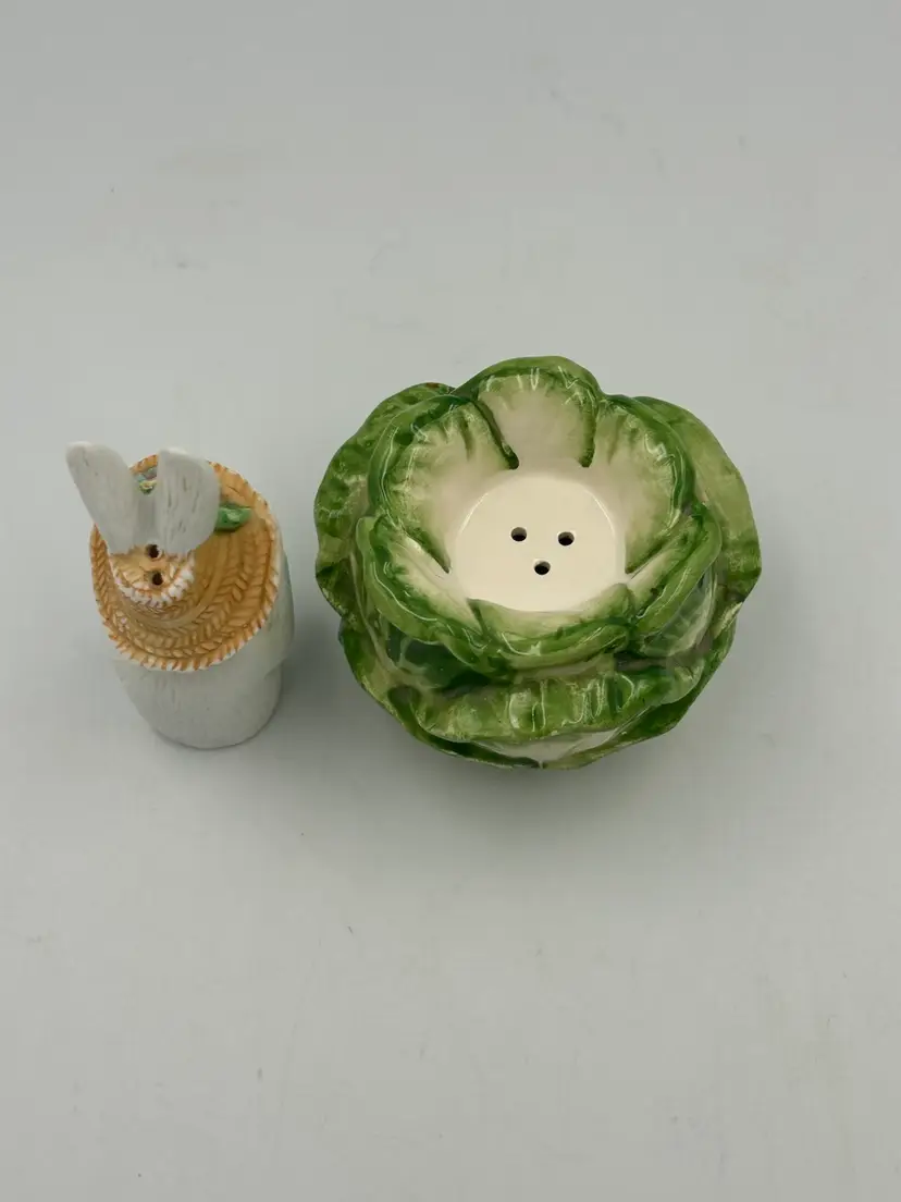 Perfect condition. 4.25 inches together. Bunny –3H X 1.25 W. Cabbage –2H X 2.75 W.