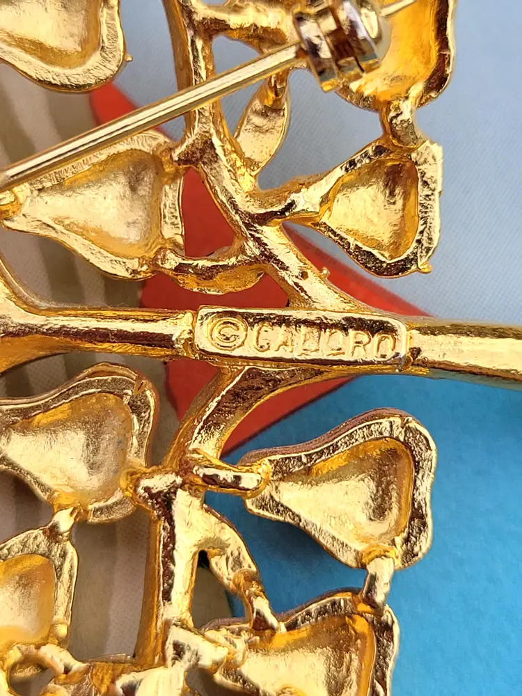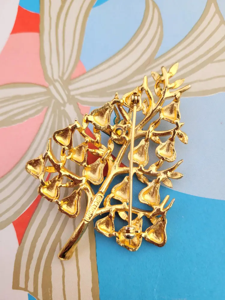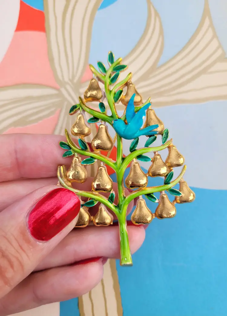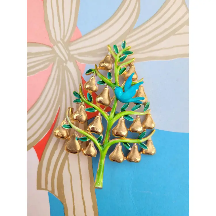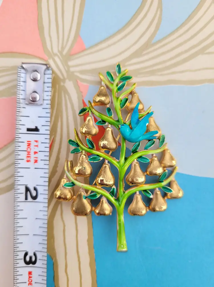 Adorable 70s "partridge in a pear tree" Christmas brooch by designer Cadoro! It's in good condition with a bit of wear on the enamel, please see pictures for details and measurements.