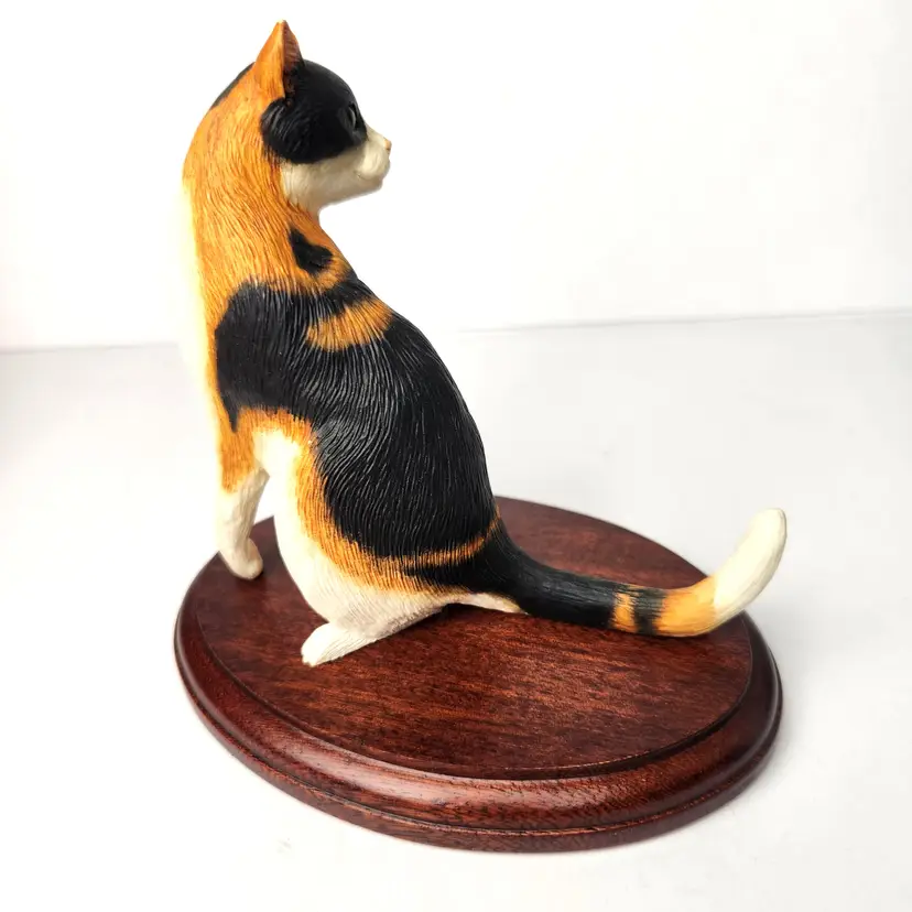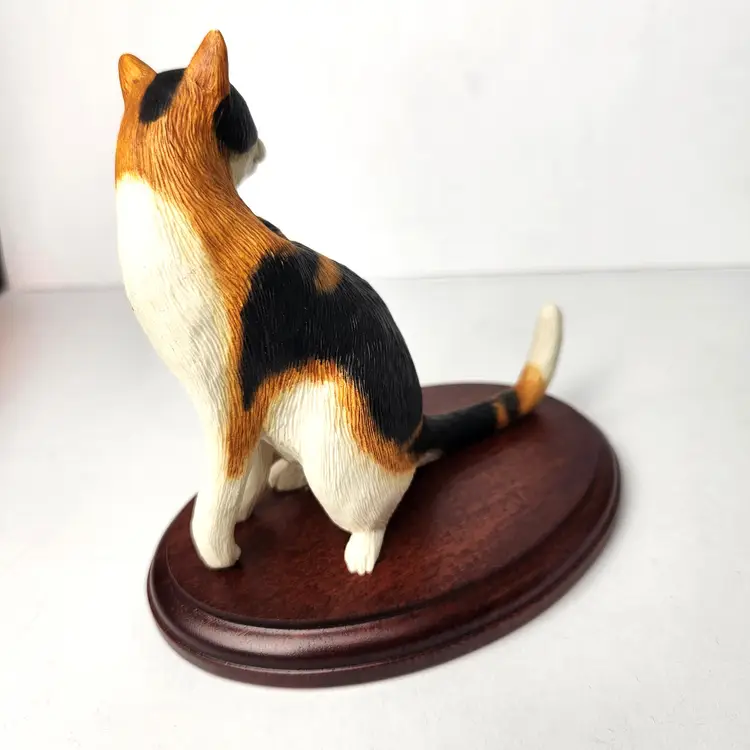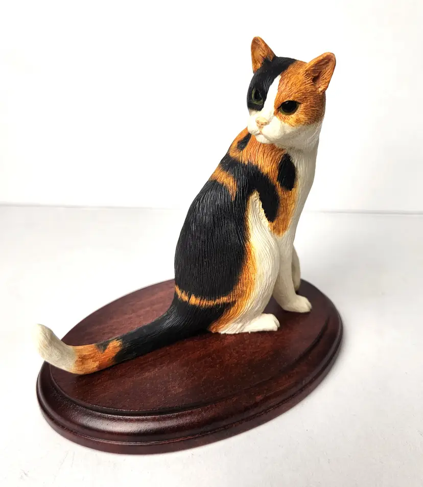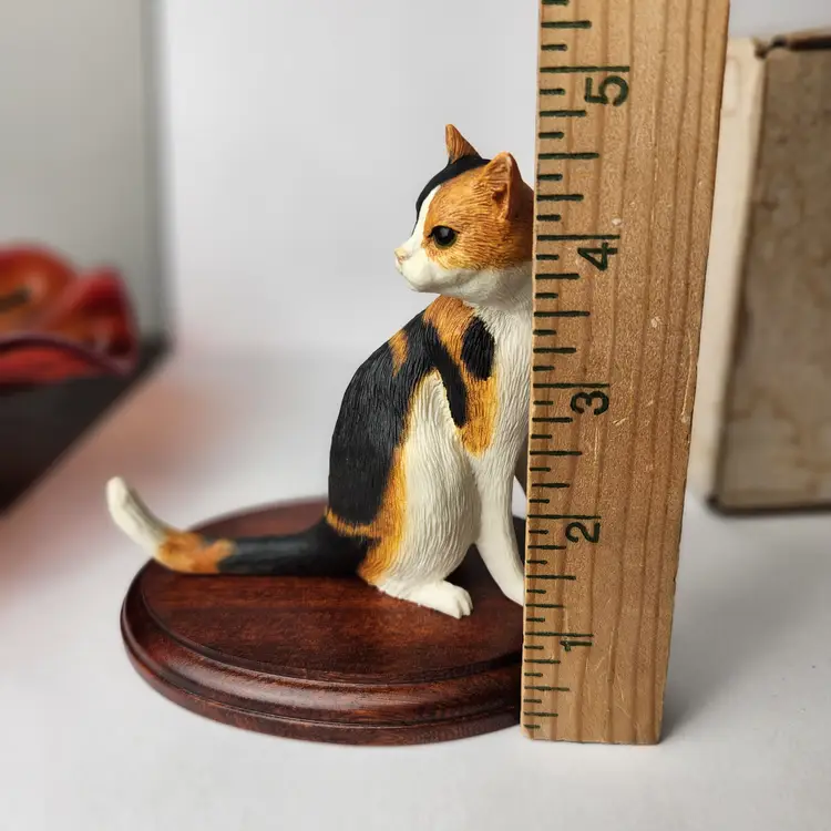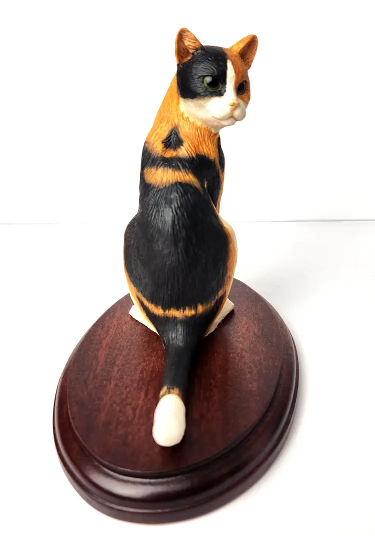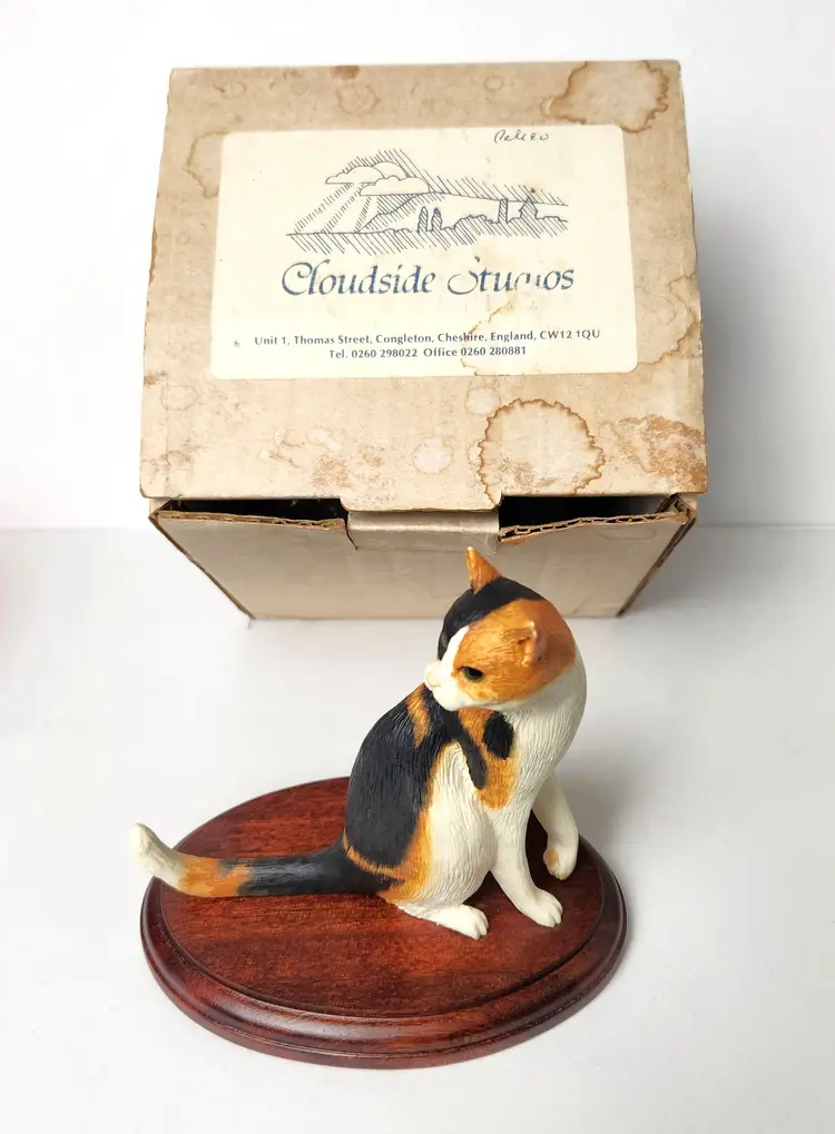 This adorable Calico cat is sitting and mounted on cherry wood is by Cloudside Studios of England. It is new, old stock and comes with the original box. There is some paint loss on tip of both ears (from top of his head rubbing on box). Material is sandcasted figure on wood base. Measures approx 4/5" long x 4.5" tall x 5" wide Comes with original box. Box has some stains from storage. From early 2000s.