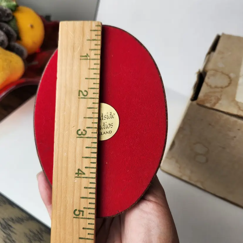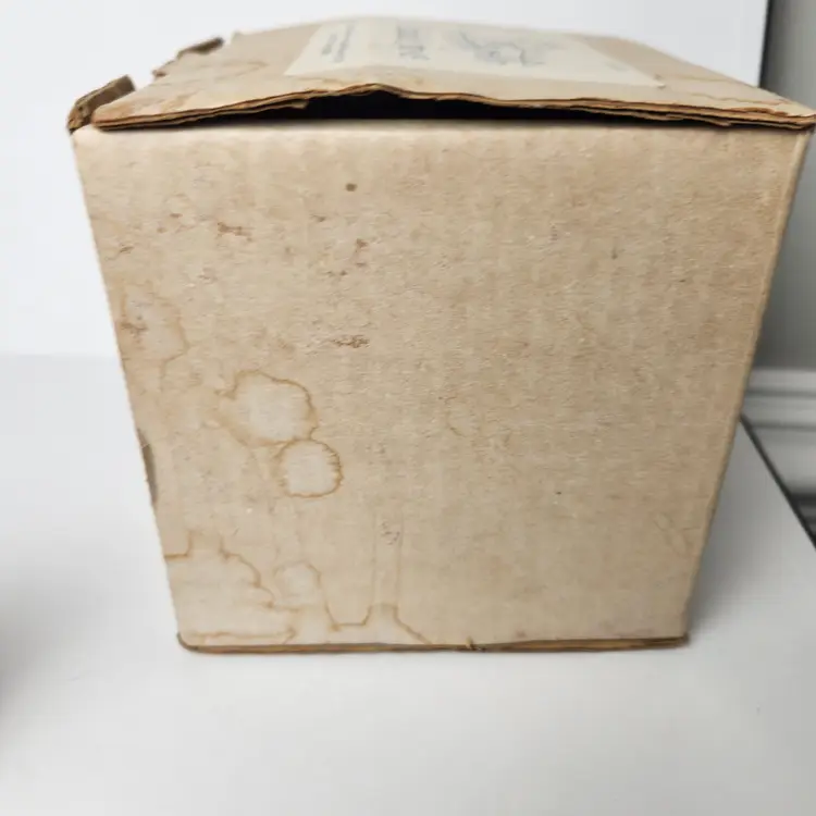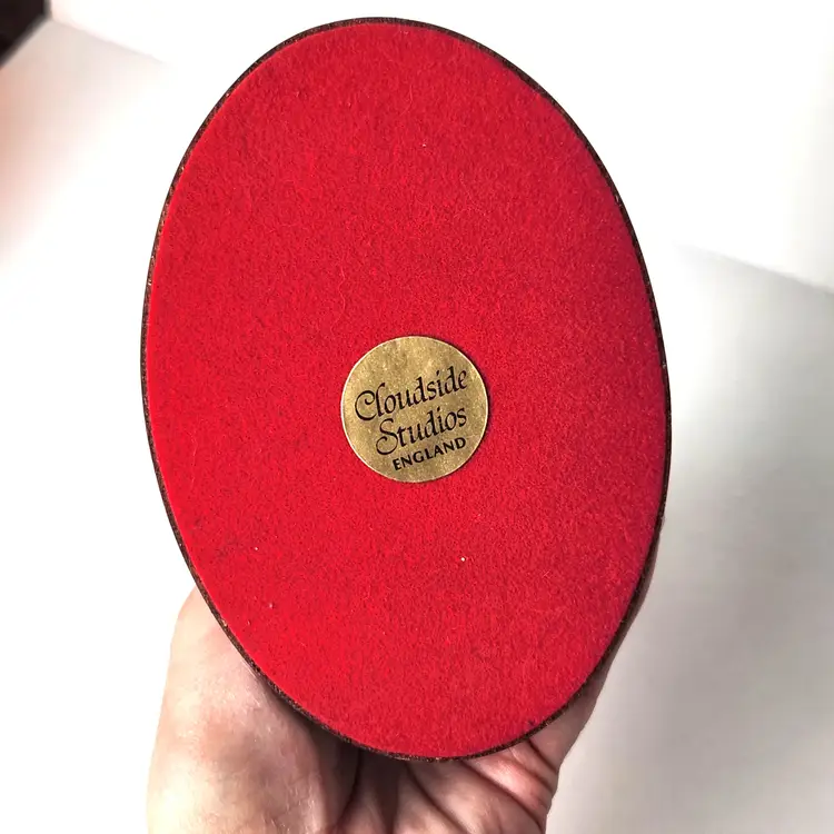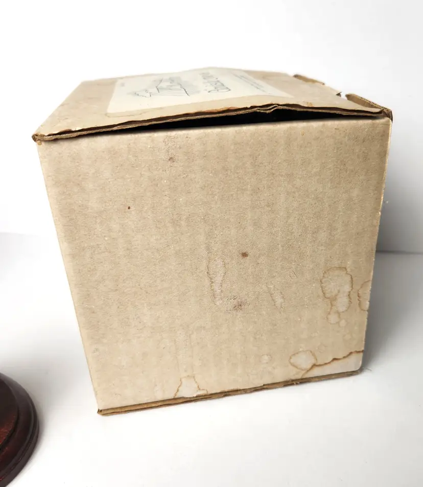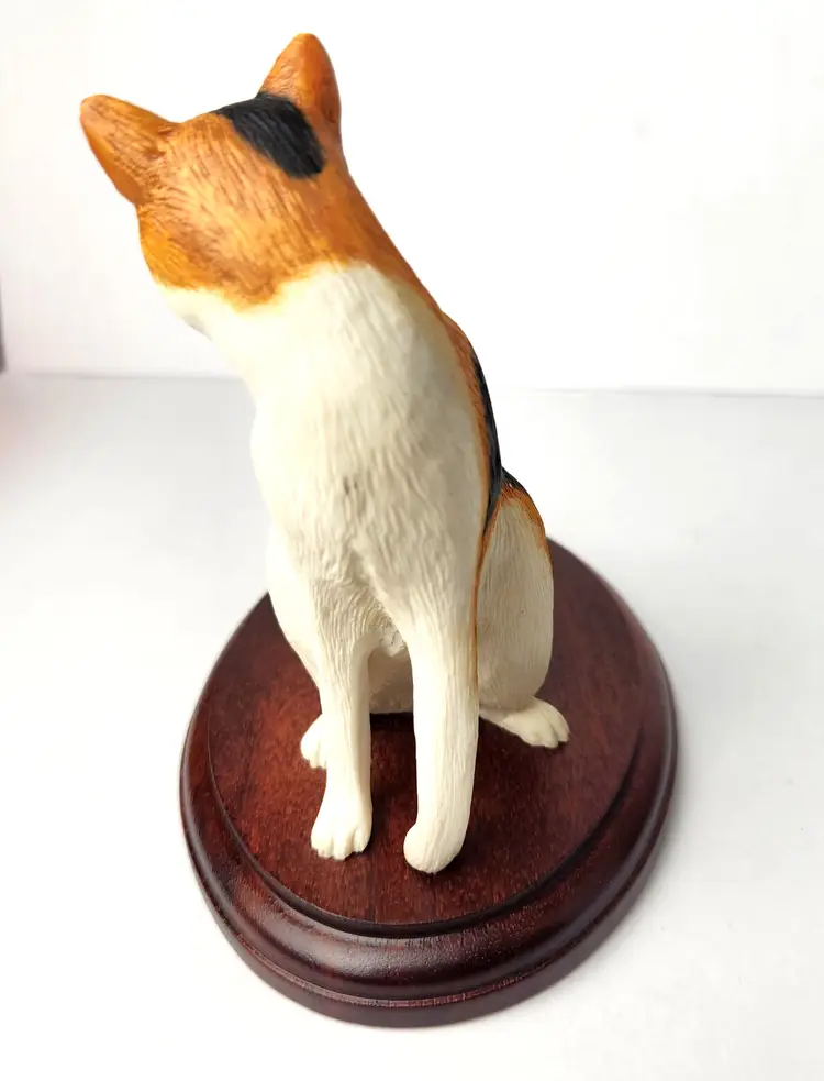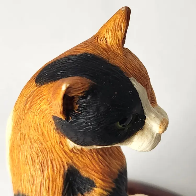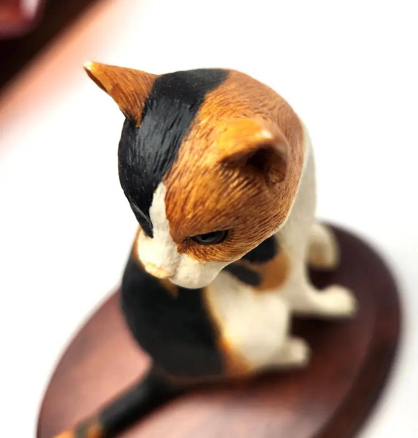 This adorable Calico cat is sitting and mounted on cherry wood is by Cloudside Studios of England. It is new, old stock and comes with the original box. There is some paint loss on tip of both ears (from top of his head rubbing on box). Material is sandcasted figure on wood base. Measures approx 4/5" long x 4.5" tall x 5" wide Comes with original box. Box has some stains from storage. From early 2000s.