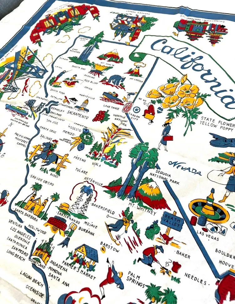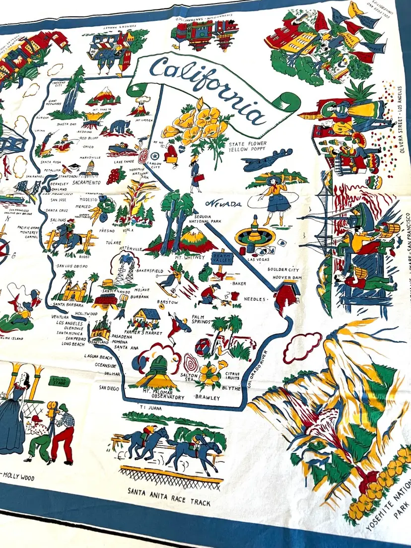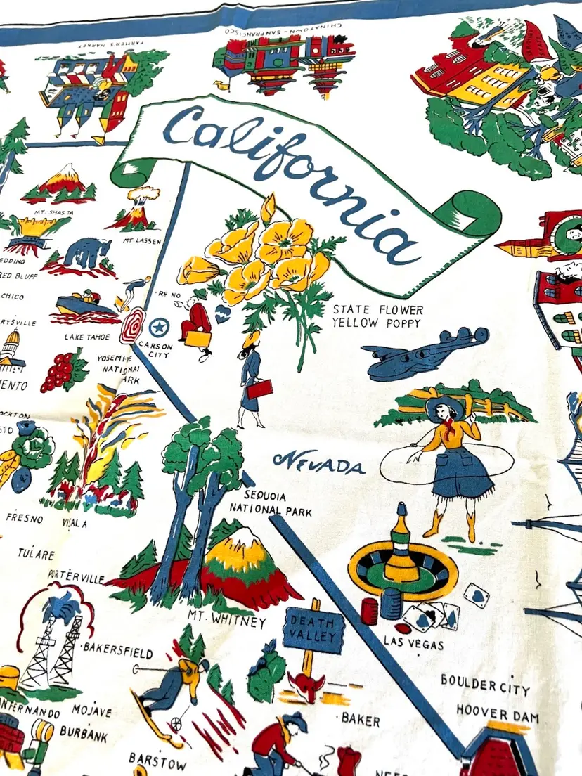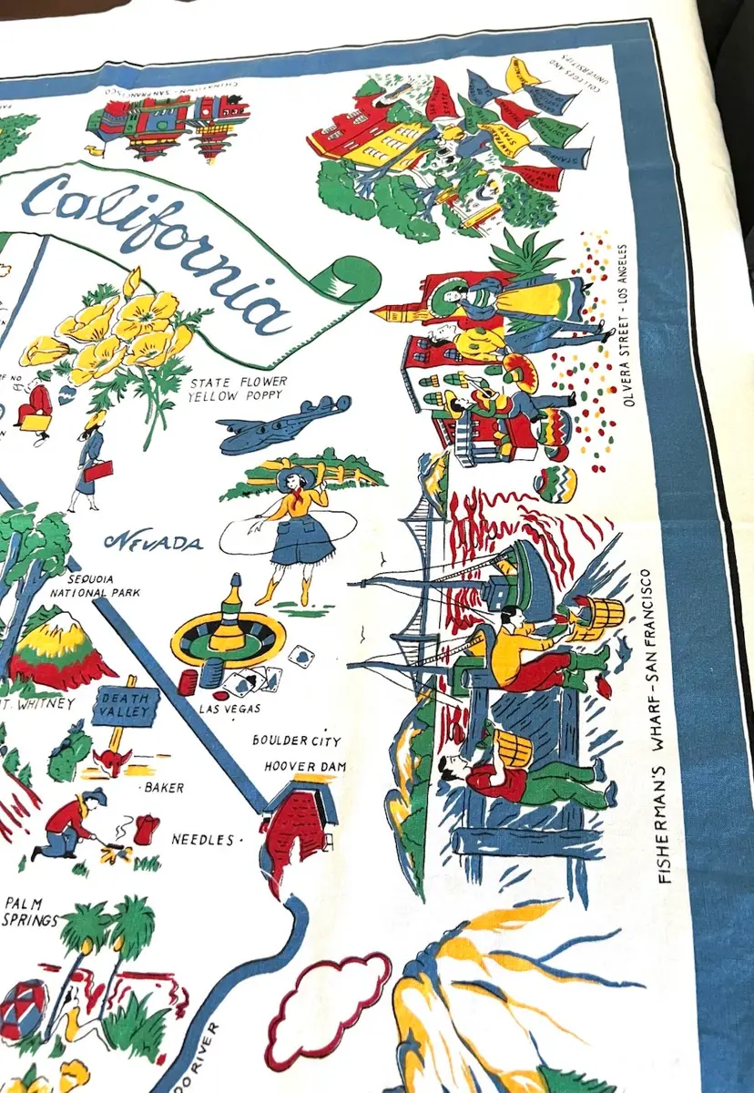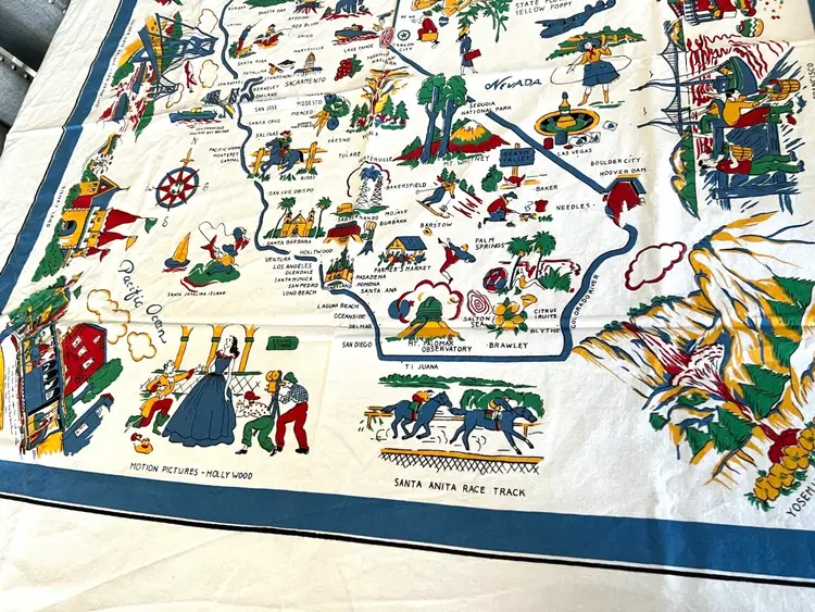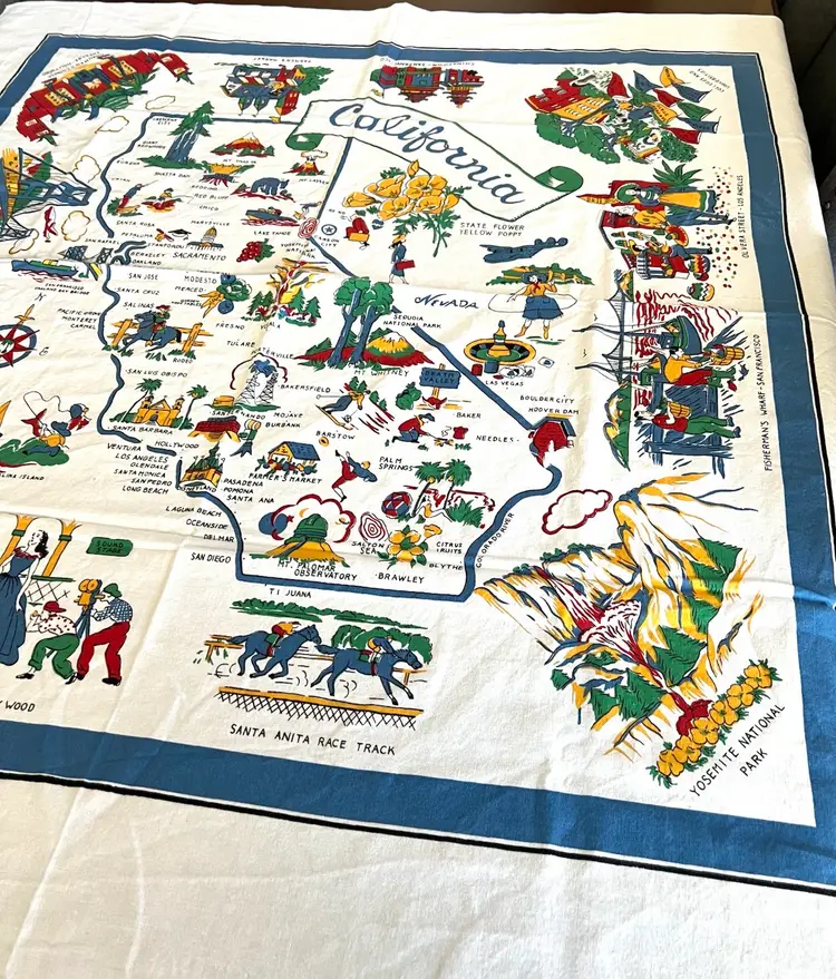 Lovely Bold and bright blue green and pink floral tablecloth. Celebrating the summer theme, this tablecloth is highlighted by surrounding the colorful flowers on a white background. Perfect for your next party . Great graduation party theme. Colors are bold: blue pink green Material - cotton - easy to wash Condition: for the age, this cloth is almost perfect. No holes or stains Size: 48 by 54 inch rectangle