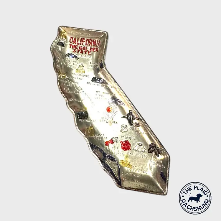 Cool souvenir from the 60’s depicting tourist sites of California in color. Made of tin in Japan. Very popular when families drove around the country for vacations