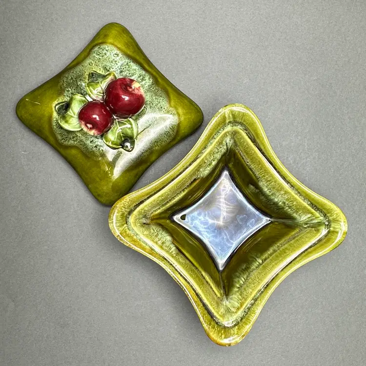 Unique vintage California USA pottery green ceramic lidded serving dish. The lid is topped with two baby red apples and leaves.