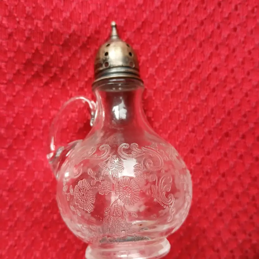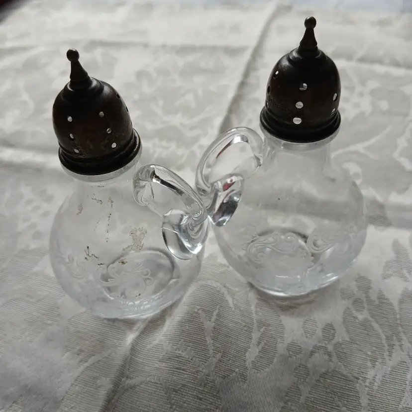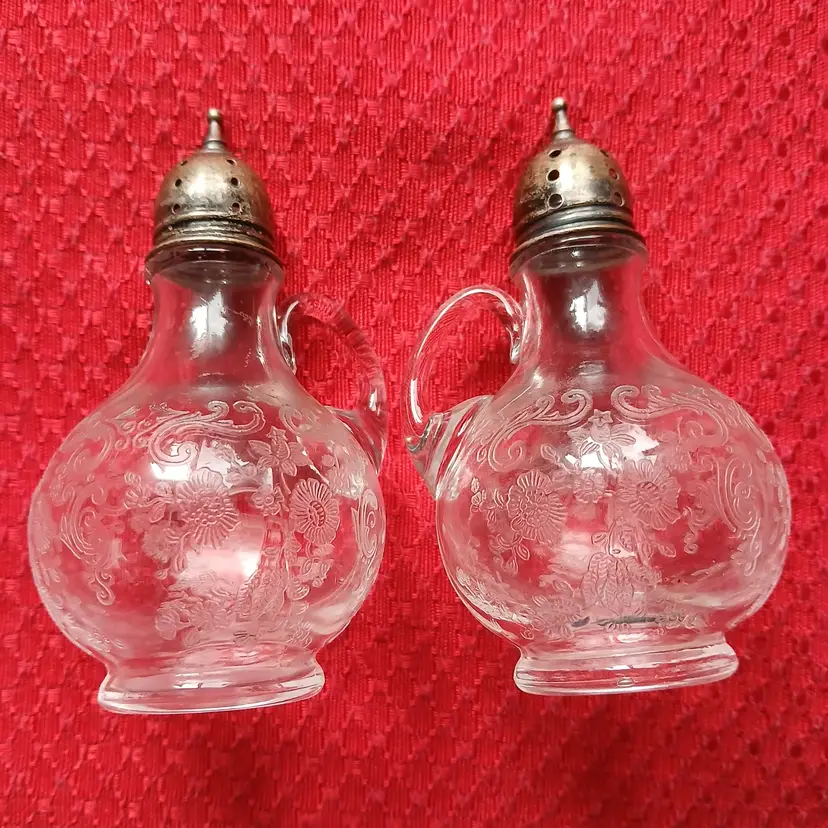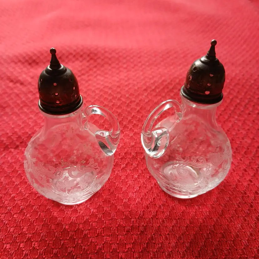 Beautifully etched glass salt and pepper shakers produced by the Cambridge Glass co. From the 1930's with Sterling silver lids and darling little handles