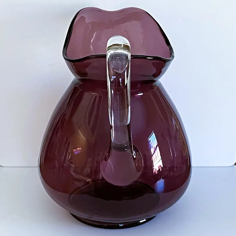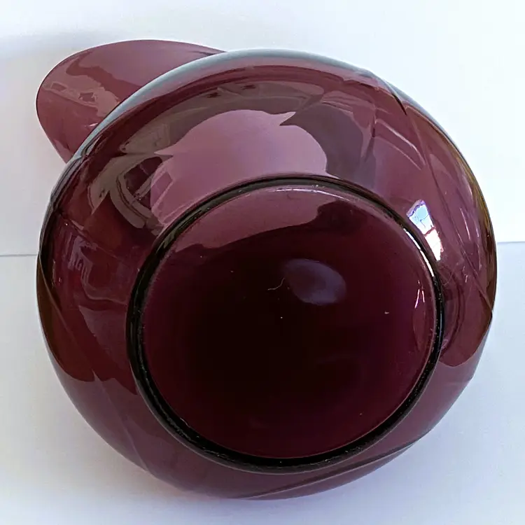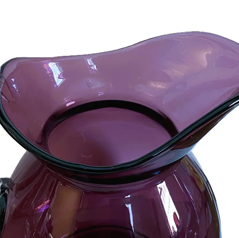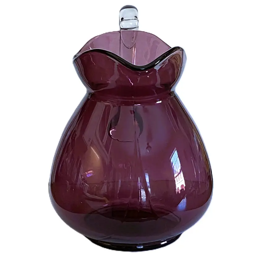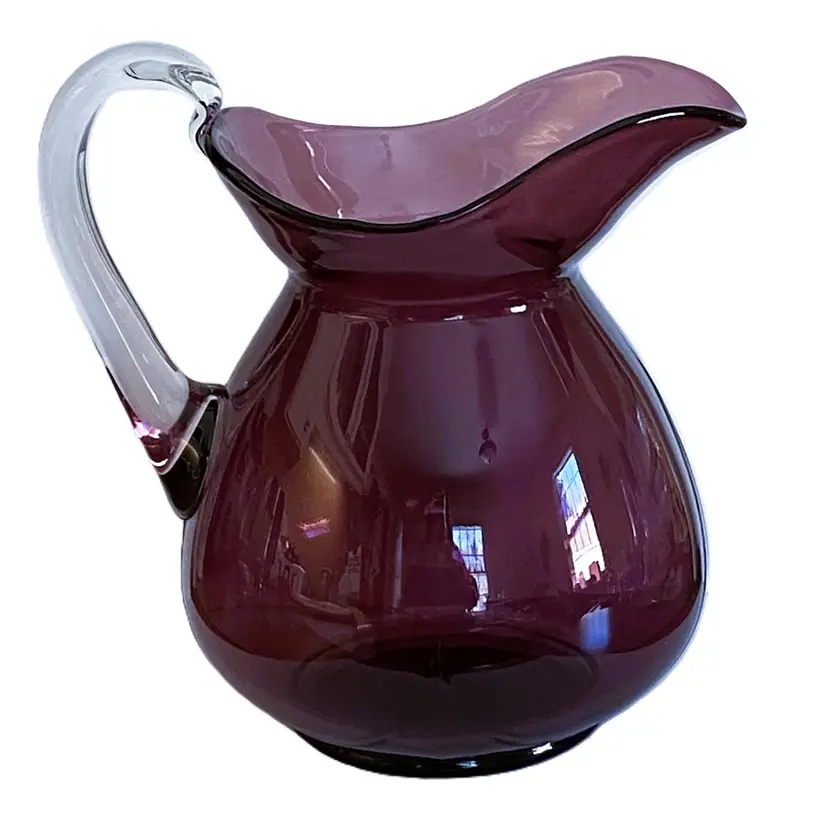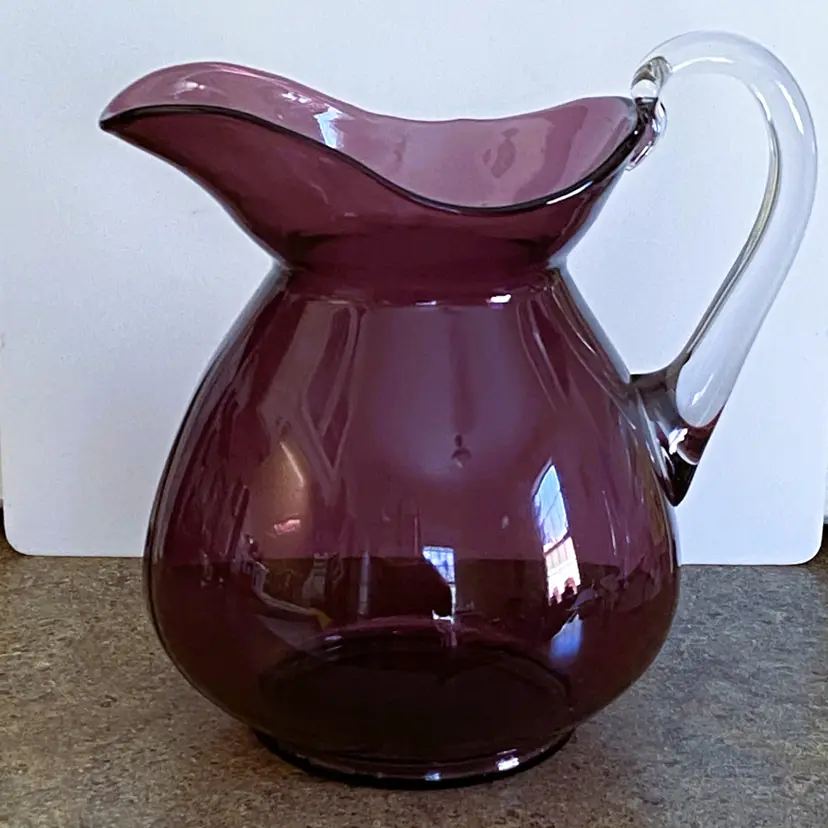Vintage Cambridge Glass Doulton pitcher in Aurora Amethyst. Beautiful purple glass with a clear glass applied handle.