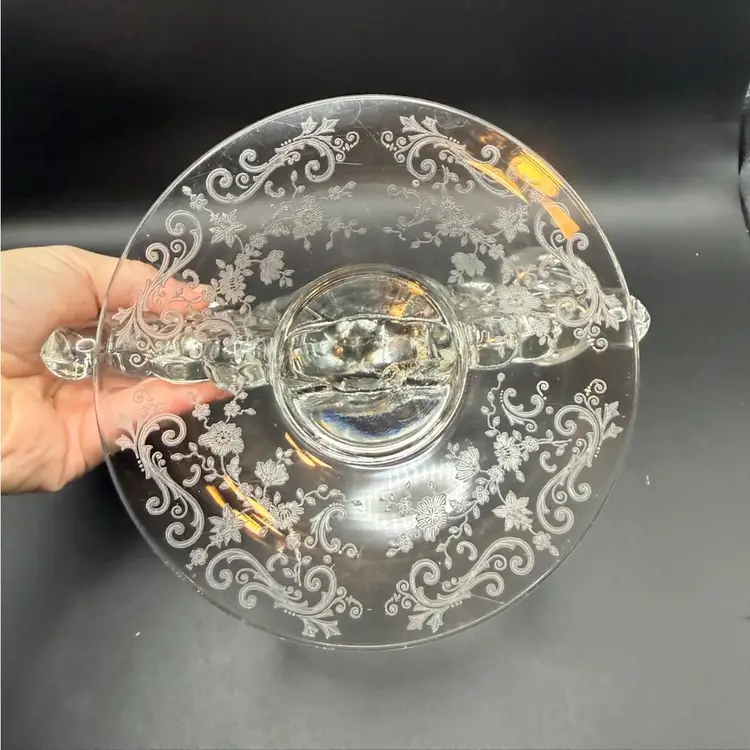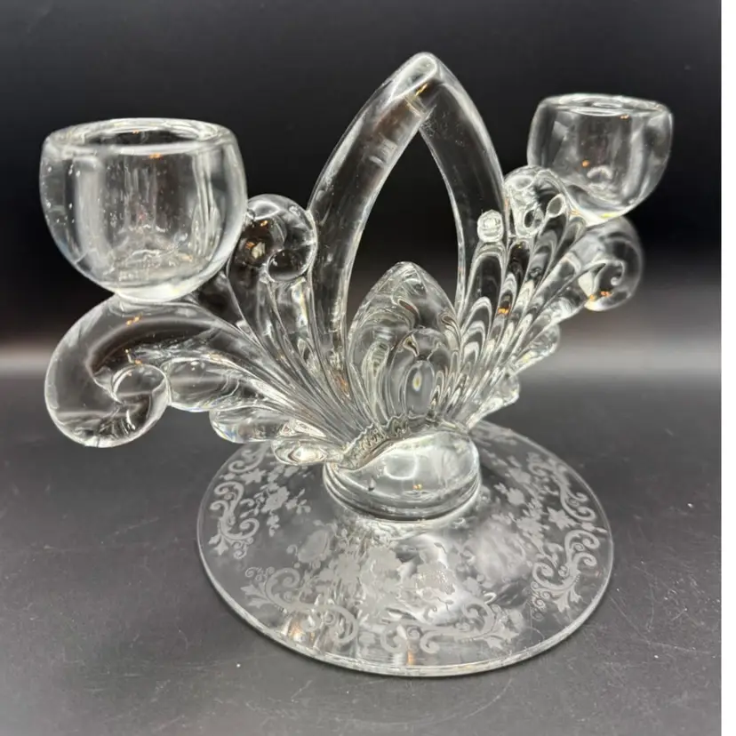 The Cambridge Glass Company, founded in 1873 in Cambridge, Ohio, was a prominent American glass manufacturer known for its high-quality pressed and blown glassware. This particular candelabra, is likely from the mid-20th century. The etched floral and scroll motifs on the base are characteristic of the period's aesthetic, adding a touch of sophistication. home furnishings.