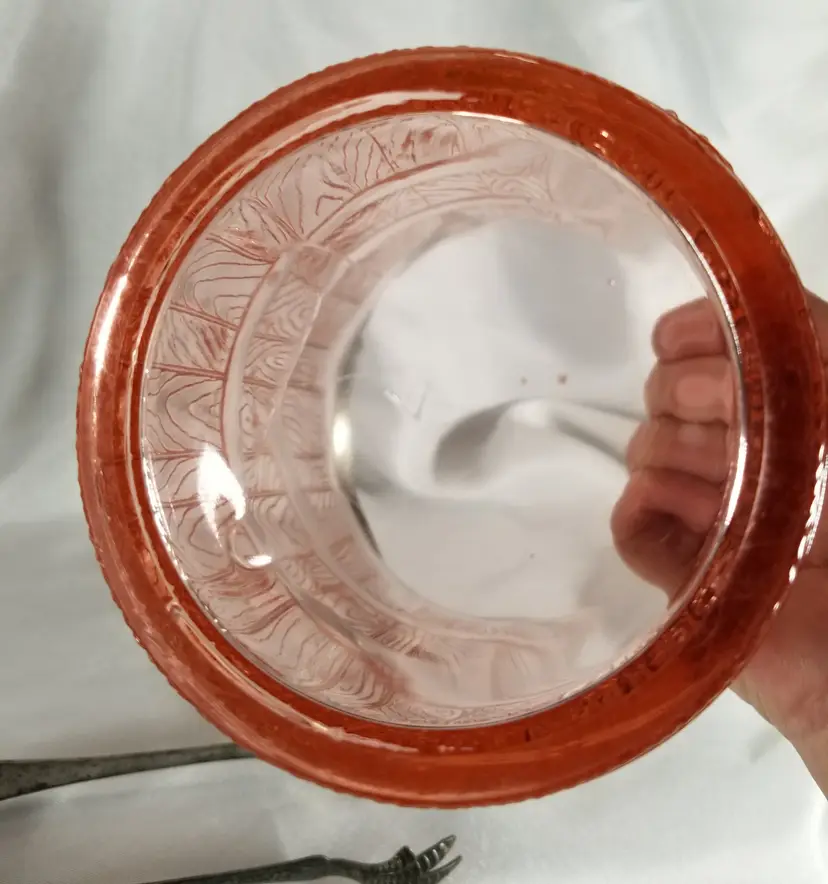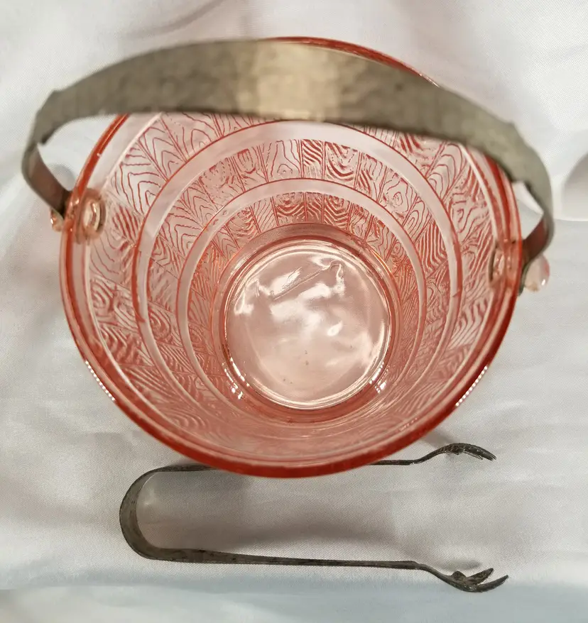 Vintage Cambridge Pink Depression Glass Keg Ice Bucket is 6" tall x 5 1/8" wide (excluding handle). This elegant glass piece has molded barrel or wooden keg design. It has a decorative hammered metal, bail style handle and matching hammered, claw tip tongs. It has two small chip or abrasions... one is in the woodgrain and hard to see, the other on the bottom of the top rim. It has a straw mark in the bottom and the C mark in a triangle. No chips, cracks, or repairs other than those noted. Please view the pictures and feel free to ask questions. Thank you for visiting my shop.