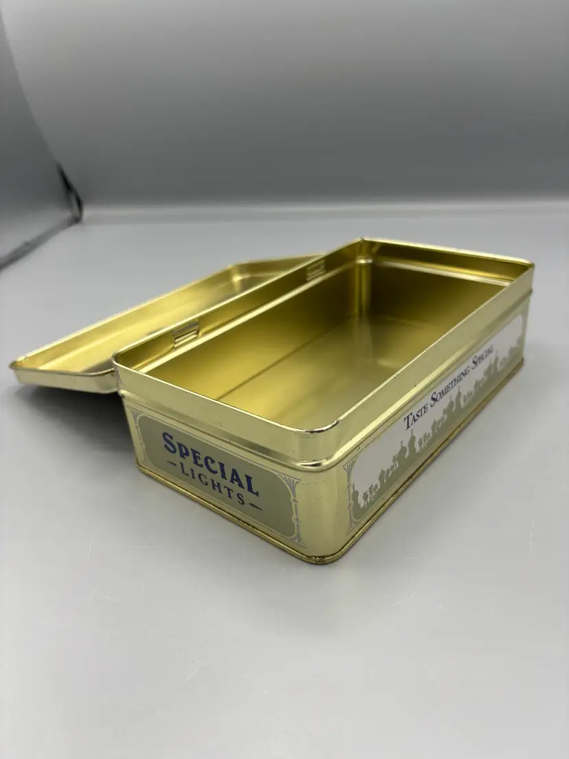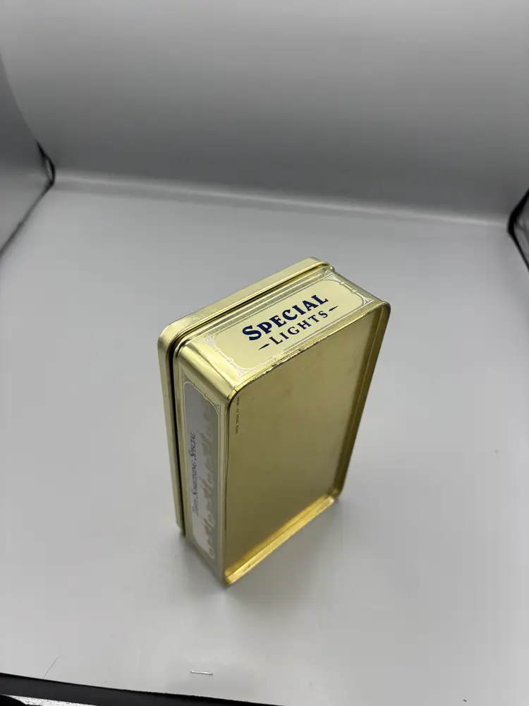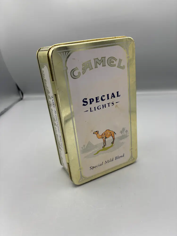 This collectible tin showcases the classic Camel Special Lights branding, a sought-after piece for vintage tobacco memorabilia enthusiasts. Dimensioned at 7 1/4 by 4 3/8 inches, it offers substantial presence for display or collection purposes. The tin's authentic patina and period design reflect mid-century packaging aesthetics, making it a notable addition to any vintage advertising or smoking history collection.
