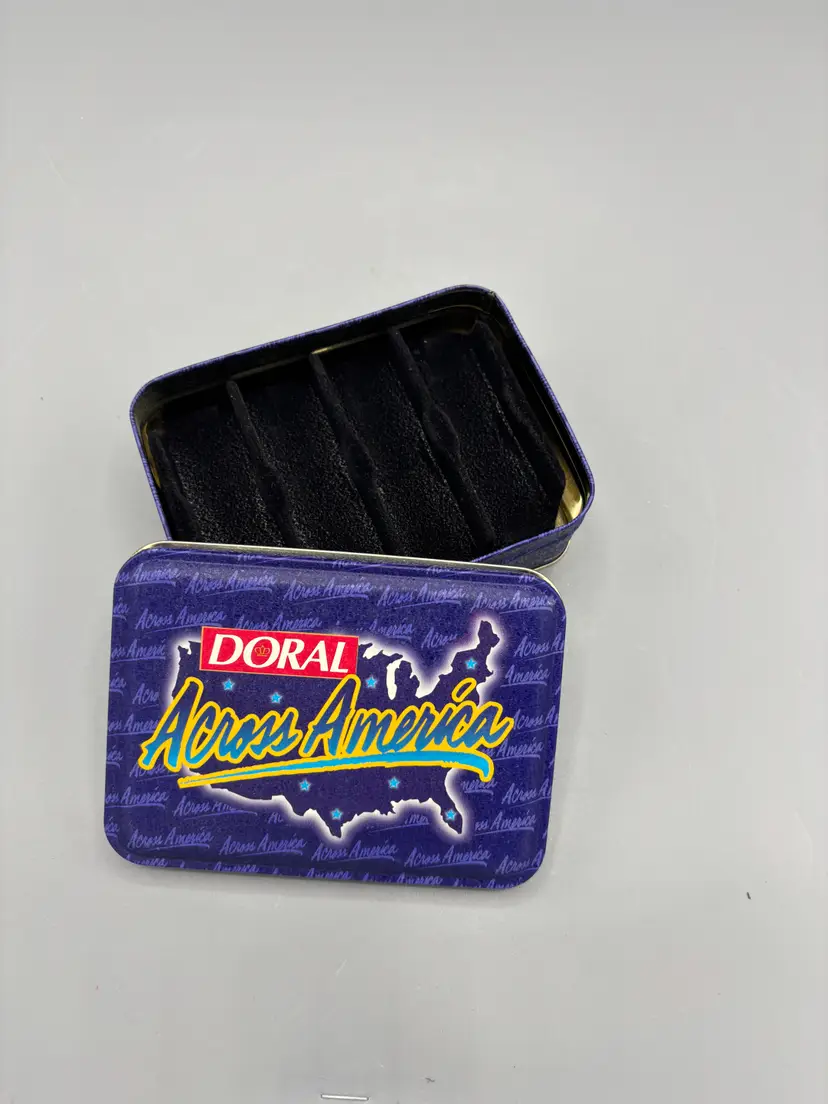 This classic Doral promotional tin showcases mid-century advertising design, measuring 5 5/8 by 4 inches. A collectible piece that captures the aesthetic and marketing style of its era, ideal for vintage enthusiasts and advertising memorabilia collectors seeking authentic period pieces.