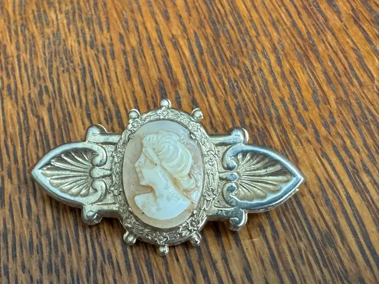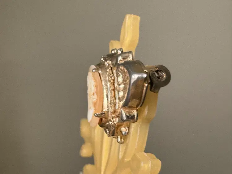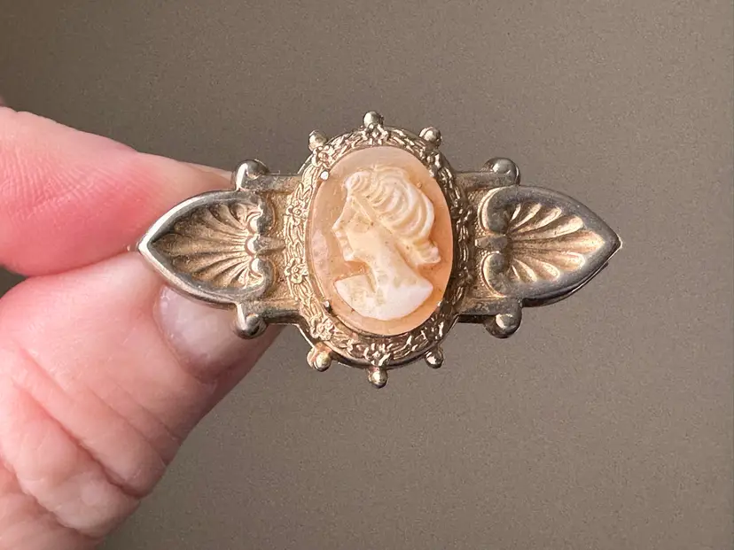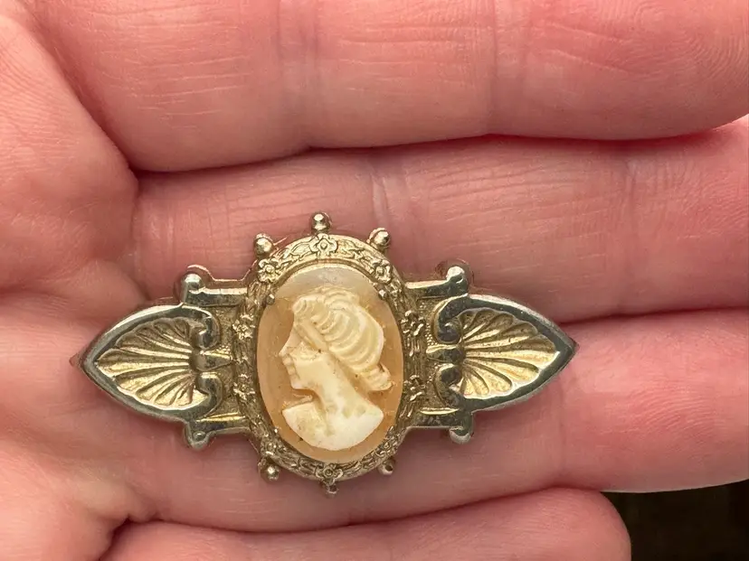 Vintage cameo, brooch pin in gold tone metal, costume jewelry