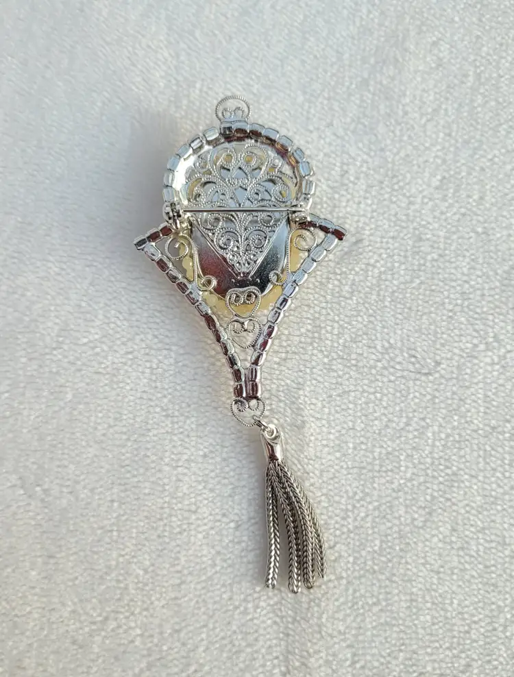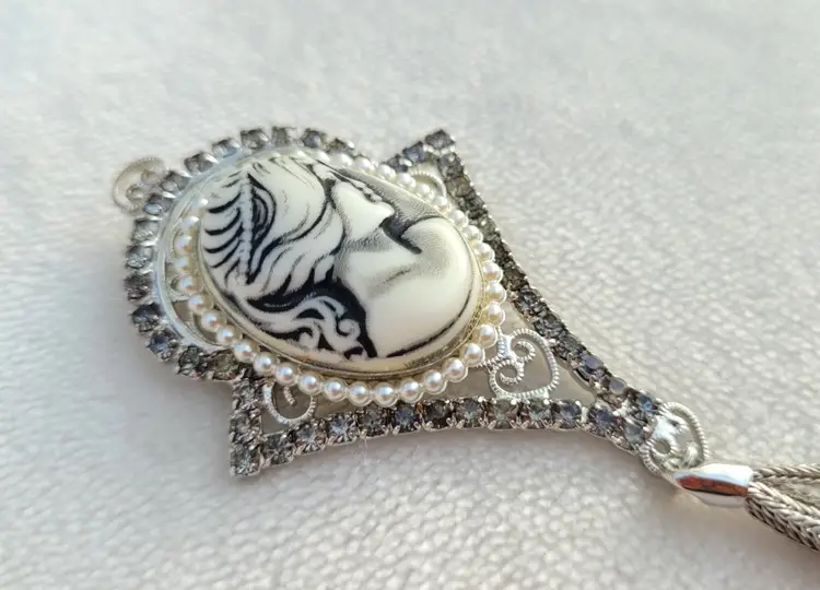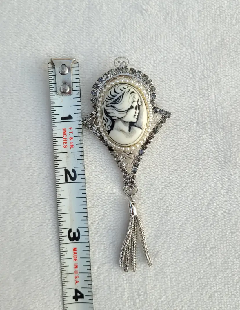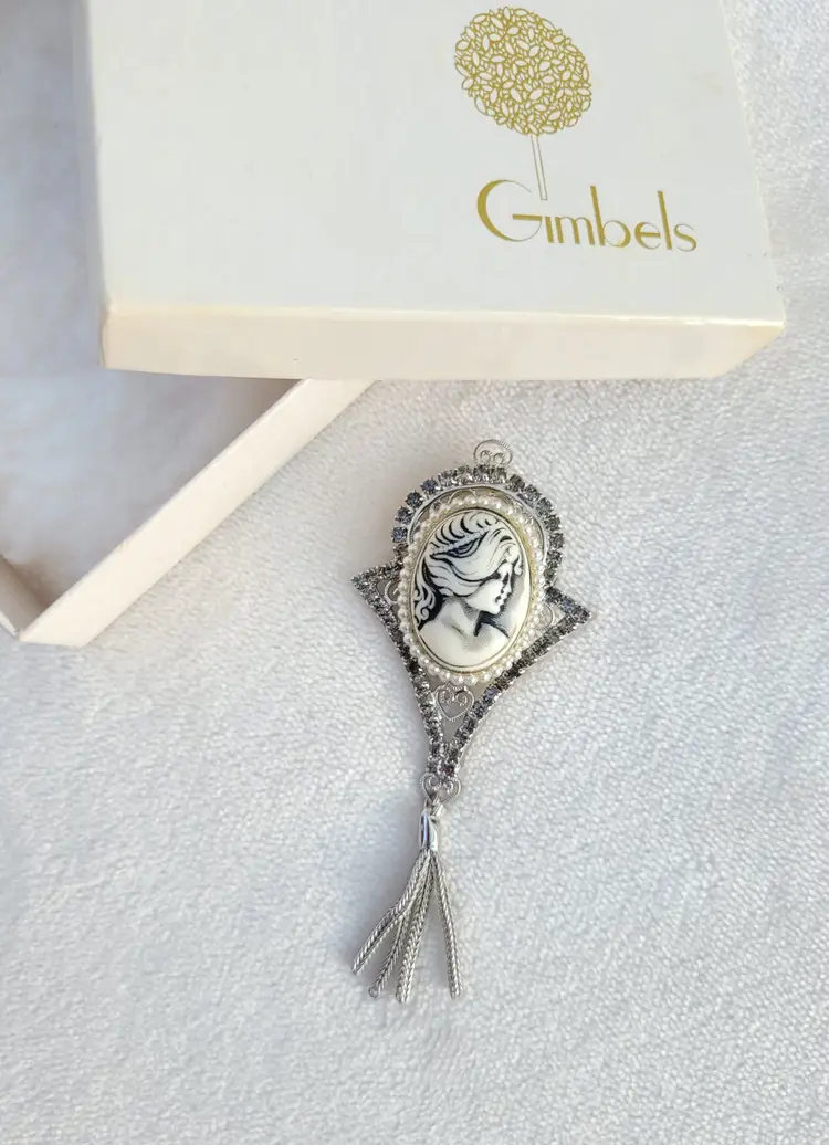 Elegant 1970s-does-1870s resin cameo brooch with sparkling grey rhinestones and little faux seed pearls. It comes in the original Gimbel's box. It's in good condition, please see pictures for details and measurements.