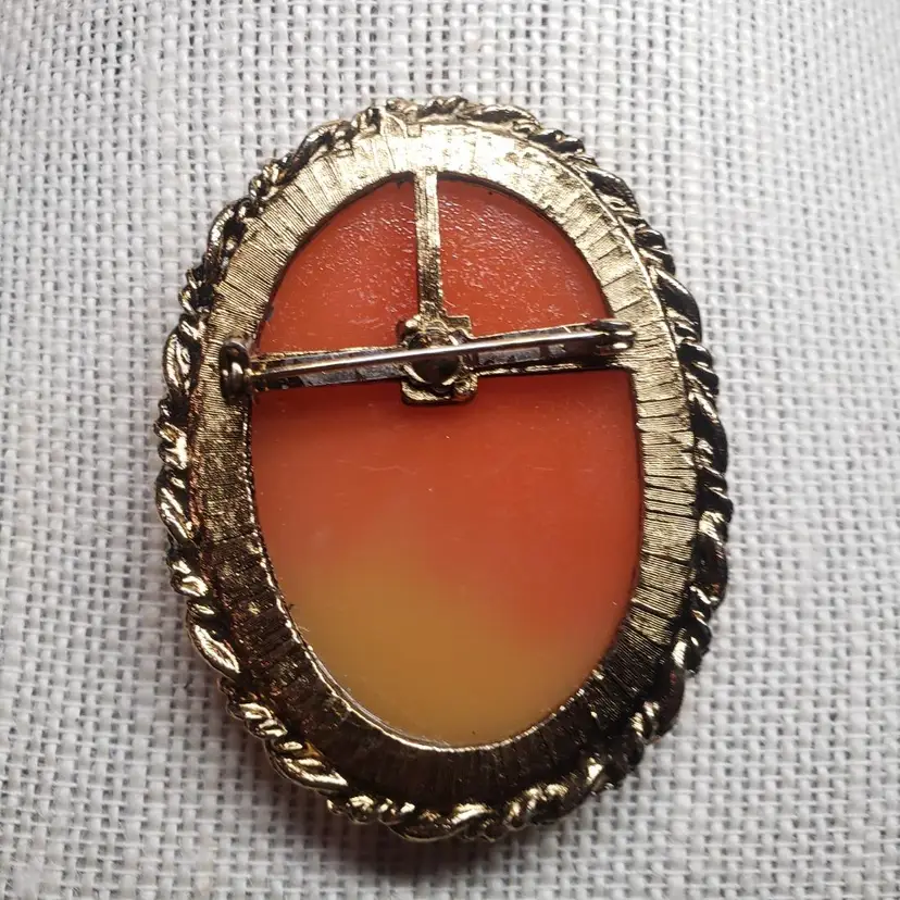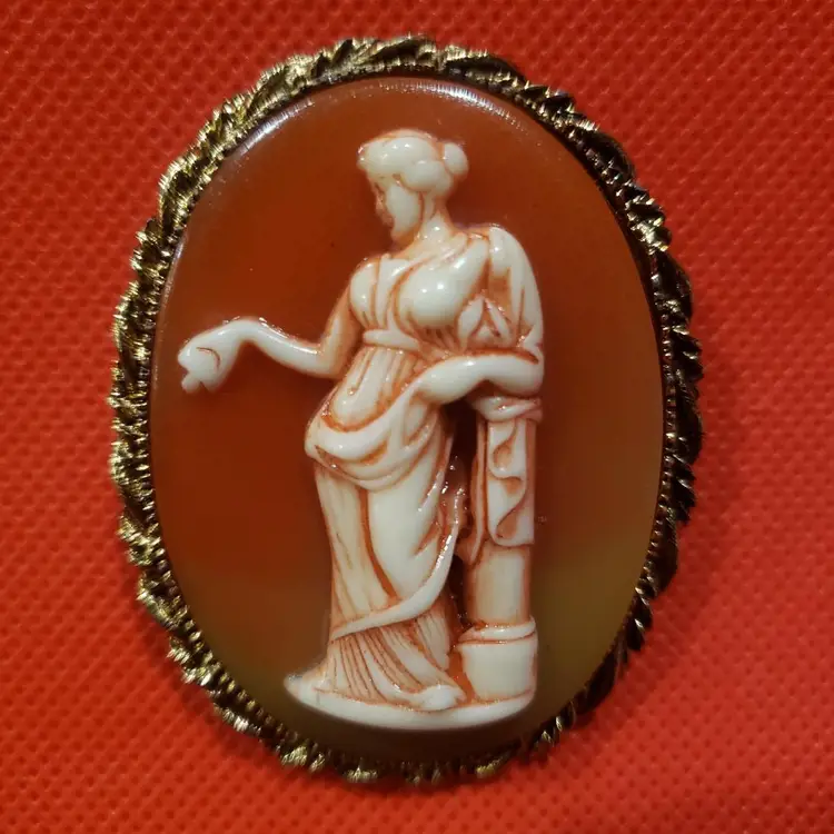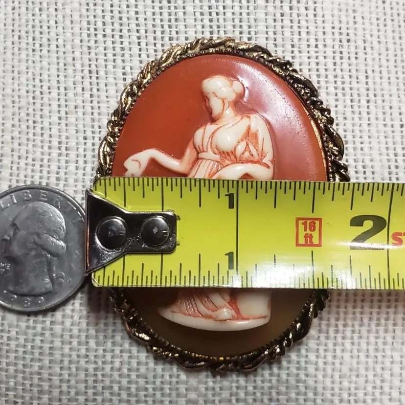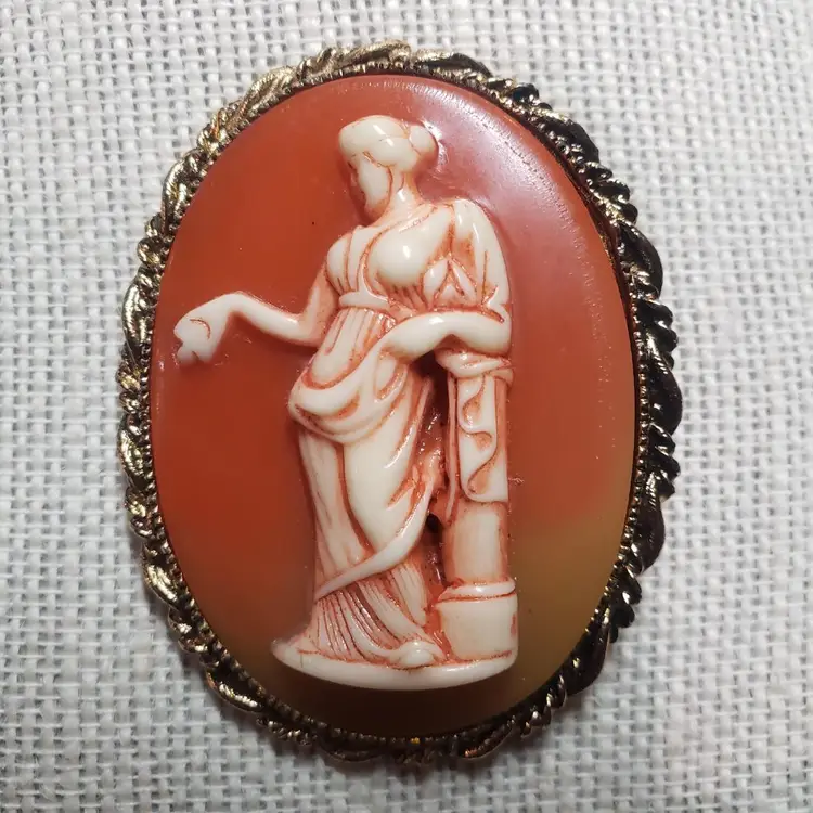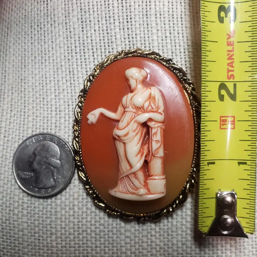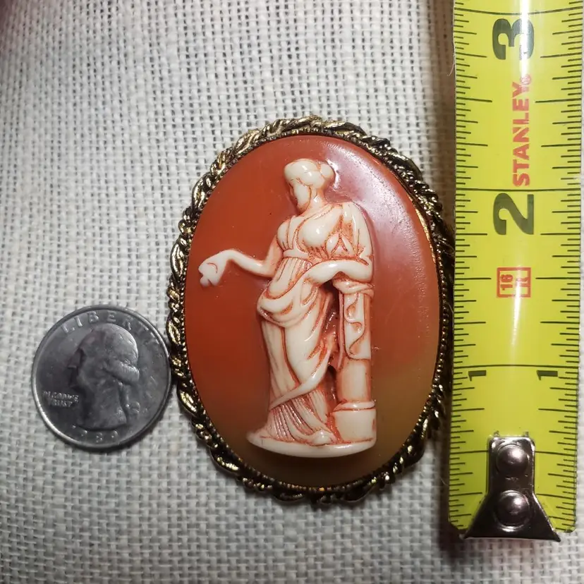 Pretty Vintage Cameo Figural Grecian Lady in Antique Gold Tone Setting. Straight Pin, Costume Jewelry. Resin Cameo Amberina two color background. Shows minor age-related wear. No damage. Rhiannon's Realm Via Irene's Estate