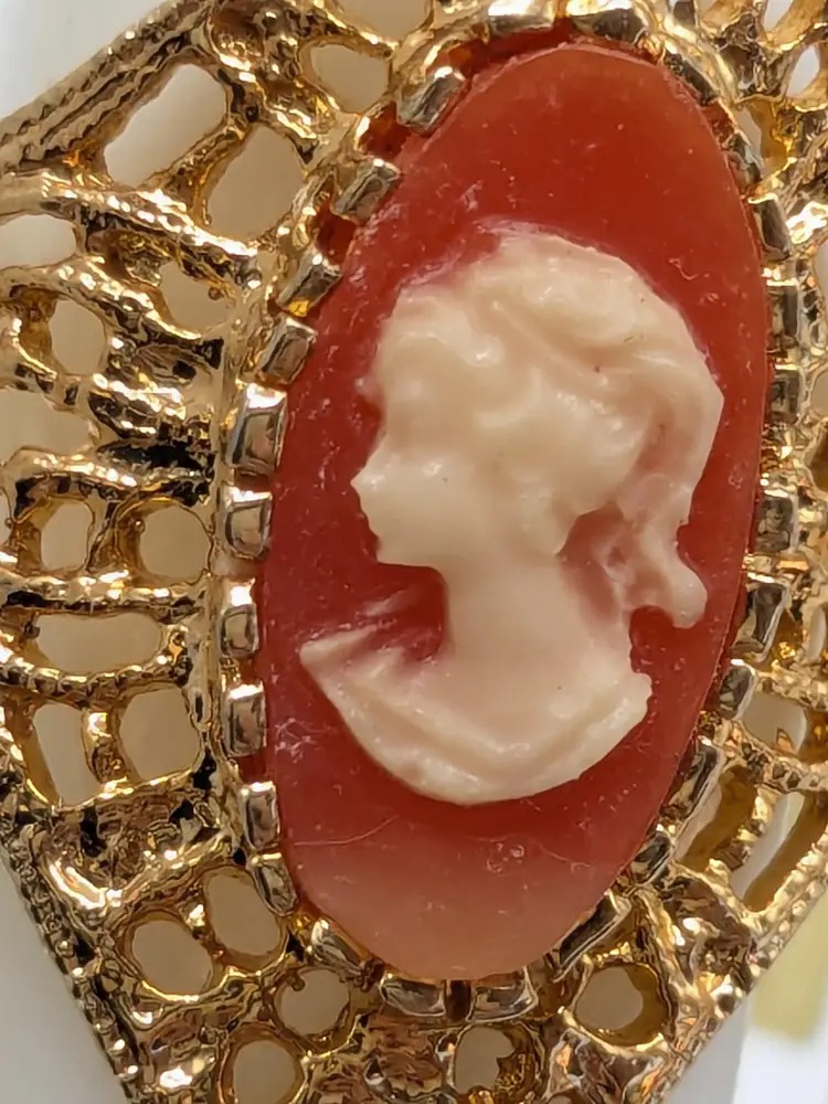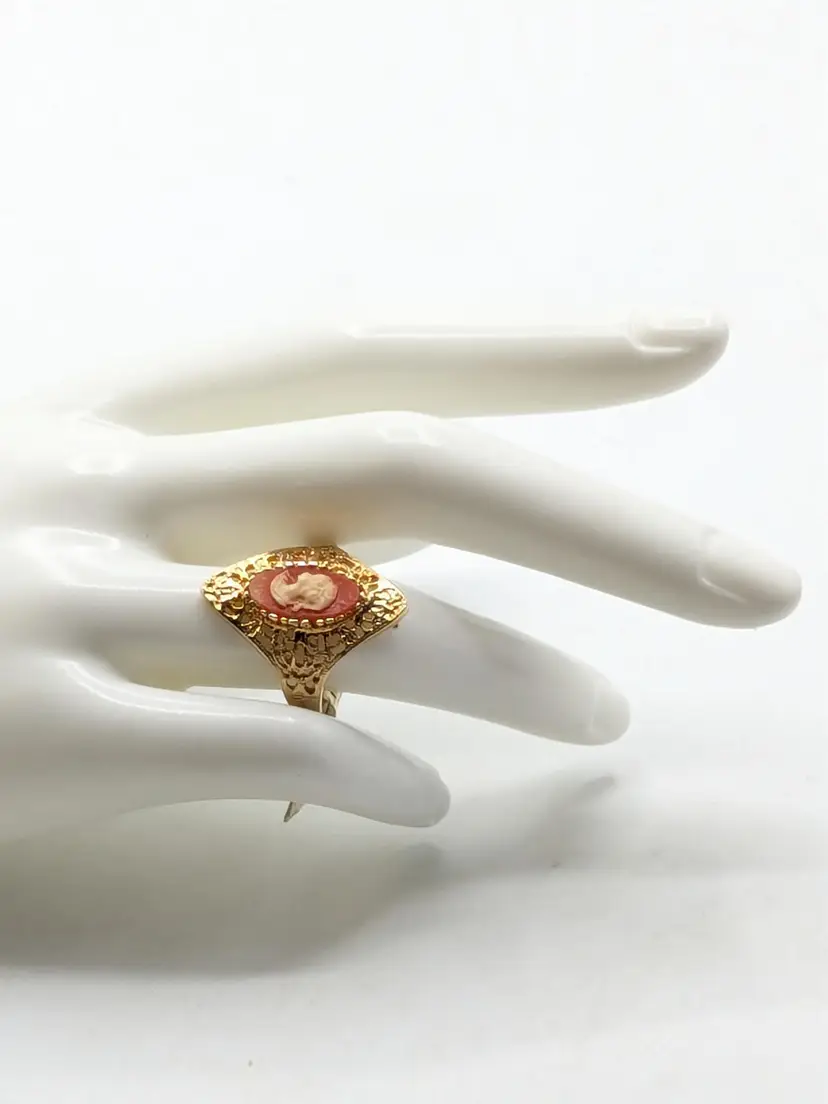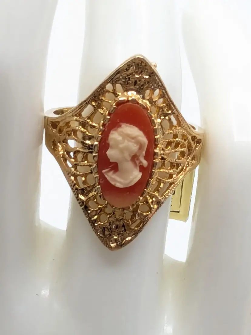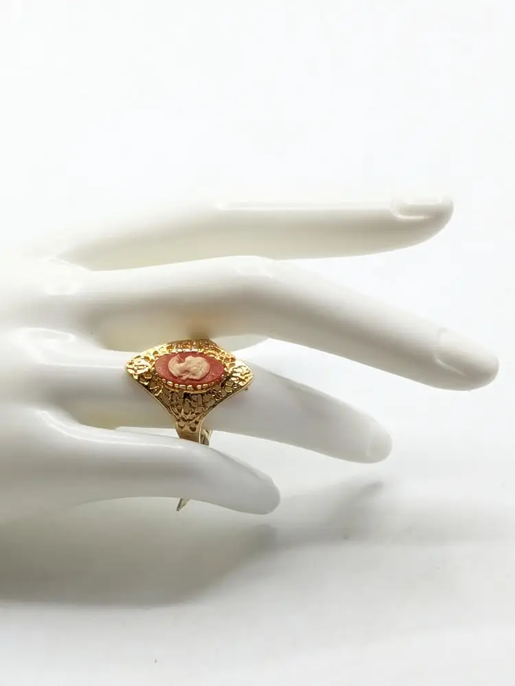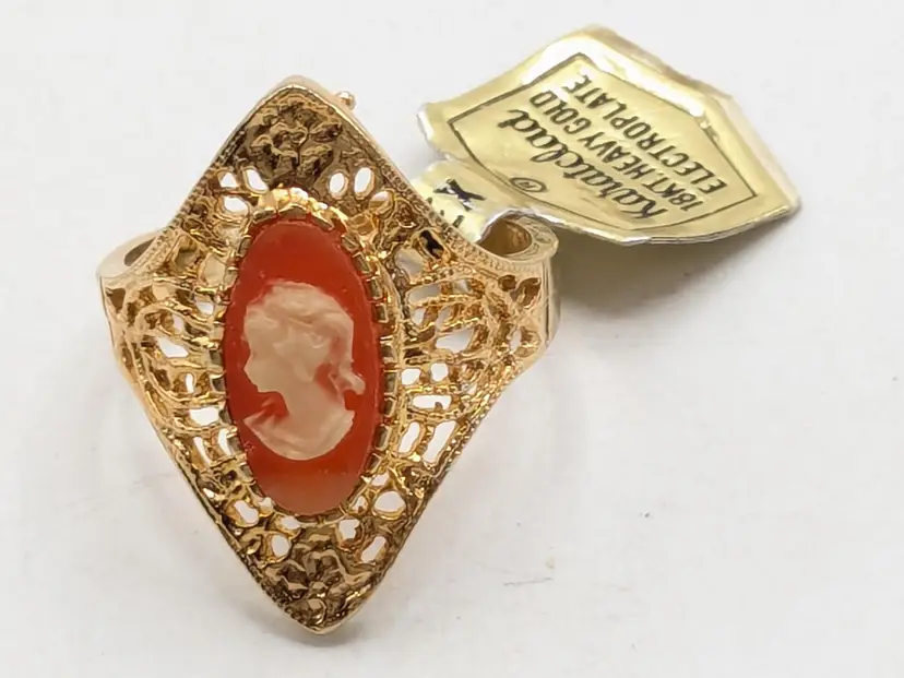 Good condition. New old stock. Features a classic cameo design with an intricate filigree setting. Ring is marked 18KT HGE ESPO. Size 9. (EN1)