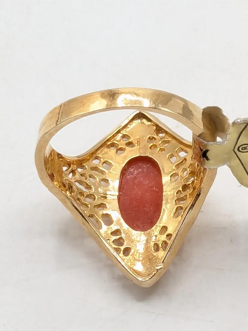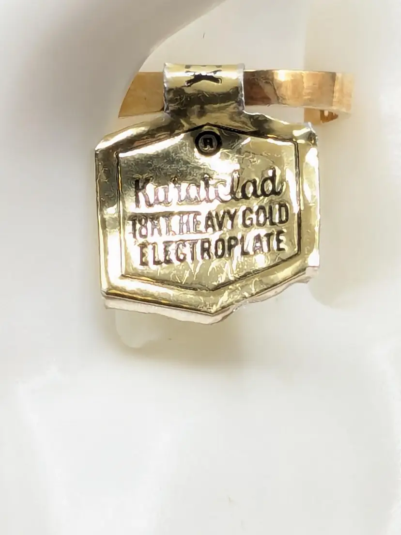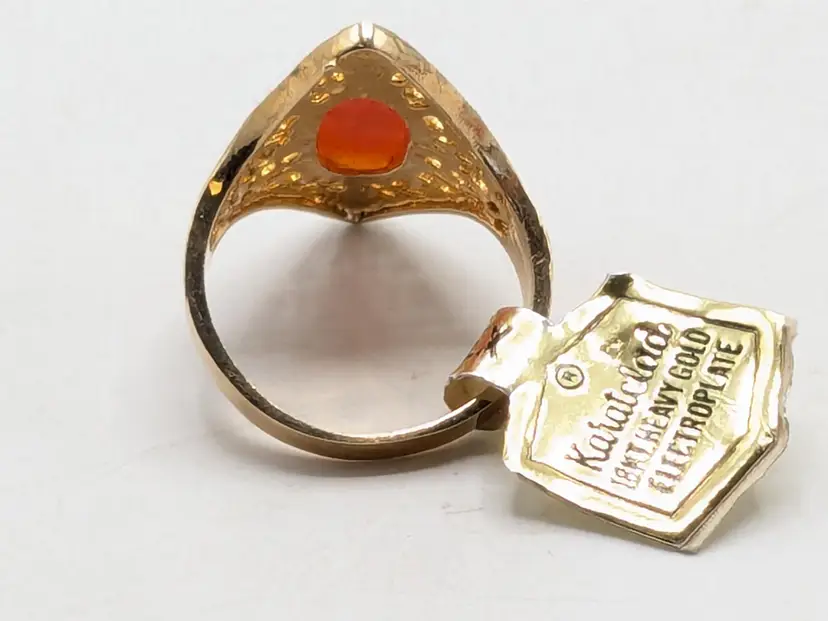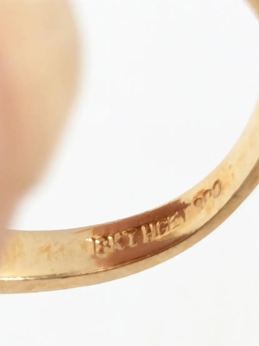 Good condition. New old stock. Features a classic cameo design with an intricate filigree setting. Ring is marked 18KT HGE ESPO. Size 9. (EN1)