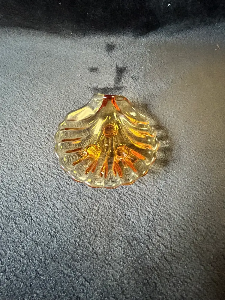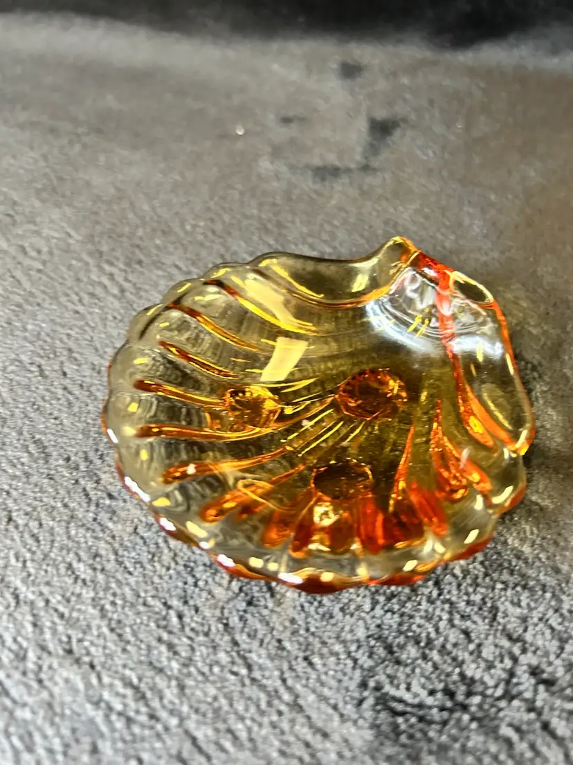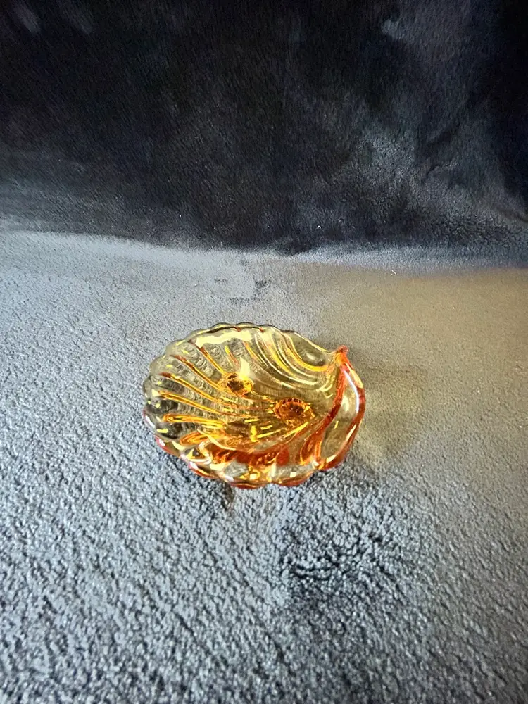 A vintage Cambridge Caprice Topaz footed sea shell dish, measuring 3 inches. It features a design pattern of shells and is themed around seashells. This collectible piece would make a cute decorative and conversation piece