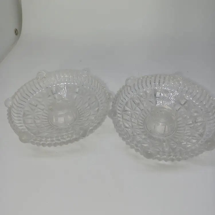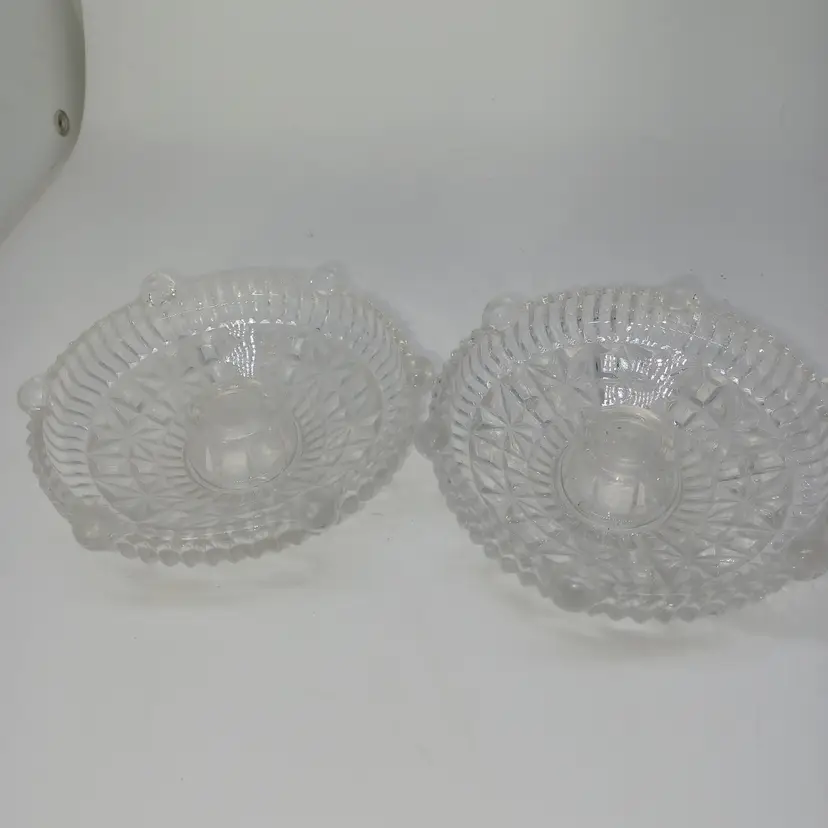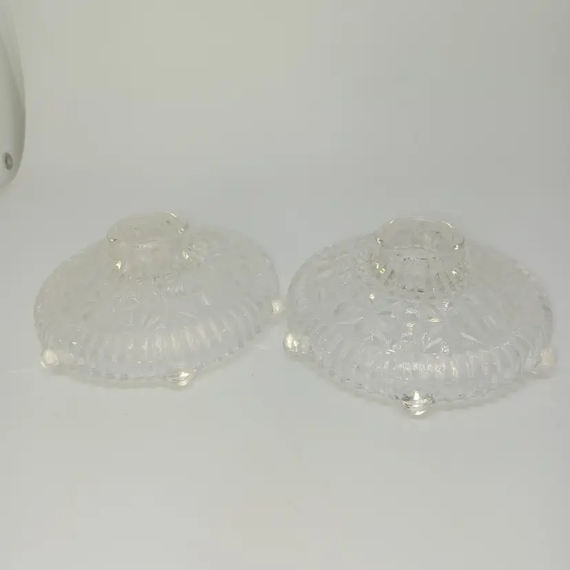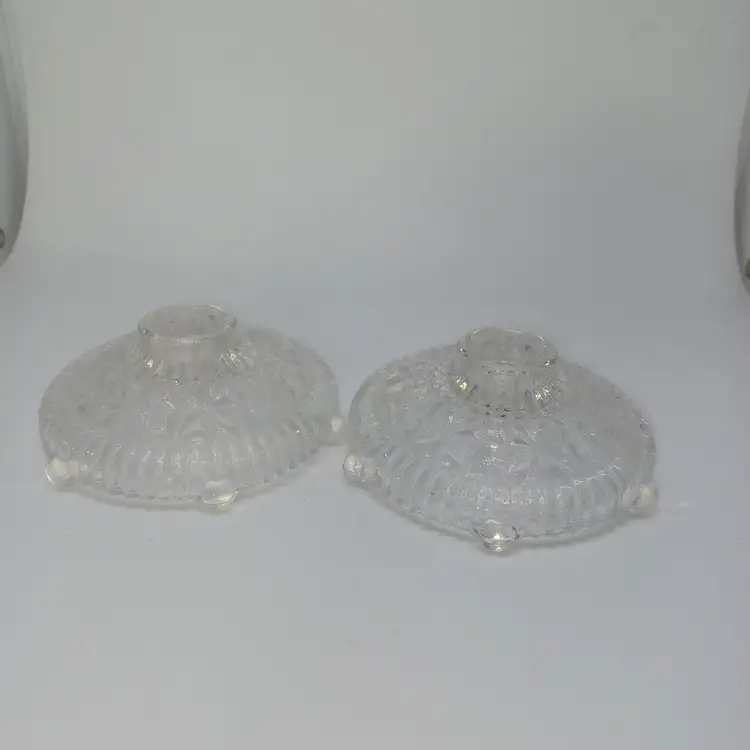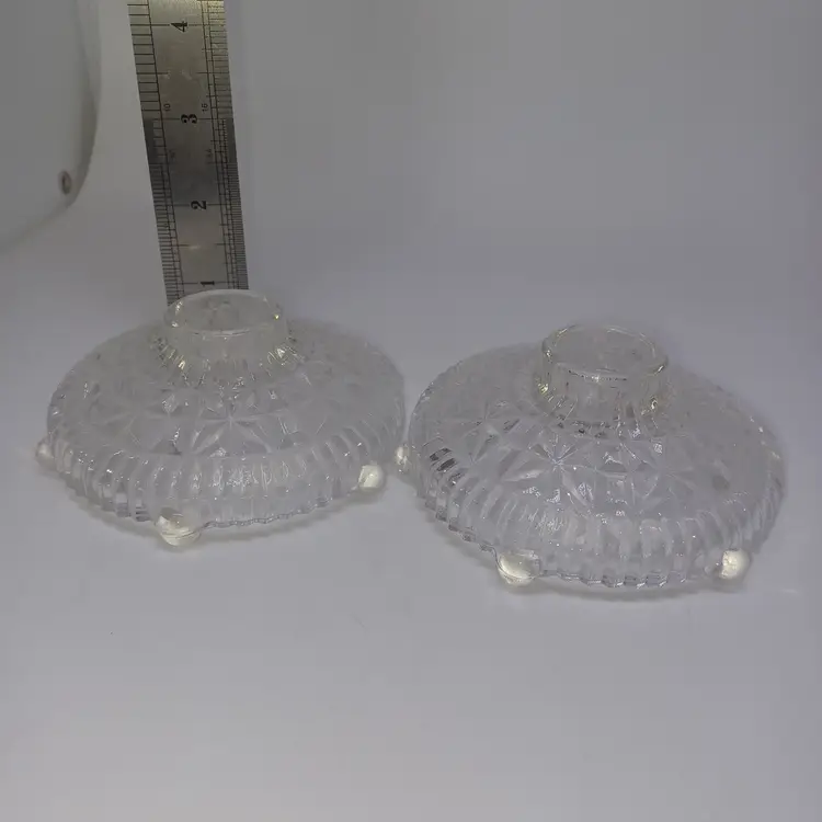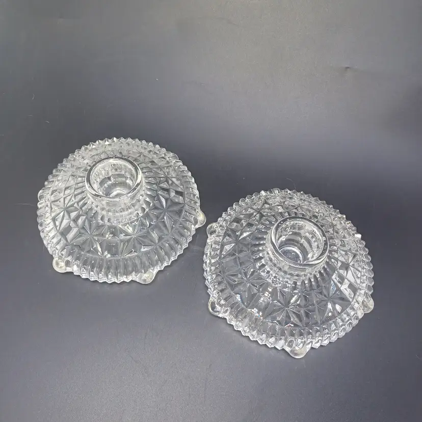 This is a pair of pressed glass Stars And Bars pattern candle holders made by Anchor Hocking, USA in the 1950s. The pattern was made from 1924-1965, and is pattern #1000.