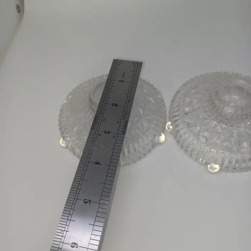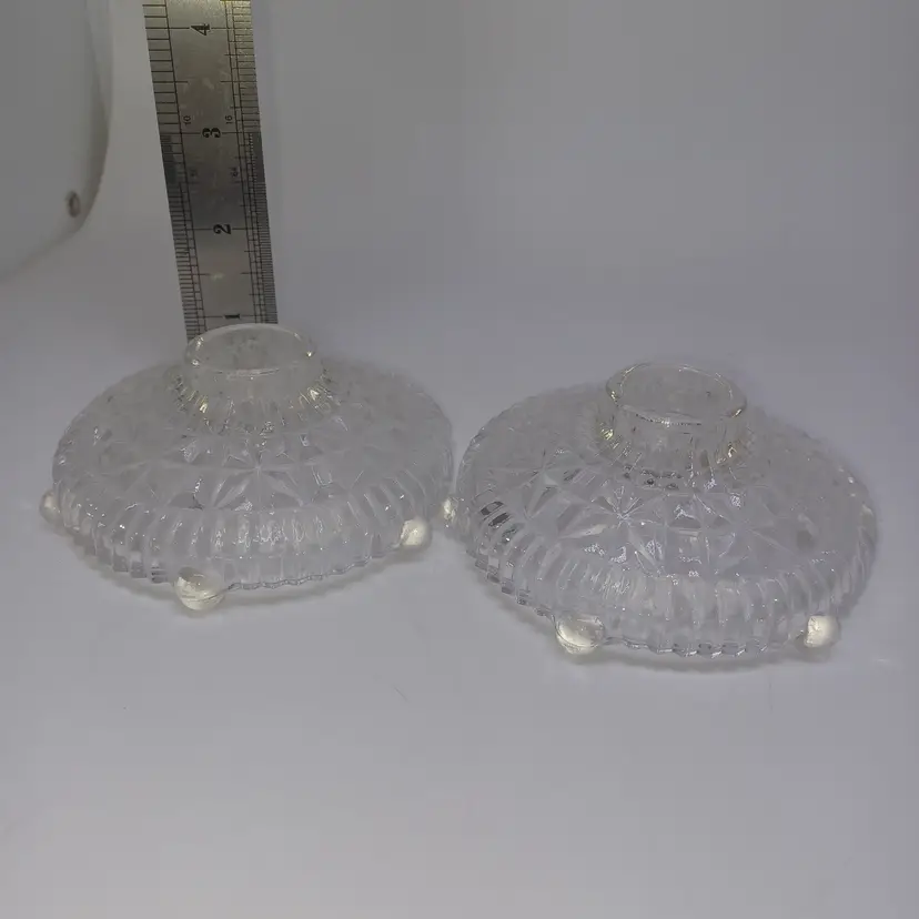 Each candle holder measures 2 inches high and 4 inches in diameter, each stands on 6 ball feet and will take a normal taper candle.