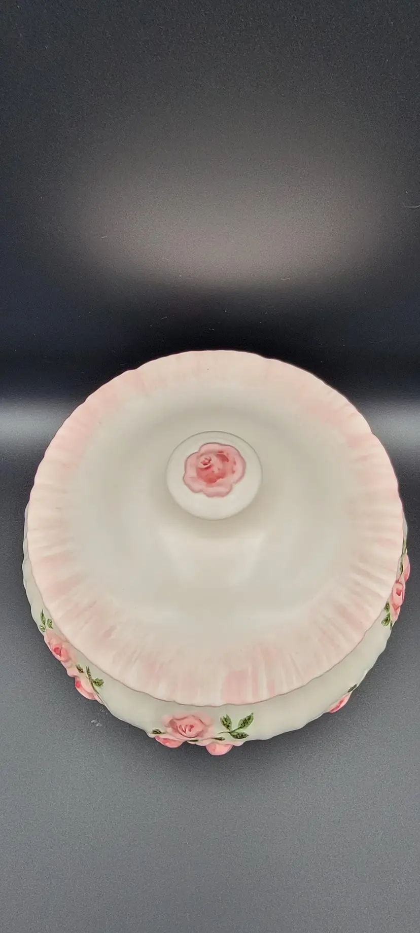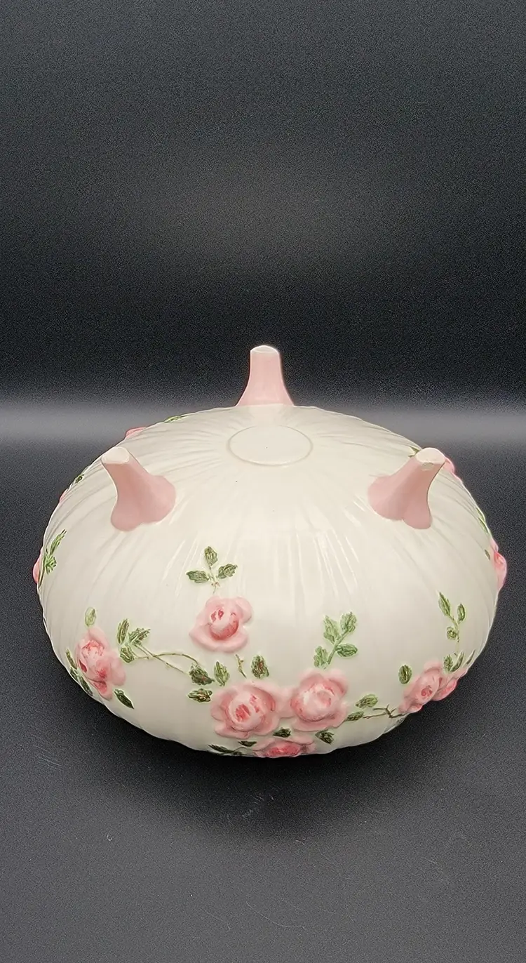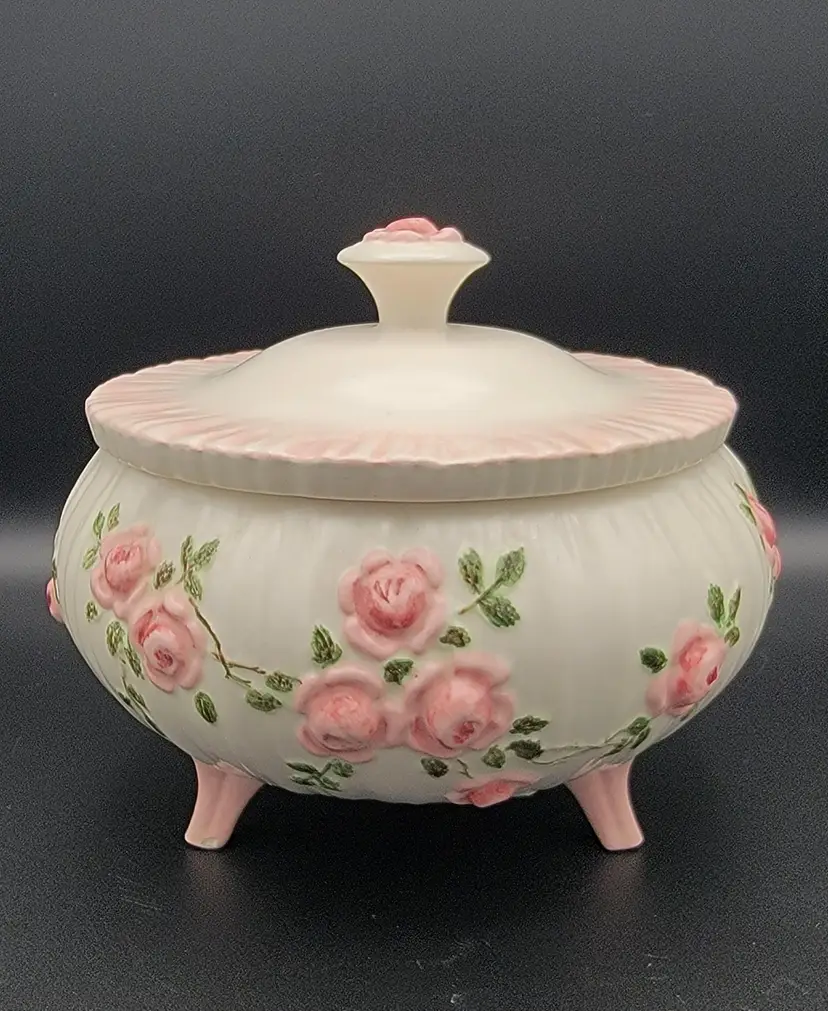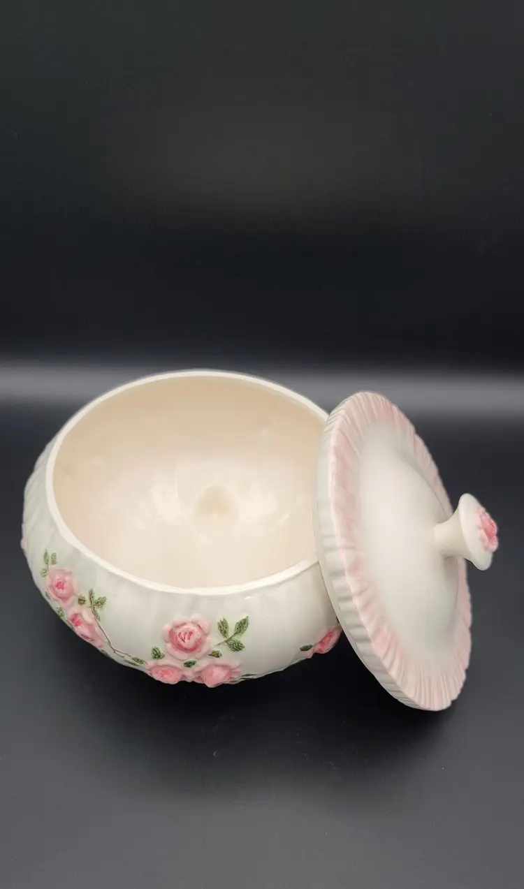 This vintage porcelain footed candy dish with lid is a beautiful addition to any collection. The floral pattern features cream, pink and green colors that give it a spring theme. Measuring 7" in diameter and 6" in height, this round candy dish is perfect for storing your favorite treats. Made in 1970's using art pottery production technique. It is hand-painted. The candy dish also features a lid to keep your treats fresh, and it is handmade with love.